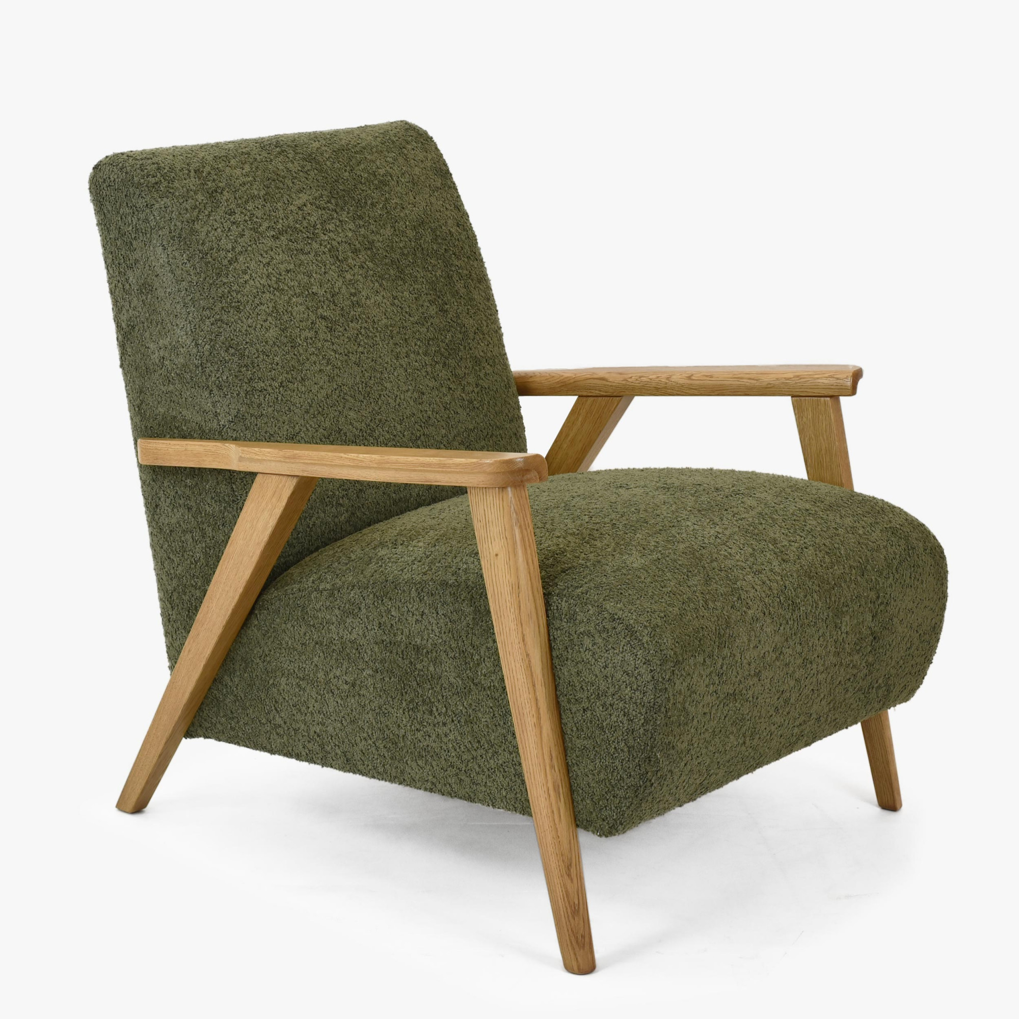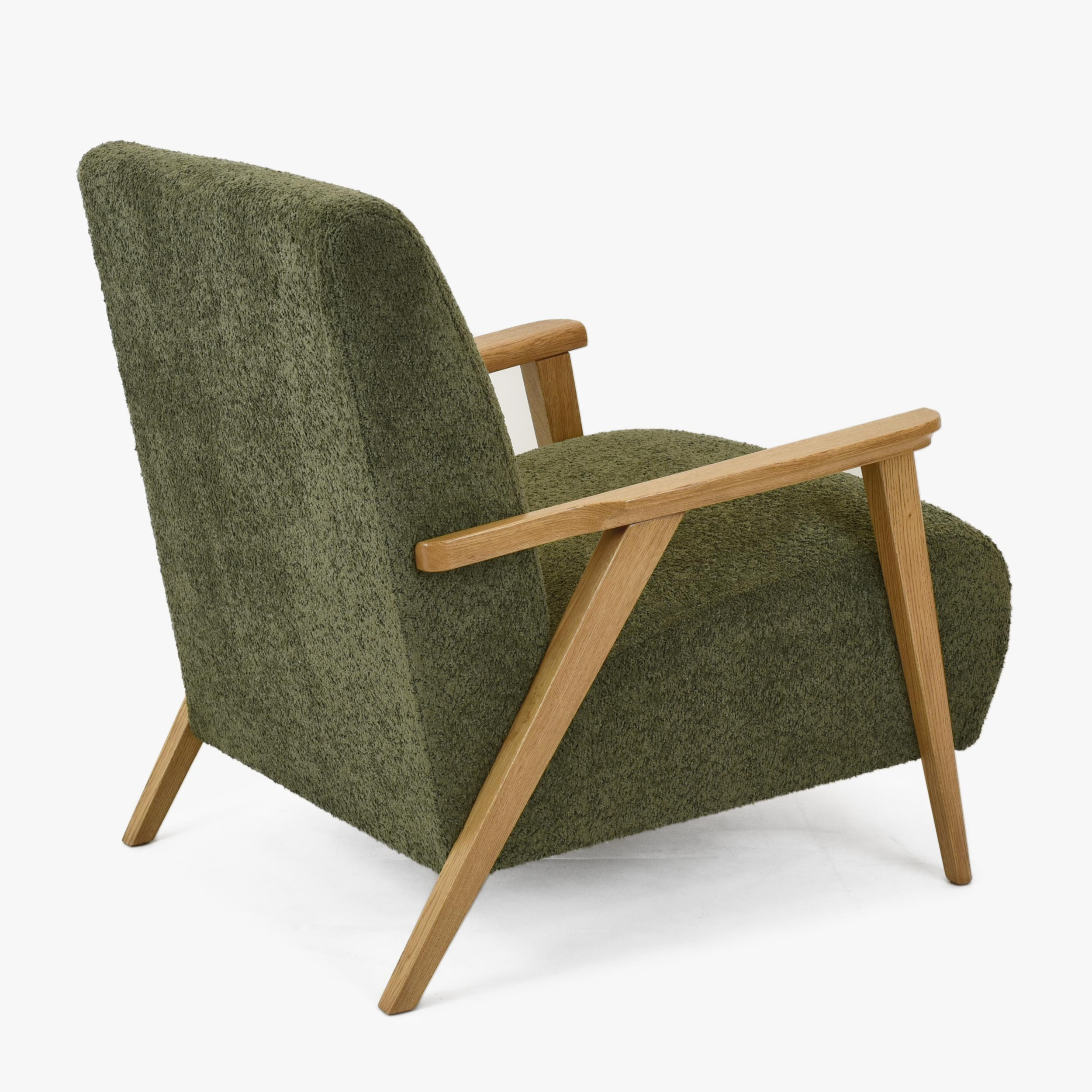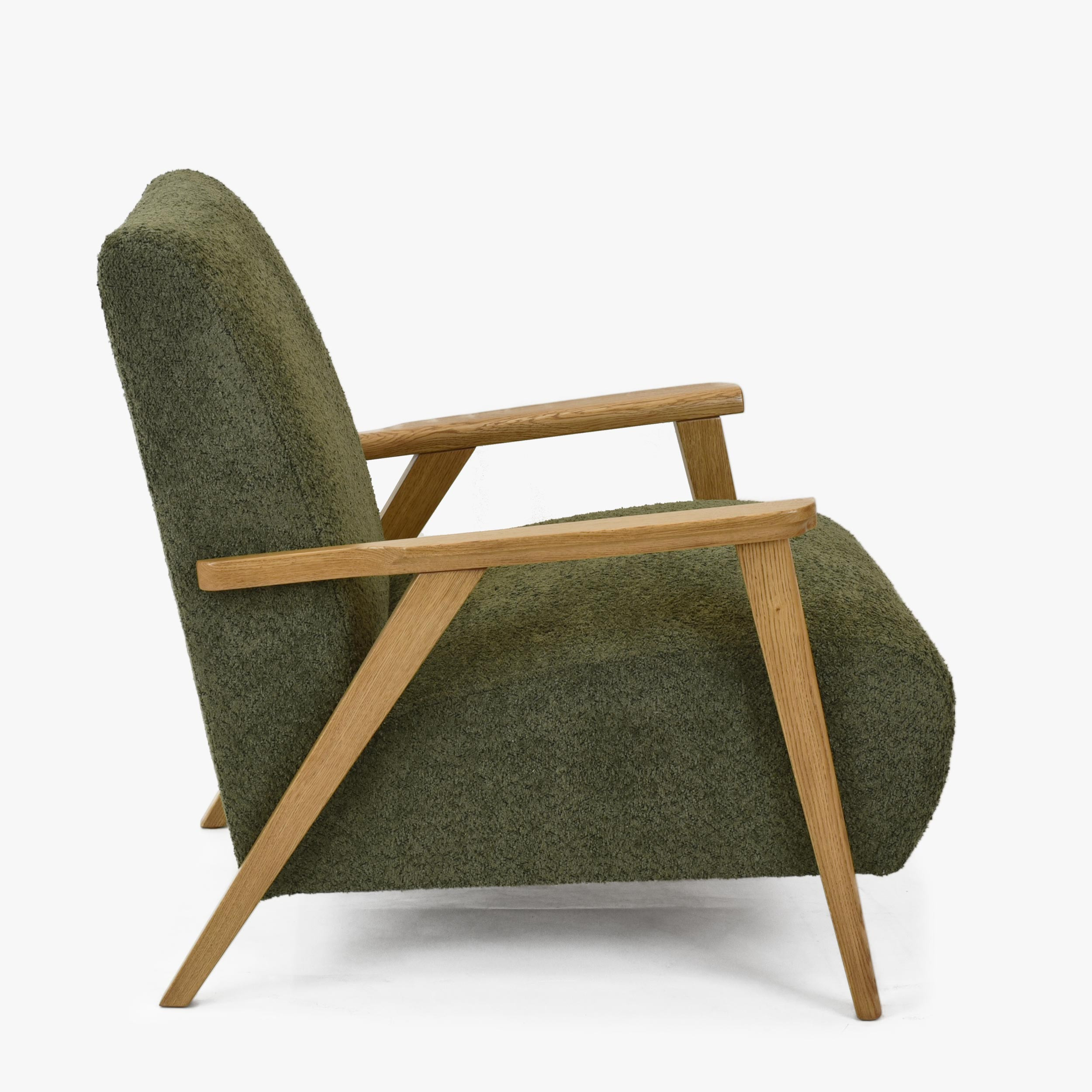 Objavte pohodlie a eleganciu s kreslom s drevenými opierkami v zelenej farbe, ktoré je ideálnym doplnkom do každej obývacej izby. Toto kreslo kombinuje retro štýl s moderným komfortom, prinášajúci nielen estetické, ale aj praktické výhody do vášho domova. Vďaka použitiu kvalitného dubového dreva pre opierky a nohy, ošetrených matným lakom v odtieni dub natural, je tento kus nábytku nielen odolný, ale tiež ľahko kombinovateľný s ďalšími dubovými výrobkami z našej ponuky.
