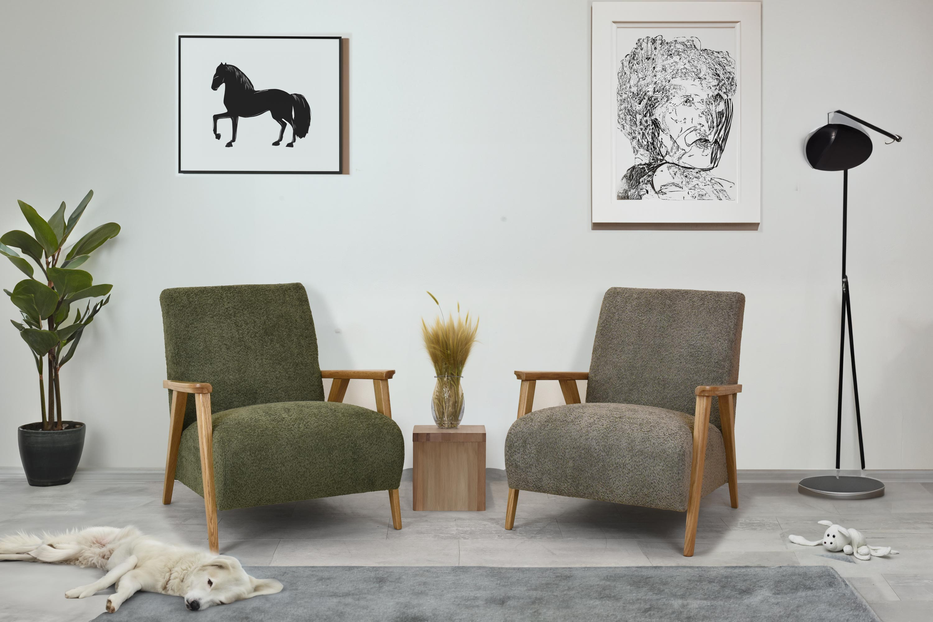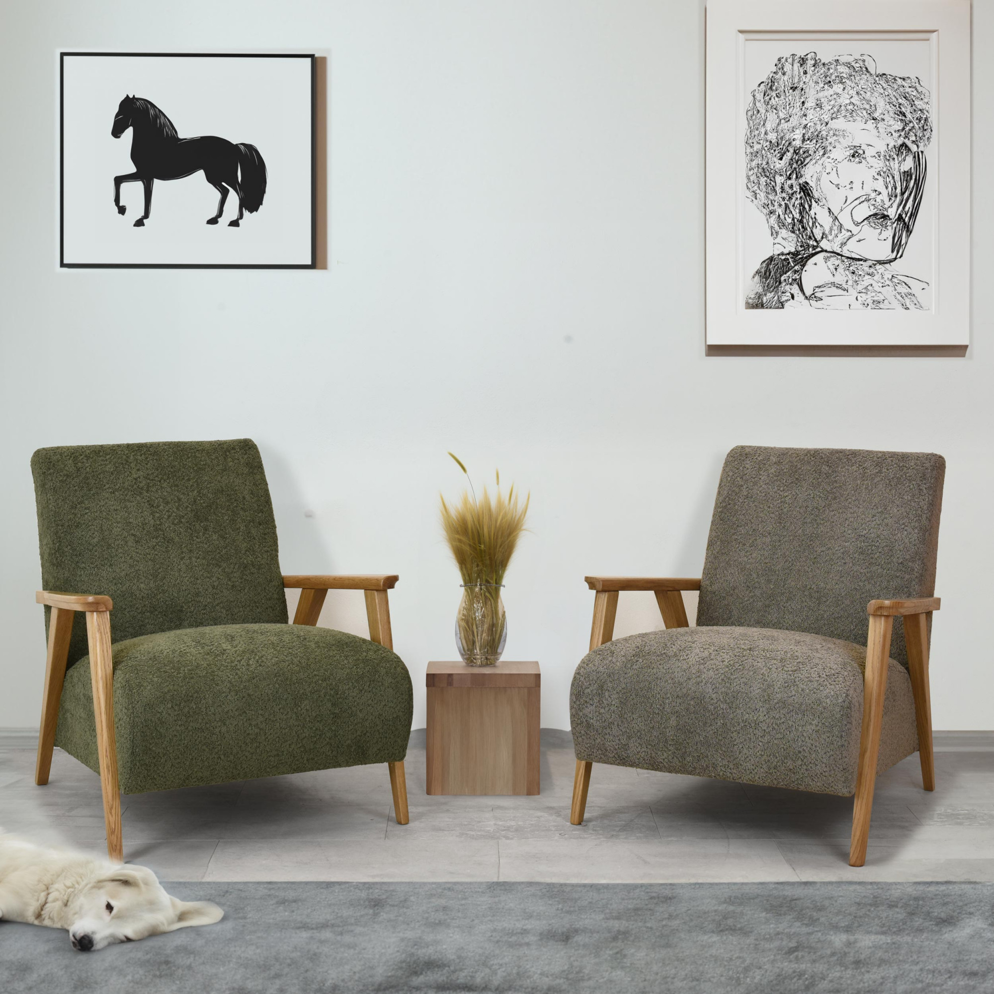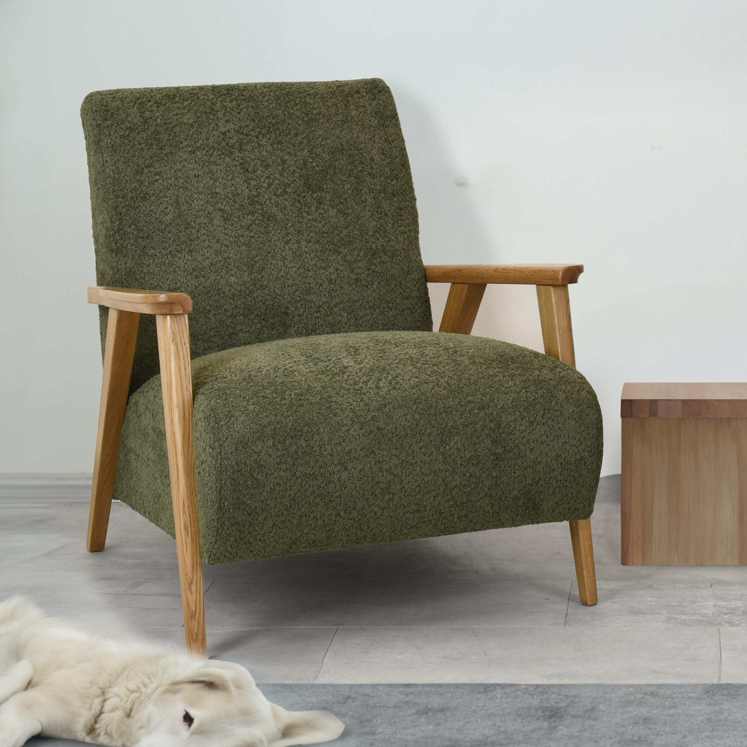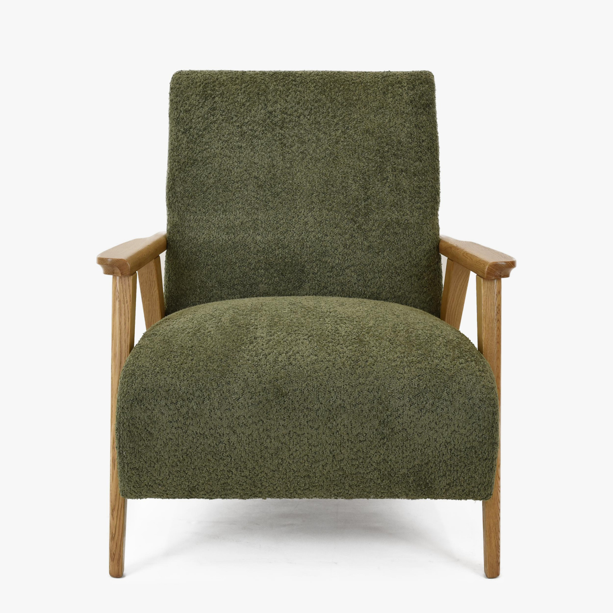 Objavte pohodlie a eleganciu s kreslom s drevenými opierkami v zelenej farbe, ktoré je ideálnym doplnkom do každej obývacej izby. Toto kreslo kombinuje retro štýl s moderným komfortom, prinášajúci nielen estetické, ale aj praktické výhody do vášho domova. Vďaka použitiu kvalitného dubového dreva pre opierky a nohy, ošetrených matným lakom v odtieni dub natural, je tento kus nábytku nielen odolný, ale tiež ľahko kombinovateľný s ďalšími dubovými výrobkami z našej ponuky.