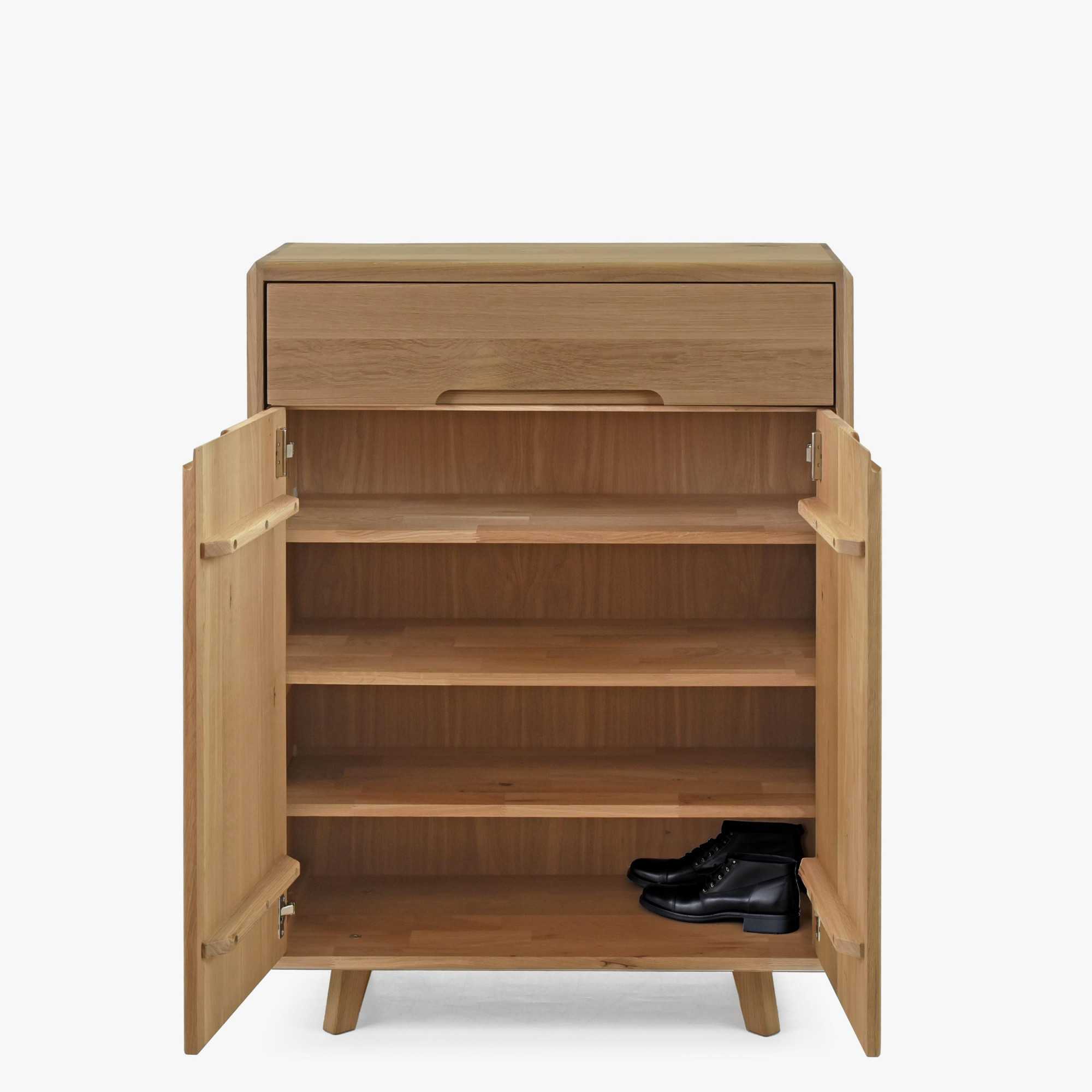 Komoda stojí na nožičkách, ktoré nielen zvyšujú jej estetickú hodnotu, ale tiež uľahčujú upratovanie pod ňou. Dodáva sa už zmontovaná, s výnimkou nožičiek, ktoré sa jednoducho montujú. Vnútorný priestor botníka ponúka dvere so štyrmi poličkami, čo poskytuje dostatok miesta na usporiadanie topánok. Pre uskladnenie mokrých topánok odporúčame použiť podložku, aby sa zachovala kvalita dreva. V hornej časti botníka je navyše veľká zásuvka na uloženie drobností alebo starostlivosti o obuv.