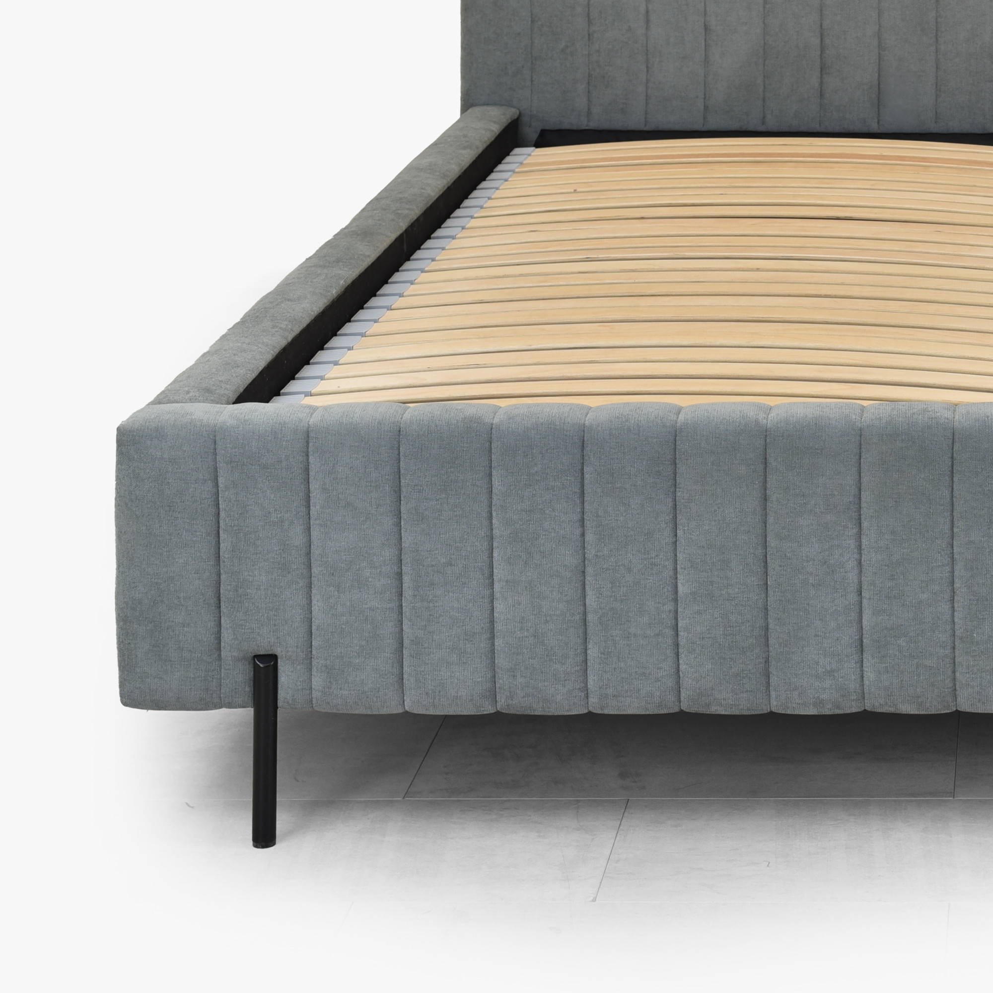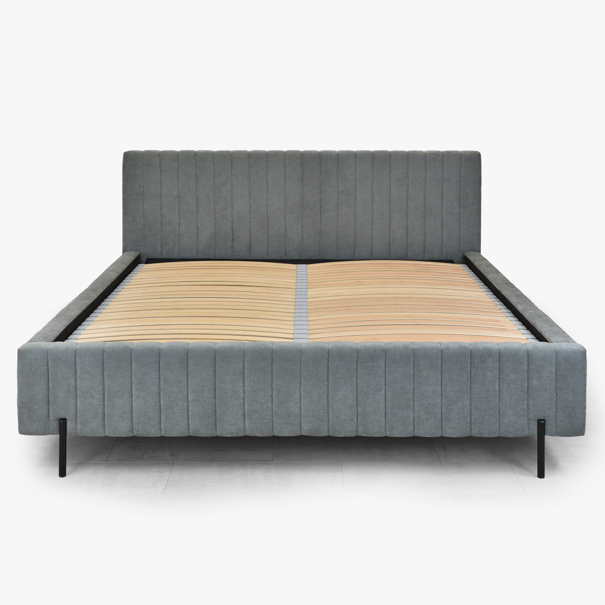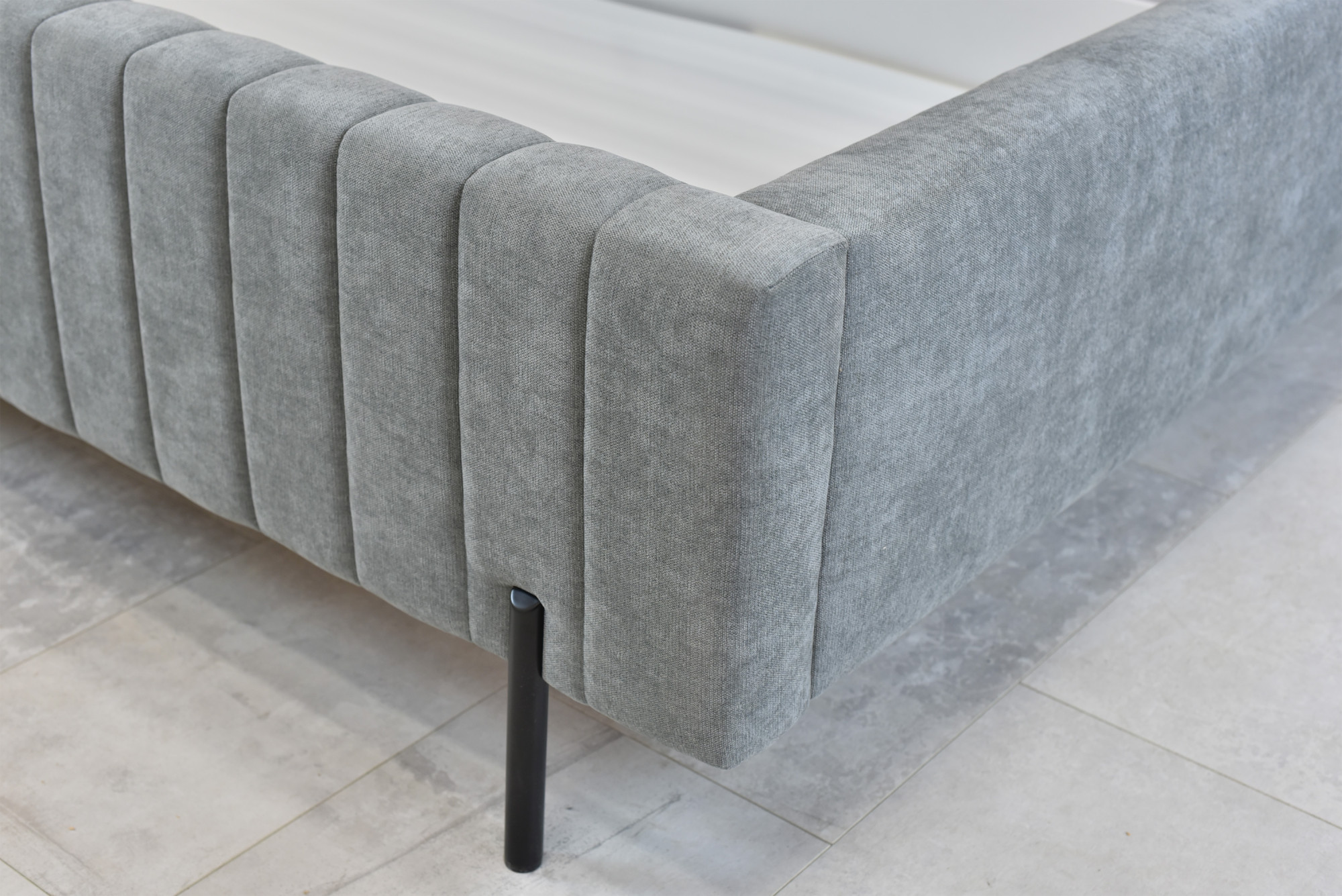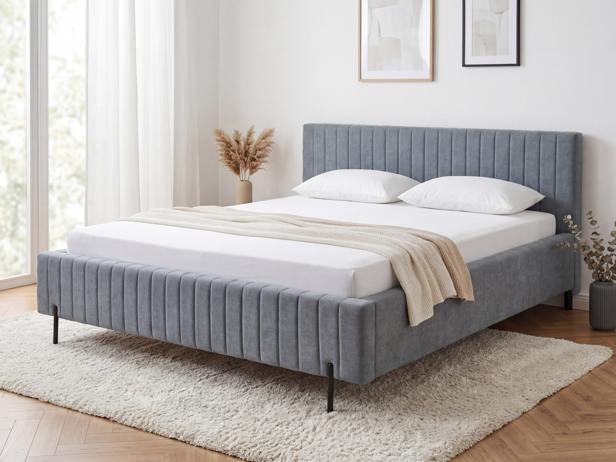 Nosná konštrukcia postele je vyrobená z kombinácie dreva a drevotrieskovej dosky, čo zaručuje stabilitu a dlhú životnosť. Štíhle kovové nožičky v čiernej farbe dodávajú posteli vzdušný vzhľad a opticky odľahčujú celý dizajn. Látka Velvet Wind 89 je 100% polyester s gramážou 230 g/m² a odolnosťou v Martindale teste 30 000–40 000 cyklov, vďaka čomu si zachováva bezchybný vzhľad aj pri bežnom používaní. Odolnosť proti pilingu na stupni 4–5 zabezpečuje, že povrch zostane hladký a bez nežiaducich žmolkov.