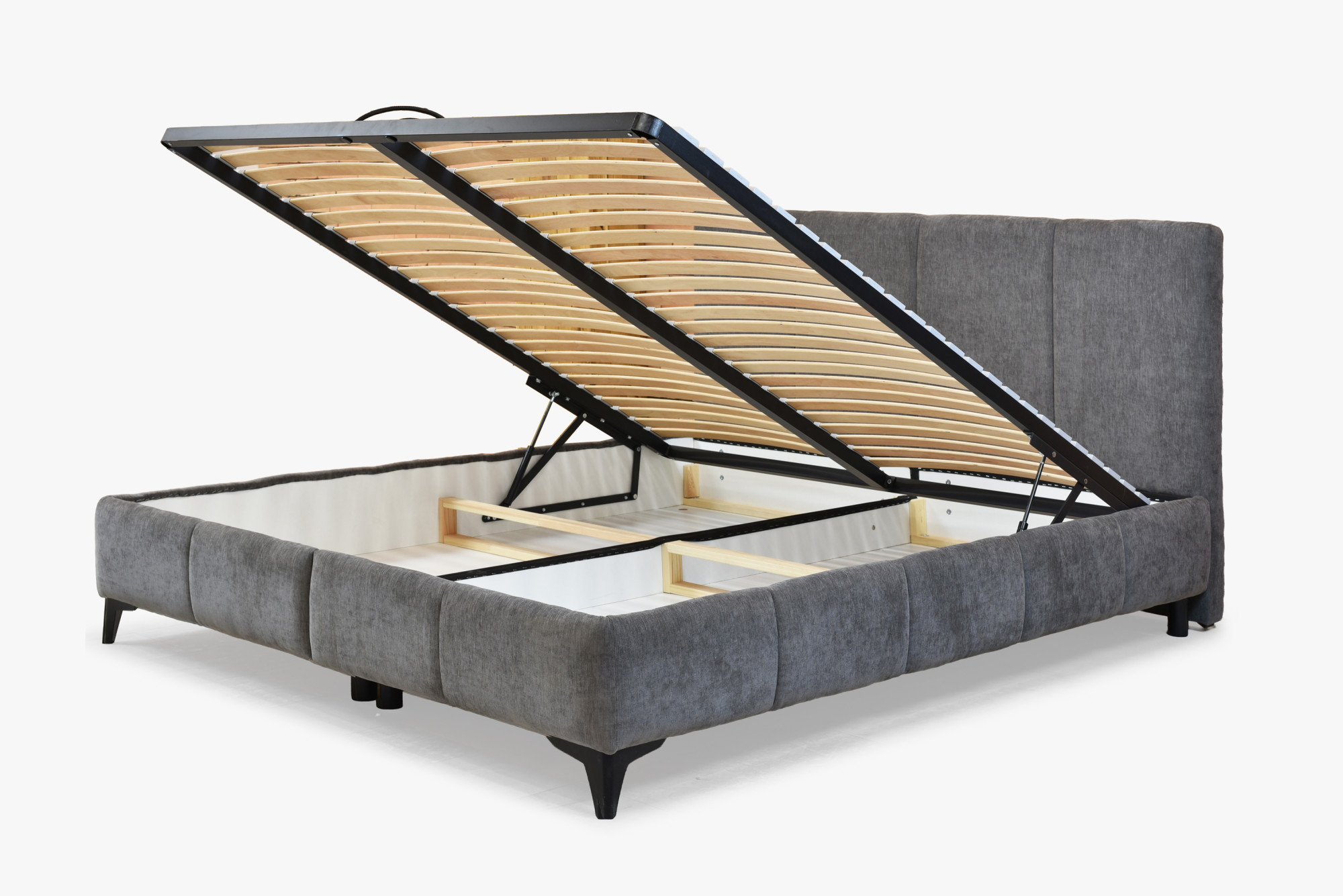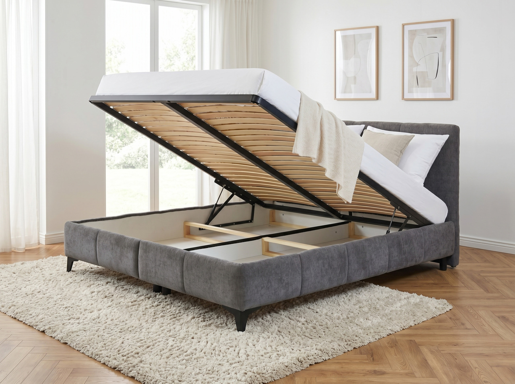 Priestor pod rámom postele je prístupný zo všetkých strán a je vhodný na uloženie lôžkovín, vankúšov alebo sezónneho textilu.