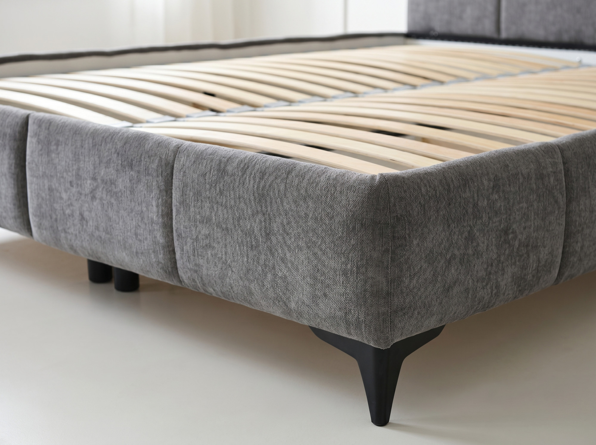 Konštrukcia postele je navrhnutá s dôrazom na každodenné pohodlie aj praktickosť. Súčasťou dodávky je lamelový rošt, takže lôžko je ihneď pripravené na použitie – stačí dokúpiť matrac. Pod rámom sa skrýva priestranný úložný priestor, ideálny na uskladnenie lôžkovín, vankúšov alebo sezónneho textilu. Robustná nosná konštrukcia zabezpečuje stabilitu a dlhú životnosť. Látka Flow 02 (100% polyester, 260 g/m²) dosahuje odolnosť 70 000 otierov Martindale, takže zvládne aj náročnejšie každodenné používanie. Posteľ je dodávaná v demontovanom stave s prehľadným návodom na zloženie.