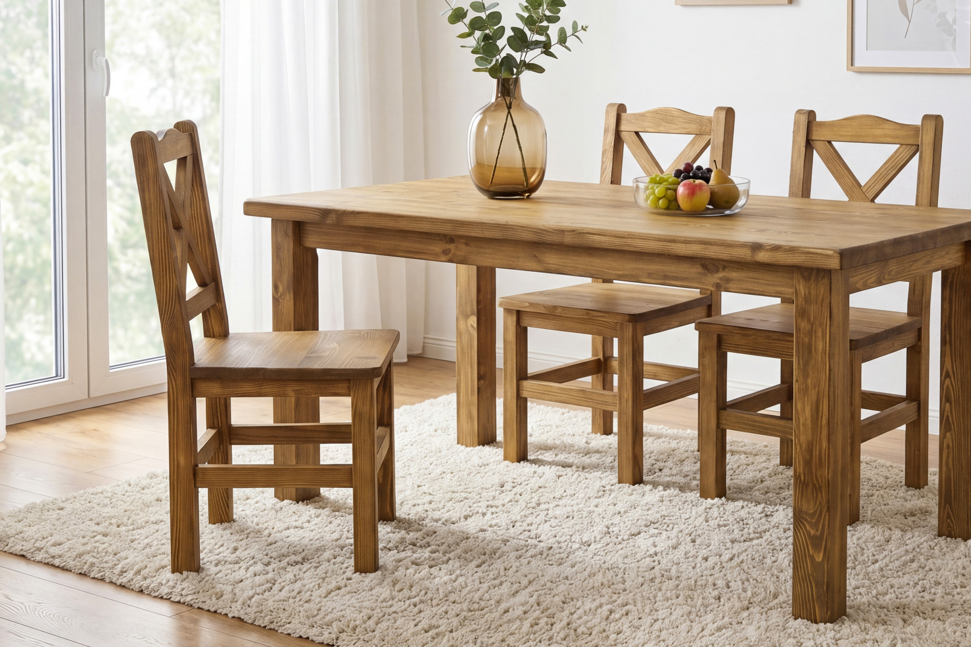 Tento jedálenský set z masívu je skvelou voľbou pre každého, kto hľadá kvalitný selské nábytok do jedálne s dlhou životnosťou a autentickým vzhľadom. Vďaka spojeniu robustného stola, pevných stoličiek, medovo voskovaného povrchu a tradičného rustikálneho dizajnu získate nábytok, ktorý bude pôsobiť elegantne a zároveň útulne. Set sa hodí nielen do rodinných domov a chalúp, ale aj do komerčných interiérov, kde je dôležitá odolnosť a štýl.