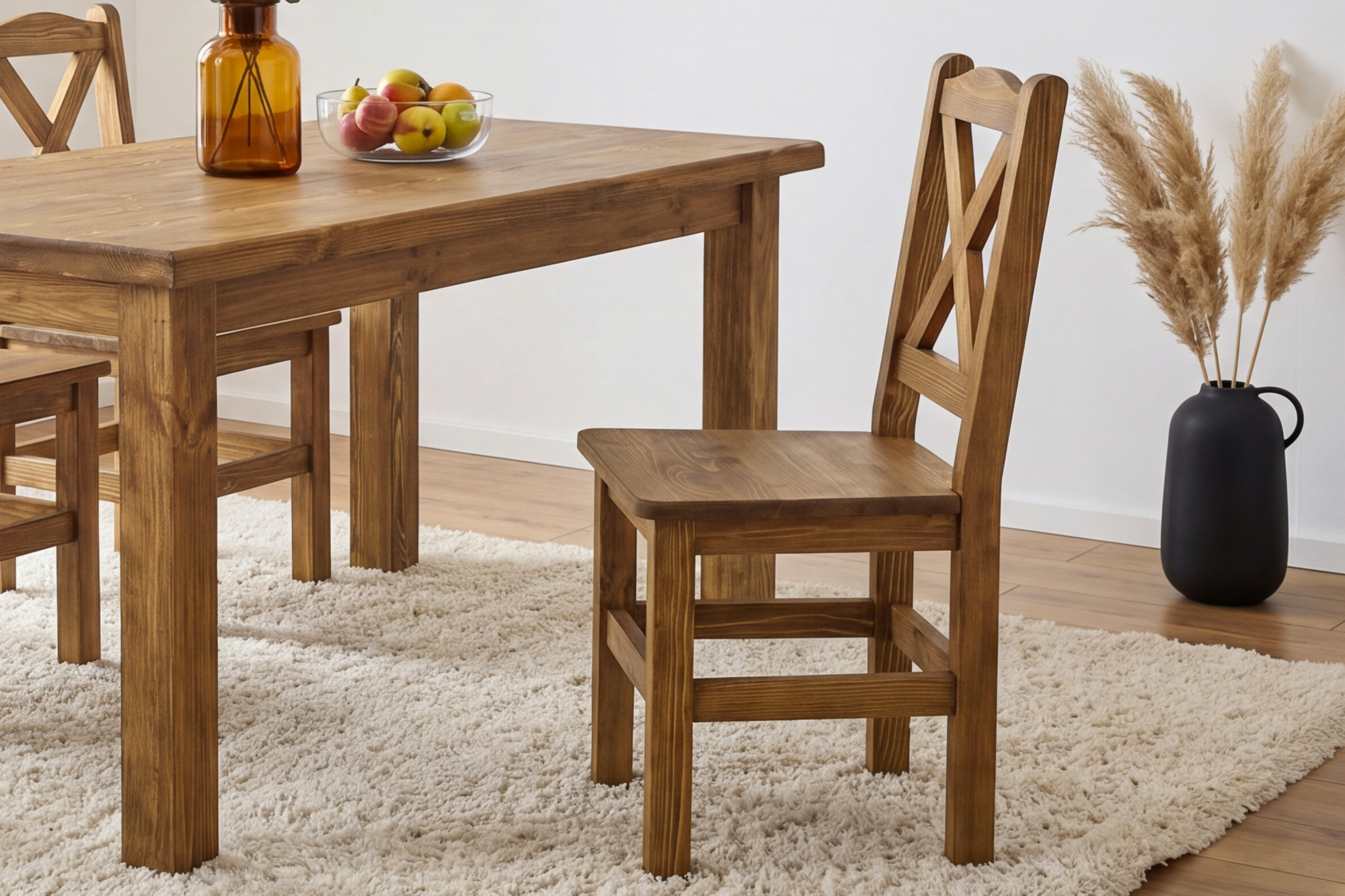 Hľadáte rustikálny jedálenský stôl so stoličkami, ktorý vniesie do interiéru teplo domova, poctivé remeslo a nadčasový vidiecky štýl? Tento jedálenský set zo série Venkov predstavuje ideálnu voľbu do tradične zariadenej jedálne, kuchyne aj štýlovej chalupy. Sústava sa skladá z masívneho jedálenského stola a rustikálnych jedálenských stoličiek, ktoré spoločne vytvárajú harmonický celok inšpirovaný poctivým selské nábytkom.