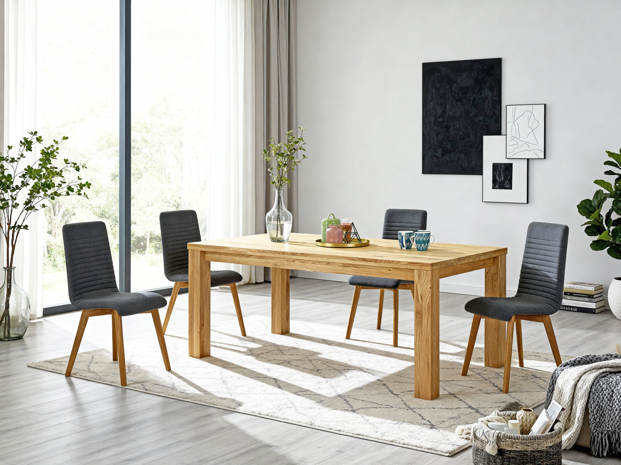 Predstavujeme vám elegantnú dubovú jedálenskú zostavu, ktorá kombinuje prírodnú krásu masívneho dreva s moderným komfortom čalúneného sedenia. Masívny dubový stôl Bratislava s rozmermi 180 x 90 cm je vyrobený zo 100% prírodného dubového dreva s nádhernými žilkami dubu lesného. Impozantná doska hrubá 4 cm (po stranách 4 cm, uprostred 2 cm) a mohutné nohy 8 x 8 cm zaručujú výnimočnú stabilitu. K tomuto krásnemu stolu získate 4 čalúnené stoličky Arosa v elegantnej svetlo sivej farbe, ktoré dlhé roky preukazujú svoju kvalitu na nemeckom trhu. Stôl je ošetrený špičkovým prírodným olejom, ktorý zvýrazňuje prirodzenú kresbu dreva a poskytuje dlhodobú ochranu.
