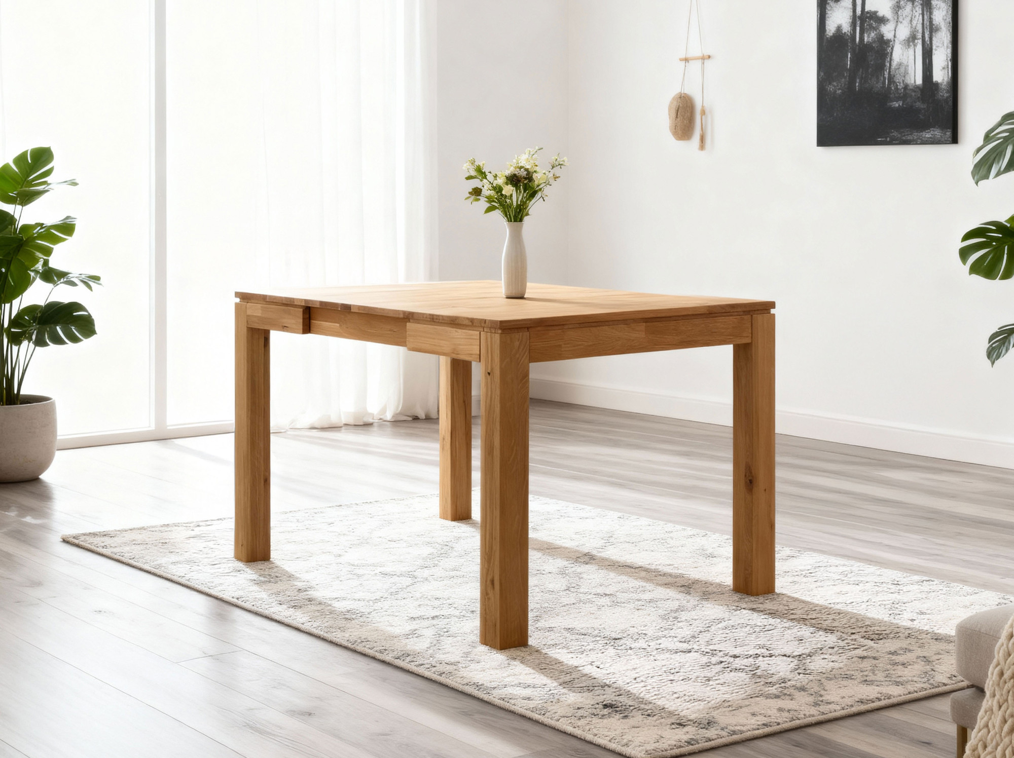 Rozkladací jedálenský set Matuš + Amisa predstavuje ideálne riešenie pre domácnosti, ktoré hľadajú kvalitný nábytok z prírodného dreva, praktickú funkčnosť a elegantný dizajn. Základom setu je dubový štvorcový stôl s rozmerom 80 × 80 cm, ktorý vďaka dômyselnému mechanizmu ľahko rozložíte na 130 × 80 cm. Tento systém je ukrytý vo vnútri konštrukcie, čo zabezpečuje čistý a nadčasový vzhľad. Stôl je vyrobený z celomasívneho dubového dreva, ktoré je ošetrené prírodným olejom. Povrchová úprava zvýrazňuje charakteristickú štruktúru materiálu a poskytuje dlhodobú ochranu. Kľúčovým benefitom je tiež umiestnenie nôh na konci stola – tento prvok zachováva plnú šírku aj po rozložení a poskytuje stabilitu aj pohodlné sedenie.