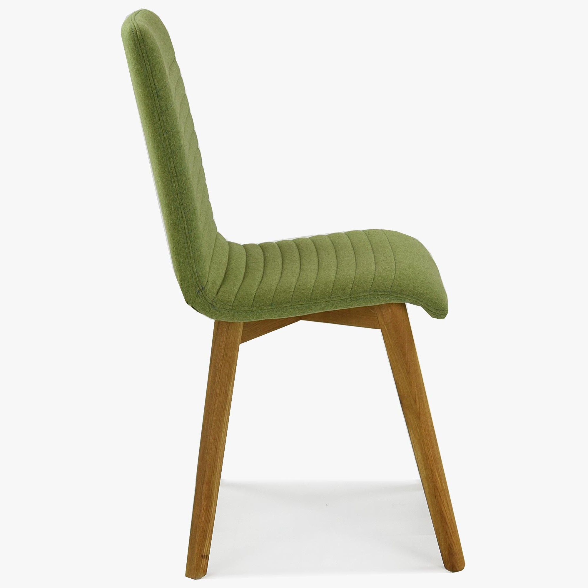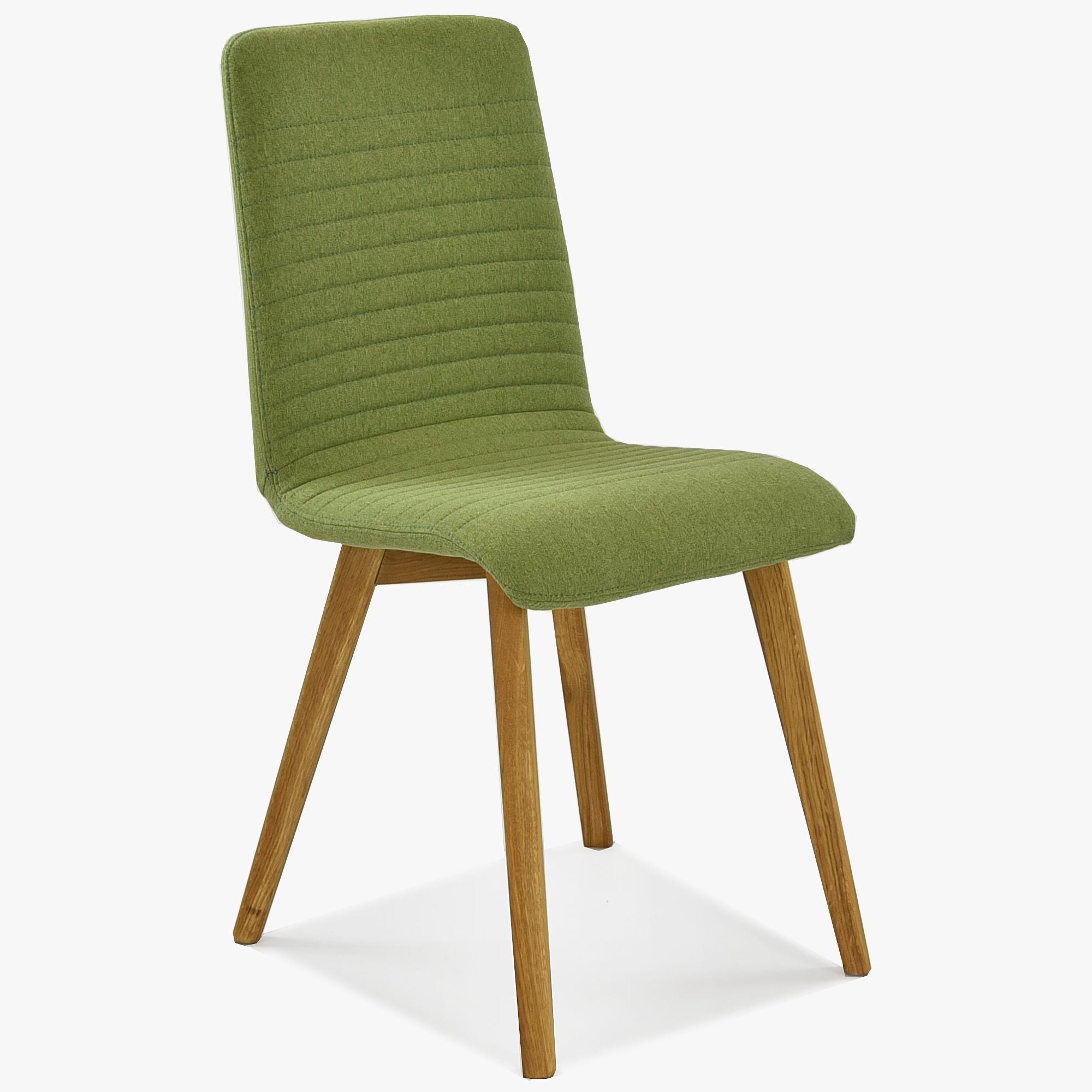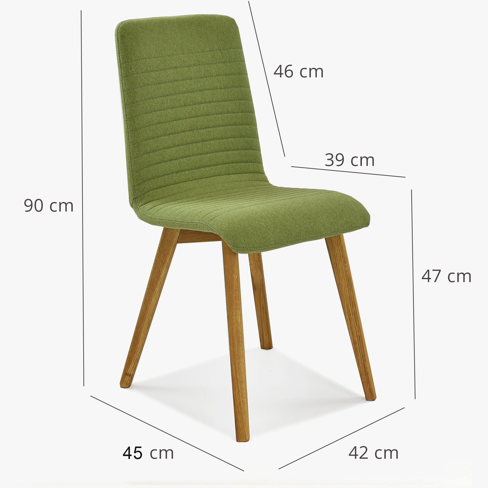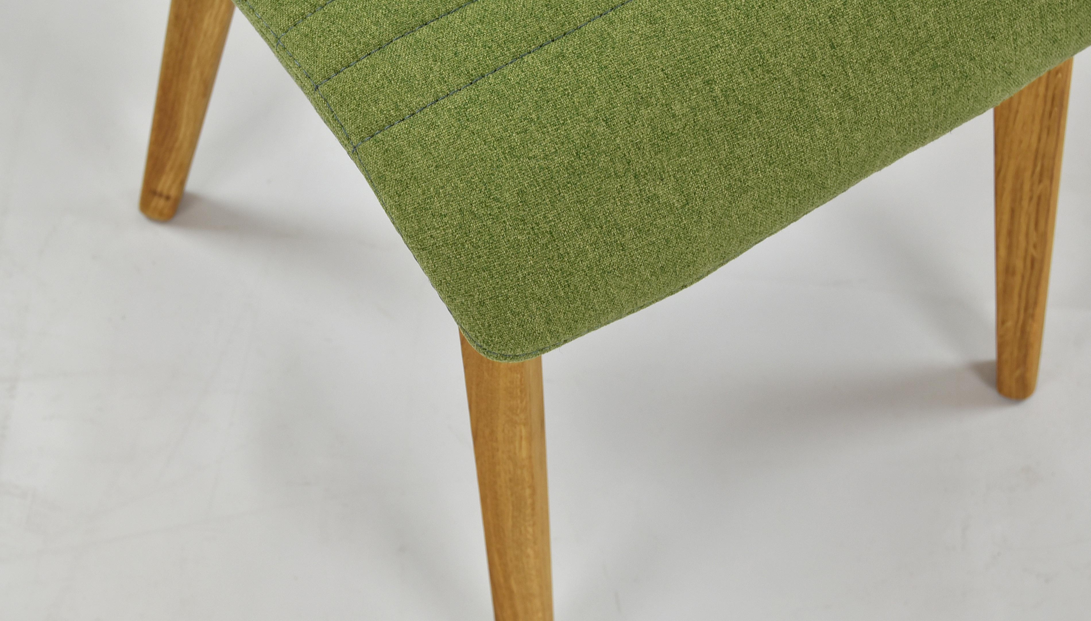 Jedálenské stoličky v modernom dizajne vyrobené z kvalitnej látky v zelenej farbe. Jedálenská stolička Arosa resp. Lara je dostupná aj v iných farbách. Ide o náš najpopulárnejší model, kde o vynikajúcom pomere ceny / kvality sa presvedčili už stovky spokojných zákazníkov. Jedálenská stolička sa dodáva už zmontovaná, jej ľahká váha iba 7,5 kg vám umožňuje tak jej jednoduchú manipuláciu. Látka na stoličke je v zelenej farbe veľmi príjemná, mäkká látka na dotyk. Čistenie pomocou vody alebo mydla PH0. Nohy na stoličke sú vyrobené z dubového dreva výhradne z obnoviteľných lesov s certifikátom FSC. Drevo je ošetrené značkovým dánskym olejom WOCA, ktorý je ekologický a šetrný k životnému prostrediu. Nosnosť stoličky do 110 kg. Opierka stoličky je vyrobená z drevenej preglejky. Medzi vlastnosti tohto materiálu patrí jemné pruženie. Vzhľadom na to, že ide o prírodný materiál, môže mať každý kus mierne odlišnú tuhosť opierky.