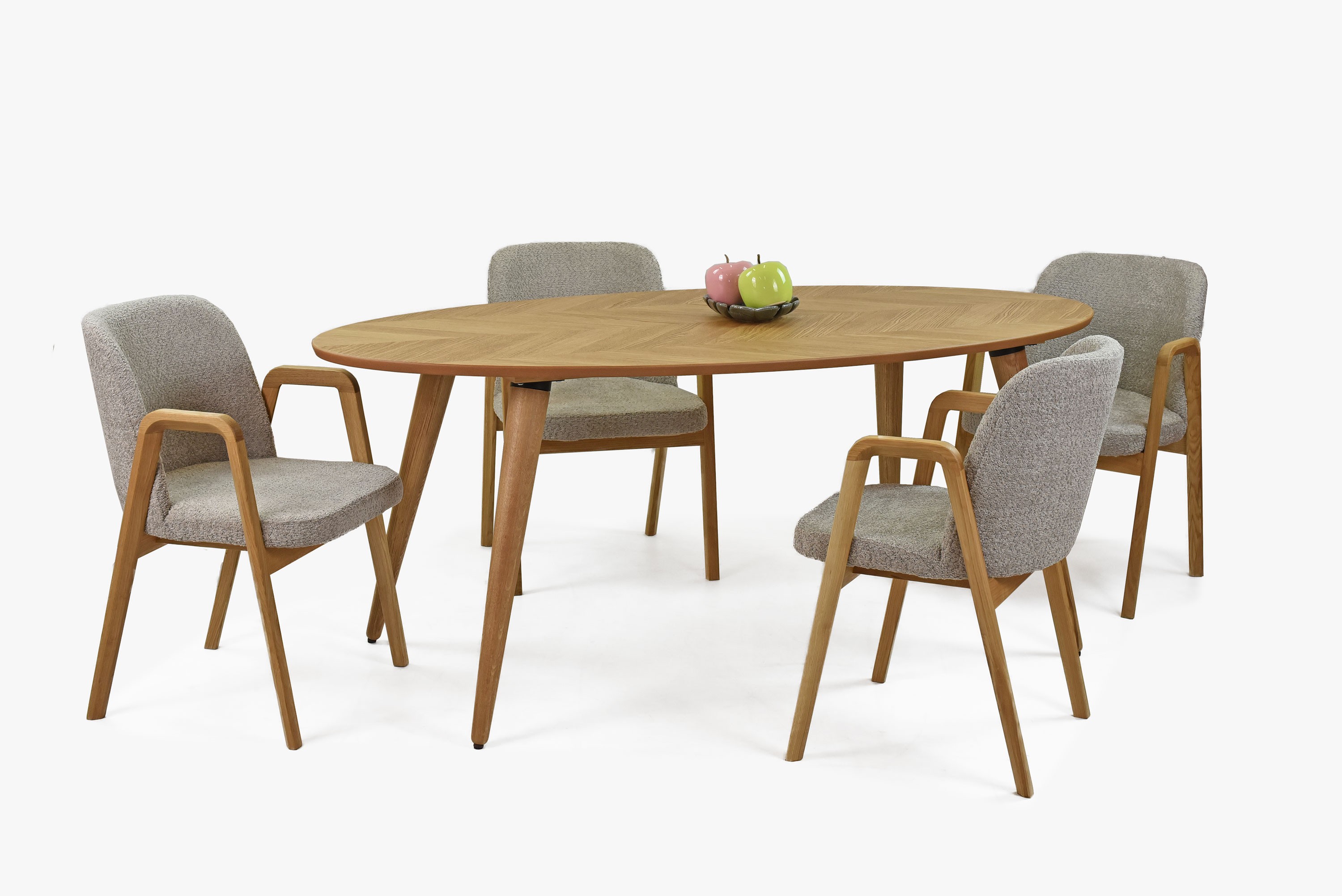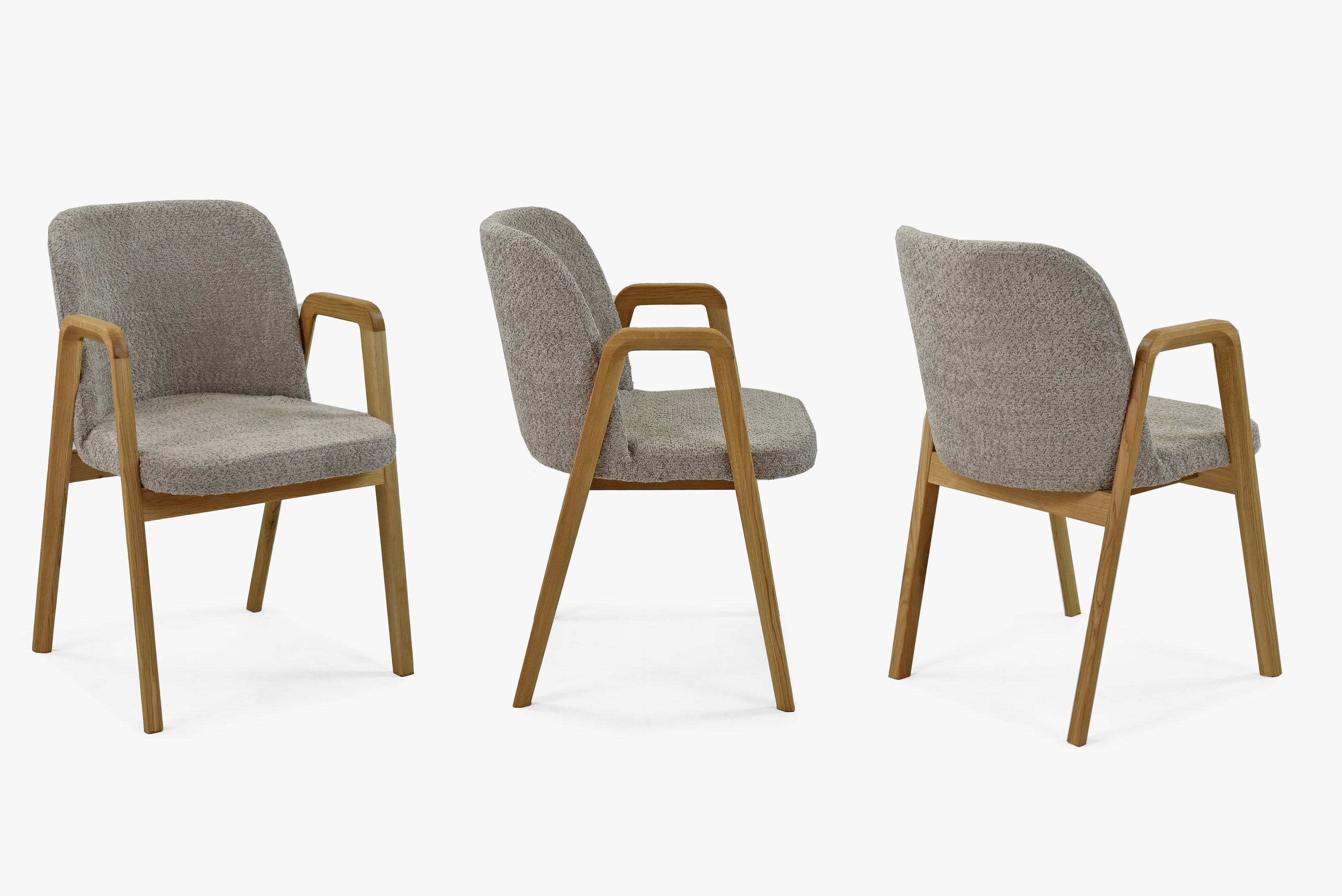 Moderná jedálenská stolička v mimoriadne atraktívnej látke. Látka je v farebnom prevedení šedo hnedá (taupe). Originálna a mimoriadne mäkká tkanina so špecifickou buklé textúrou a skrytým jemným dizajnom rybej kosti. Stolička má zaoblený tvar. Už na prvý pohľad zaujme svojím dizajnom a mimoriadne vysokým komfortom sedenia. Použité drevo je dub, ošetrený prírodným olejom, ktorý nábytok chráni a zároveň zvýrazňuje štruktúru dreva. Stolička sa dodáva už zmontovaná.