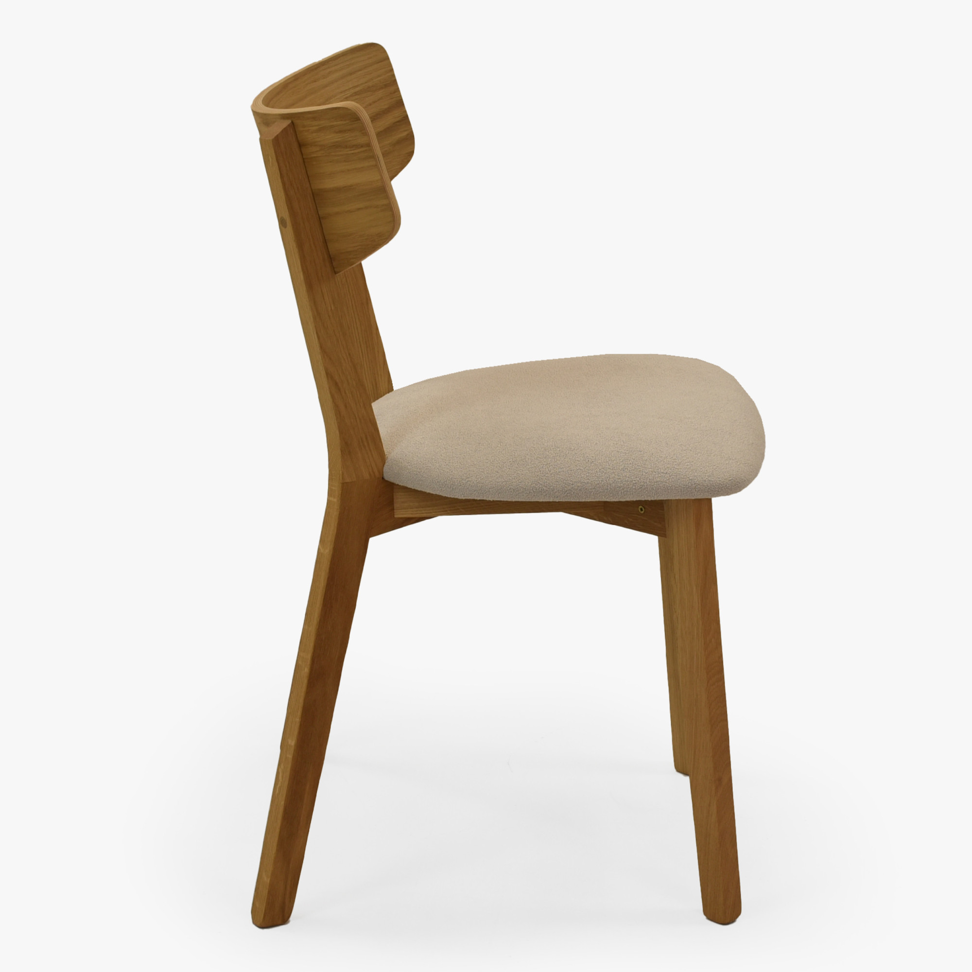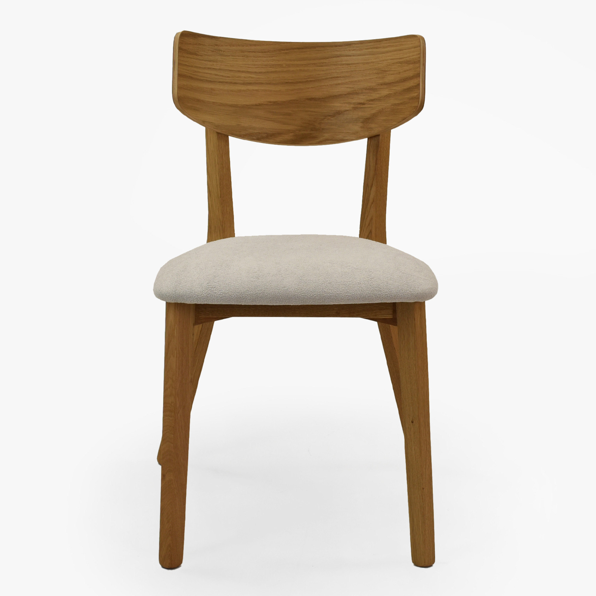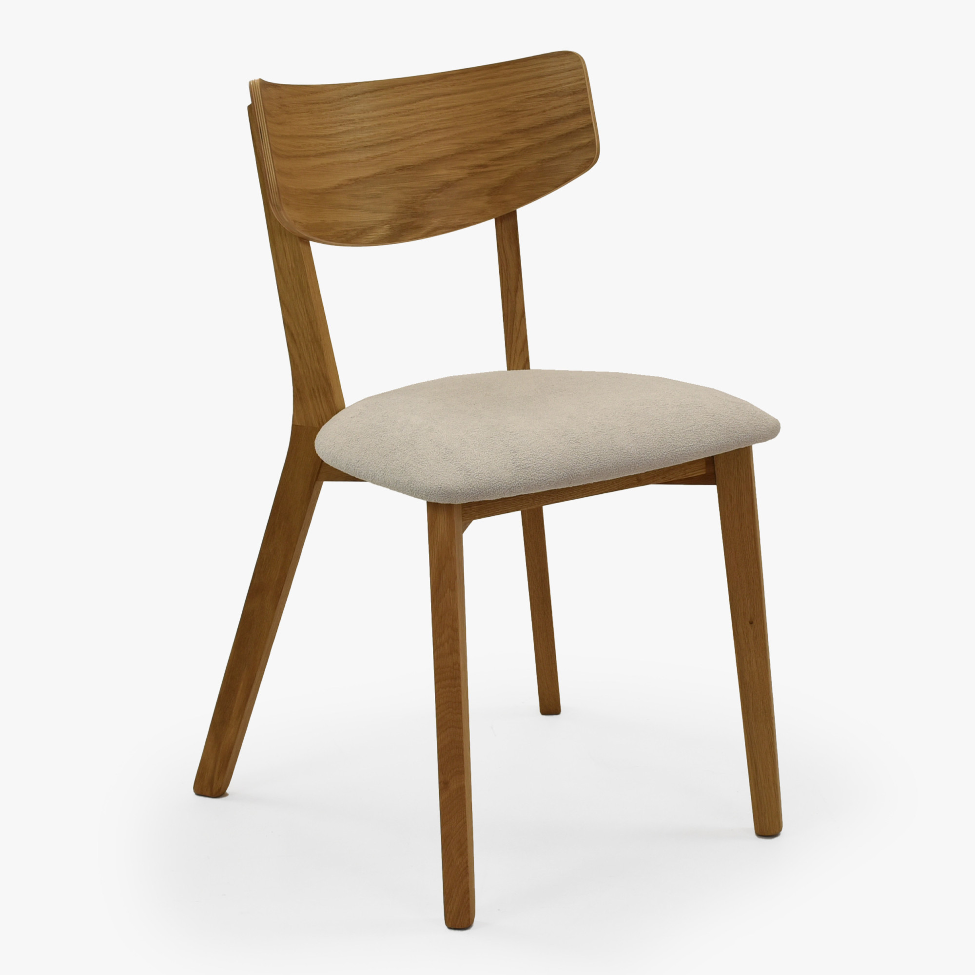 Dubová stolička so svetlým čalúnením je elegantným spojenie prírodného dizajnu a moderného pohodlia. Rám stoličky je vyrobený z masívneho dubového dreva s povrchovou úpravou v odtieni dub natural, ktorá zvýrazňuje prirodzenú kresbu dreva a dodáva každému kusu jedinečný charakter. Vďaka FSC certifikácii máte istotu, že drevo pochádza z udržateľne spravovaných lesov. Sedák je vyplnený kvalitnou čalúnickou penou, ktorá poskytuje vysoký komfort pri sedení. Čalúnenie je v svetlej farbe typu bouclé, čo je jemná a moderná textília príjemná na dotyk.
