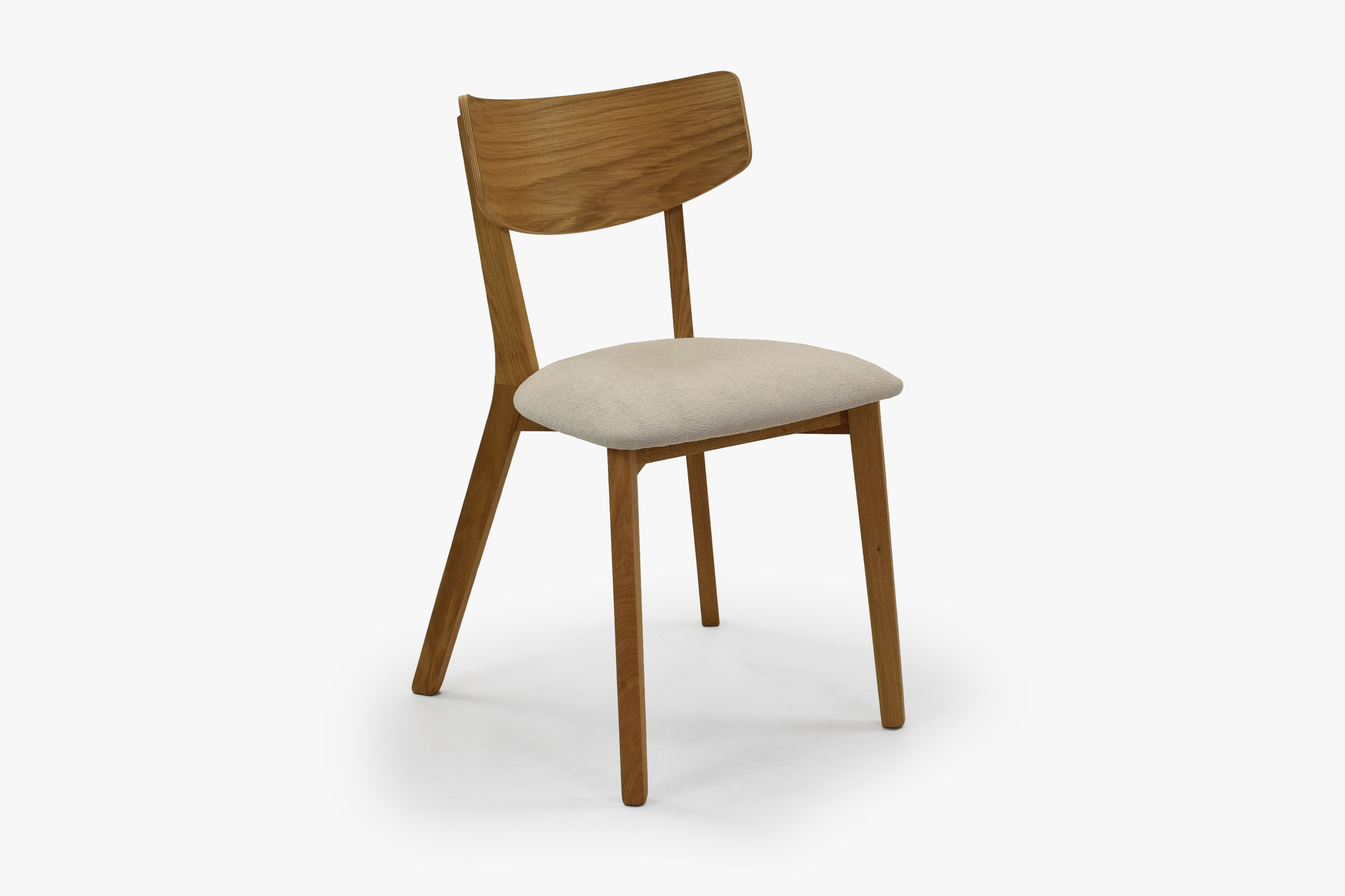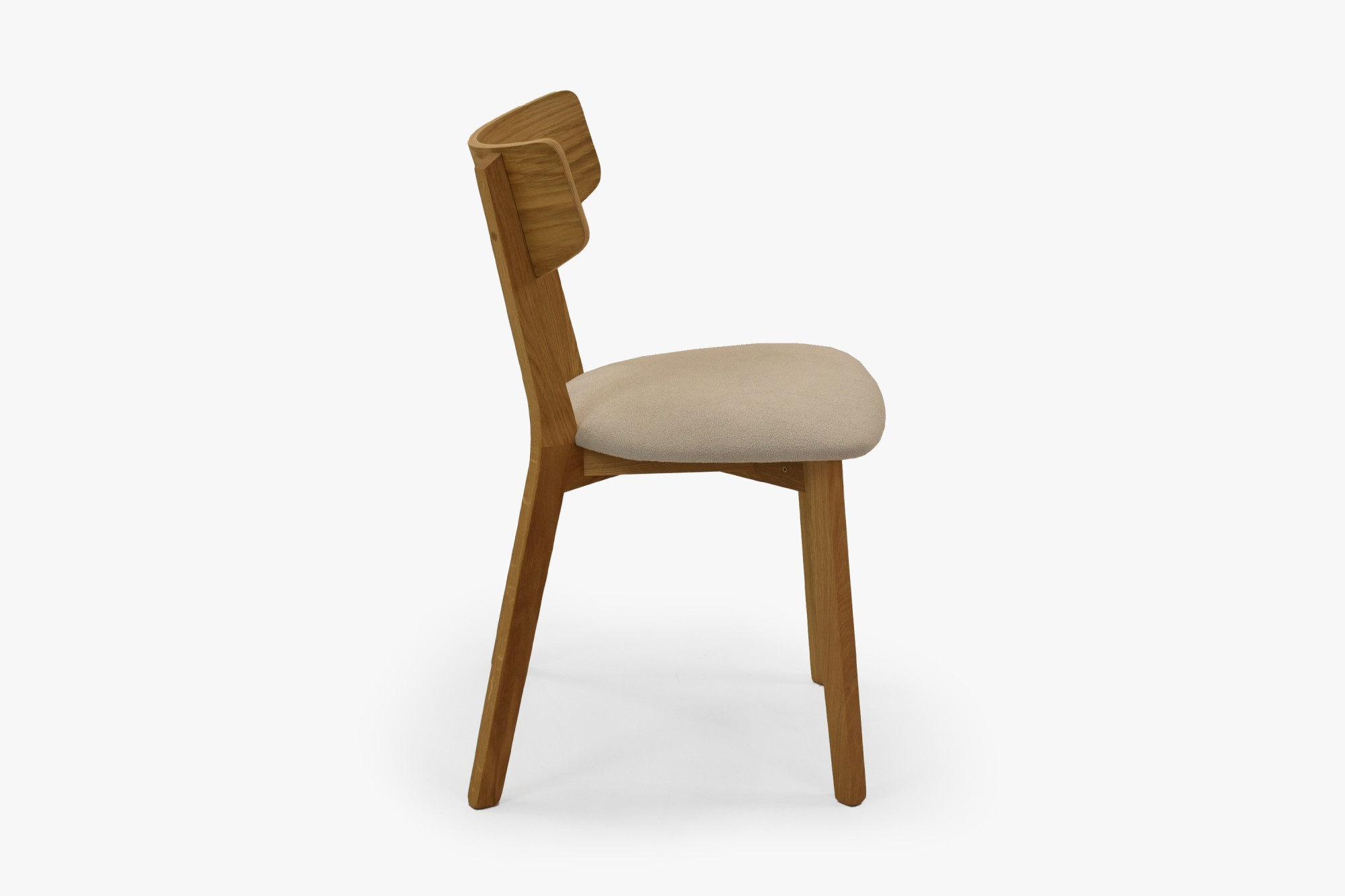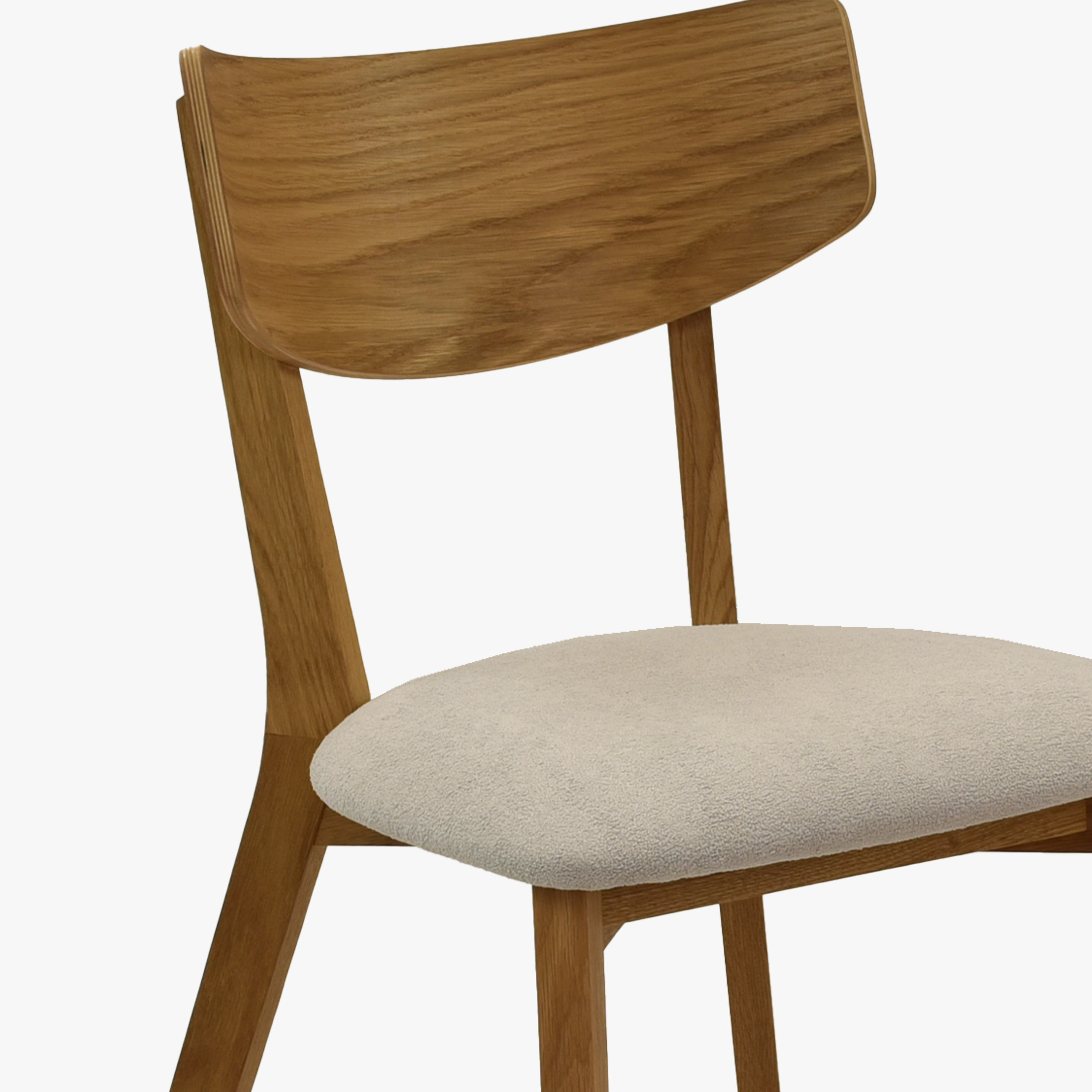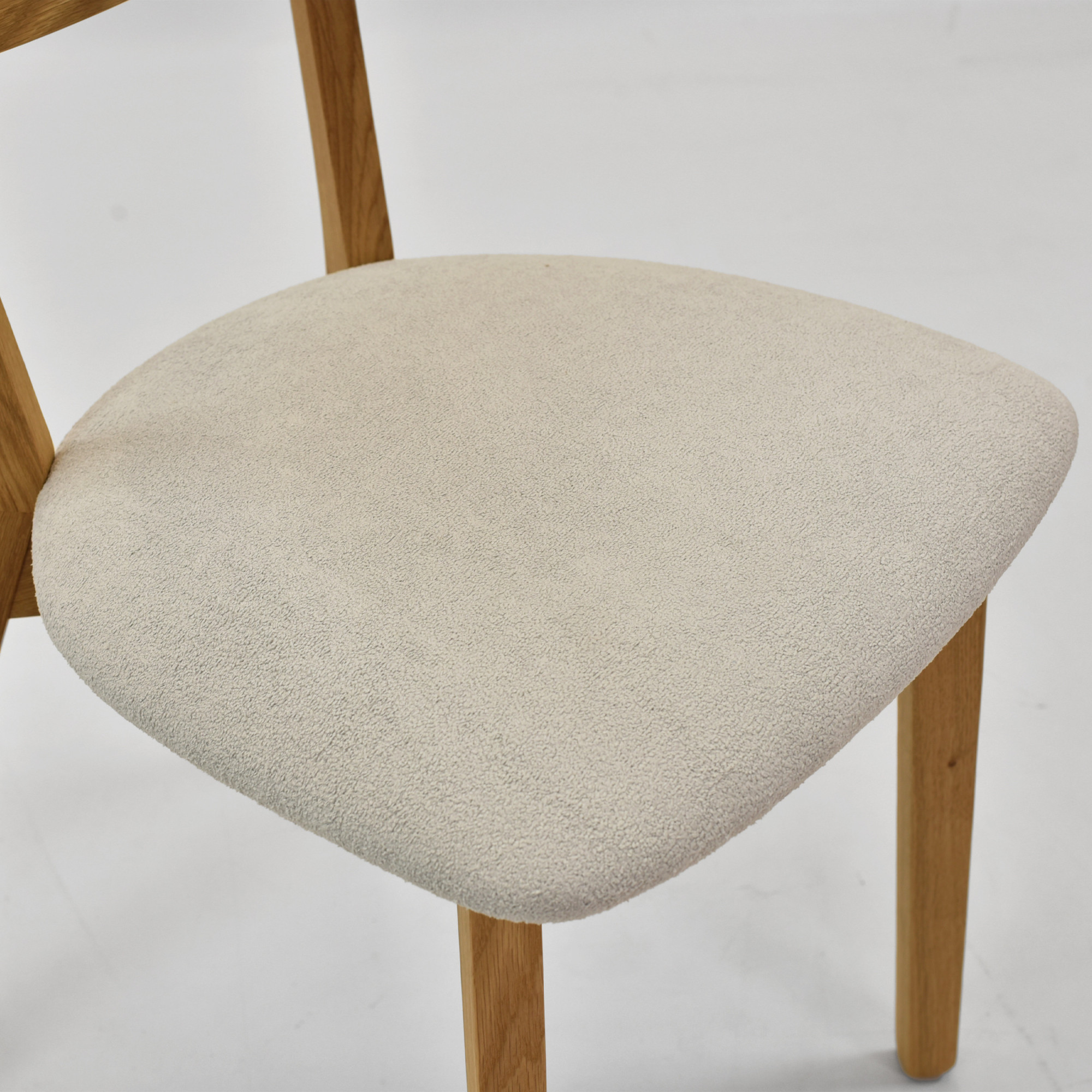 Dubová stolička so svetlým čalúnením je elegantným spojenie prírodného dizajnu a moderného pohodlia. Rám stoličky je vyrobený z masívneho dubového dreva s povrchovou úpravou v odtieni dub natural, ktorá zvýrazňuje prirodzenú kresbu dreva a dodáva každému kusu jedinečný charakter. Vďaka FSC certifikácii máte istotu, že drevo pochádza z udržateľne spravovaných lesov. Sedák je vyplnený kvalitnou čalúnickou penou, ktorá poskytuje vysoký komfort pri sedení. Čalúnenie je v svetlej farbe typu bouclé, čo je jemná a moderná textília príjemná na dotyk.