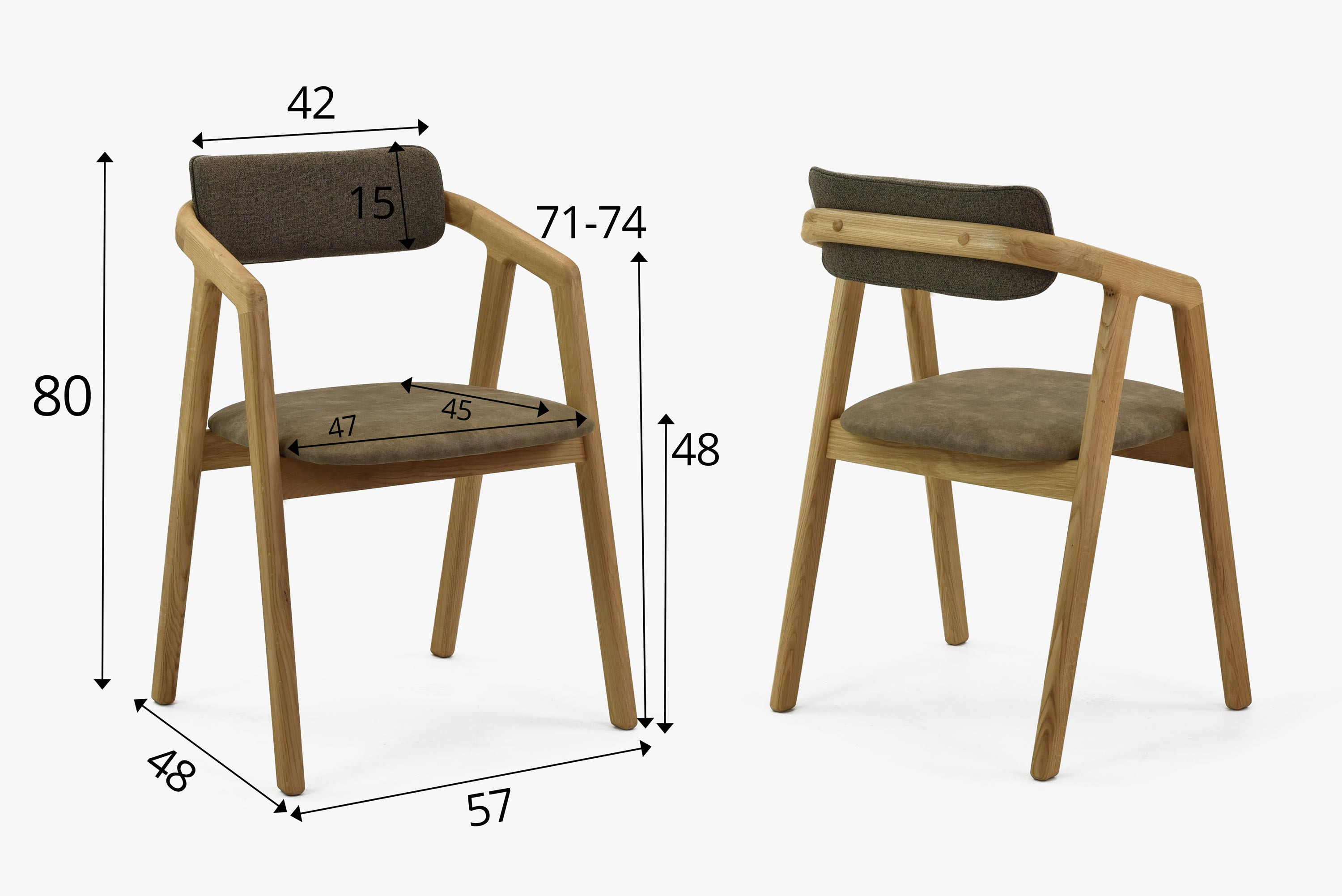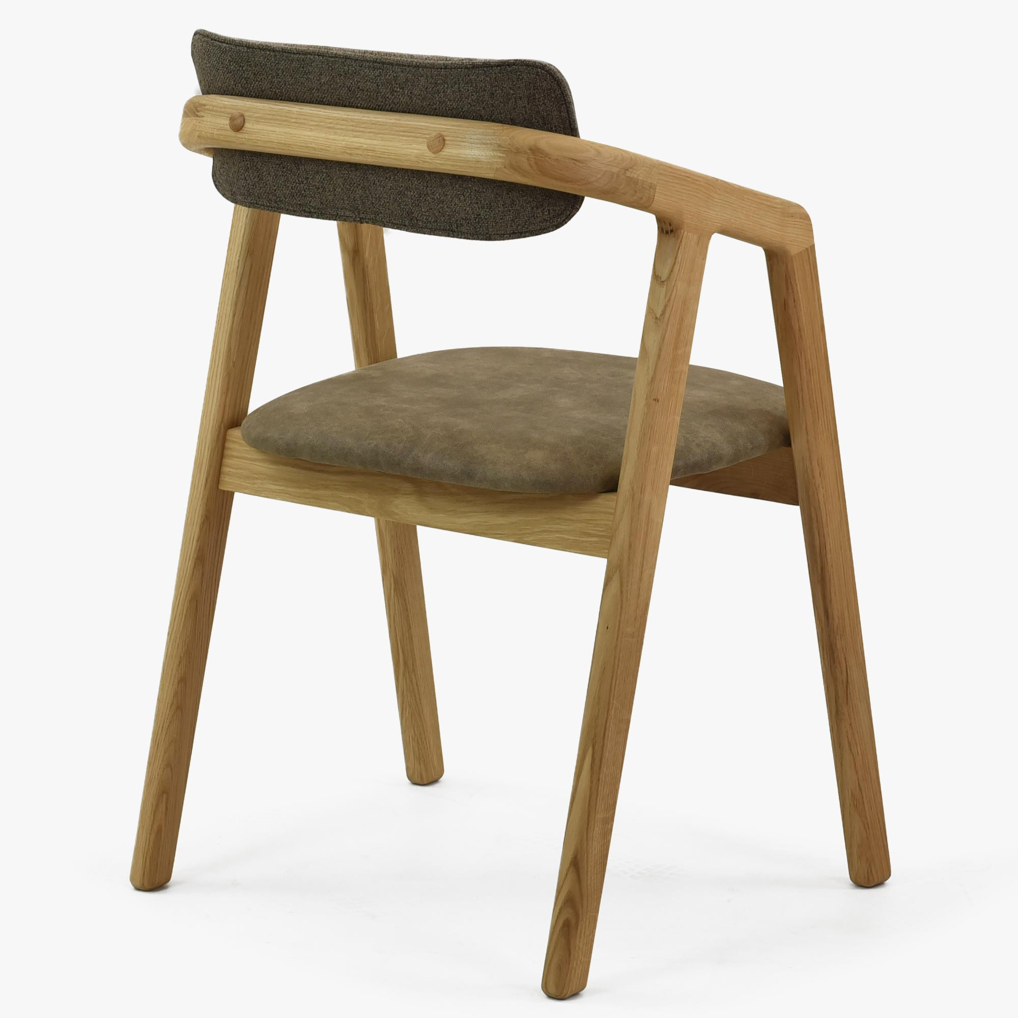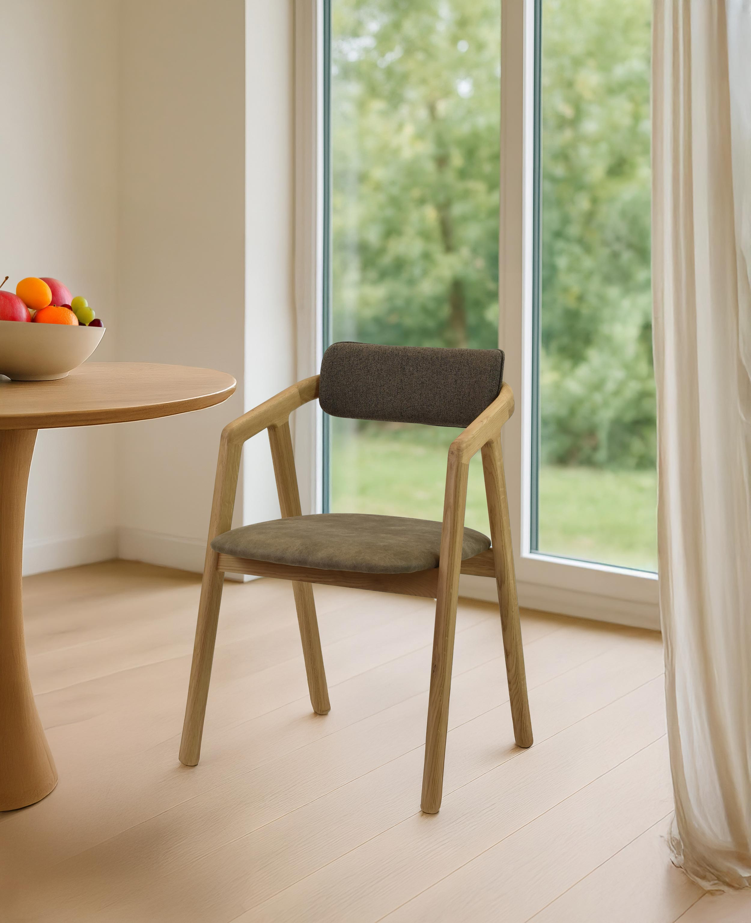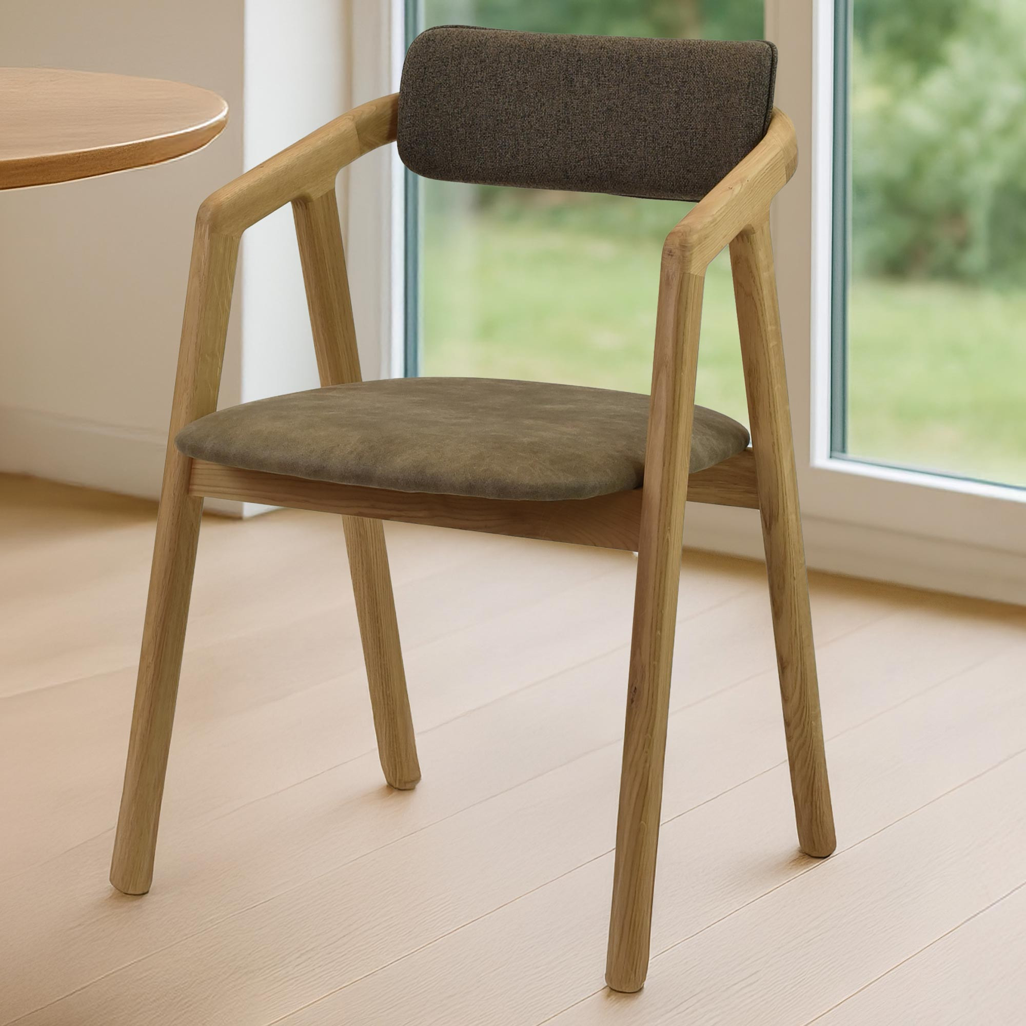 Elegantná dubová stolička v prírodnom odtieni dub natural vnáša do jedálne skutočné čaro masívneho dreva. Rám z pevného dubu ošetreného prírodným olejom zvýrazňuje kresbu dreva a zaručuje dlhú životnosť. Ergonomicky tvarované podrúčky plynule prechádzajú do predných nôh, takže stolička pôsobí odľahčene a zároveň poskytuje stabilnú oporu. Sedák je potiahnutý látkou imitujúcou luxusnú melírovanú kožu v hnedo-zelenom tóne, zatiaľ čo operadlo kryje kvalitné čalúnenie v jednotnej farbe. Vďaka kombinácii dreva a textilu zaujme stolička rovnako milovníkov moderného škandinávskeho štýlu ako klasických interiérov.