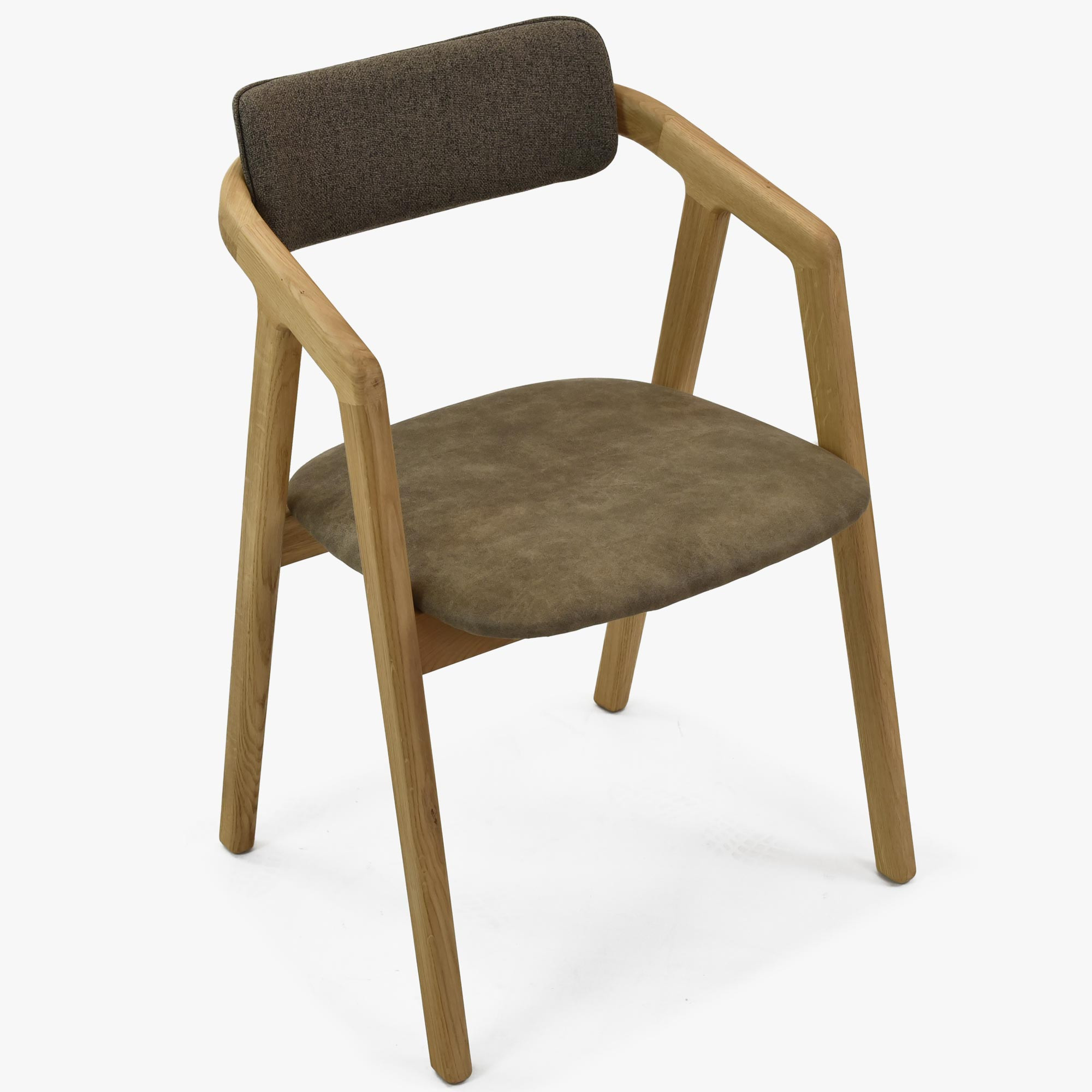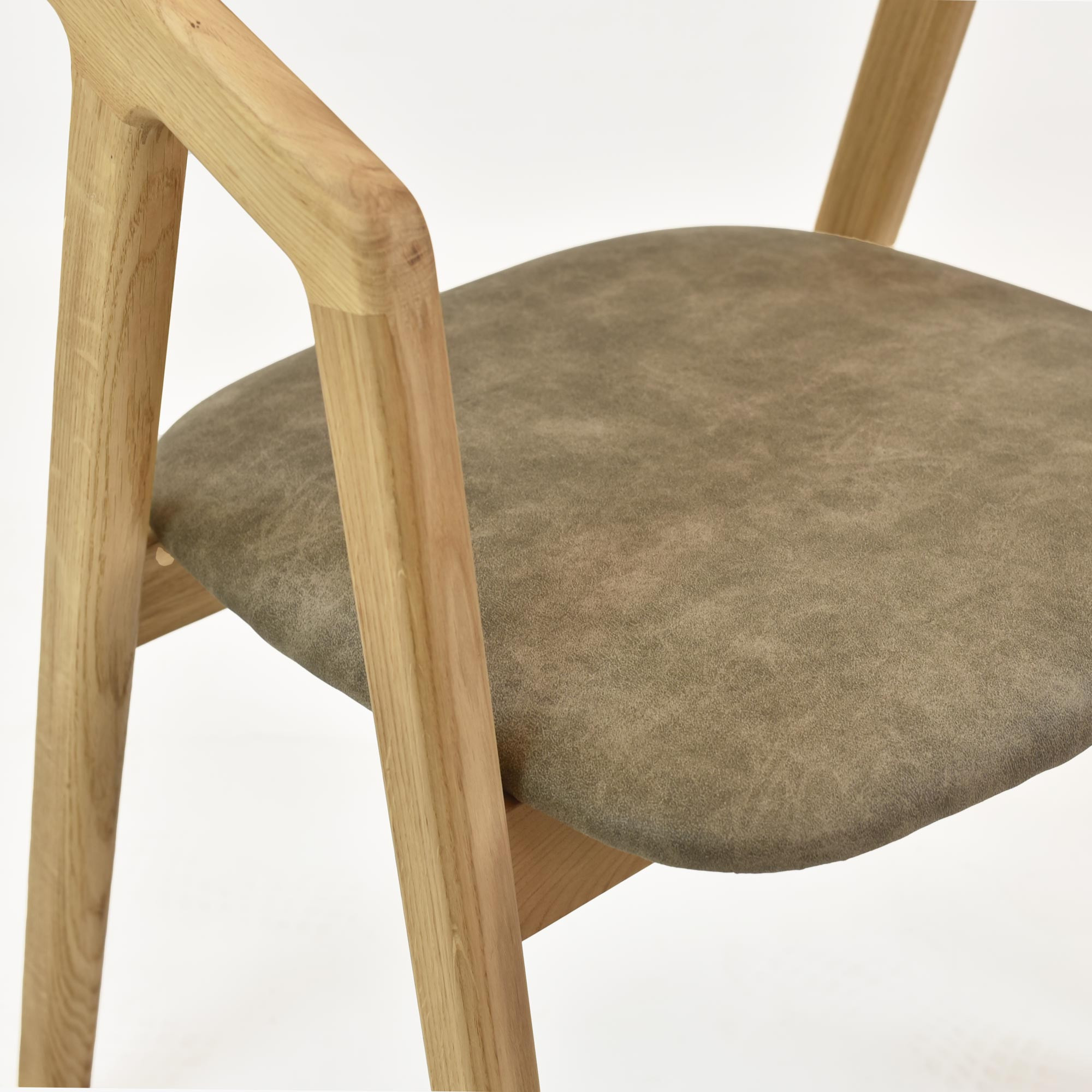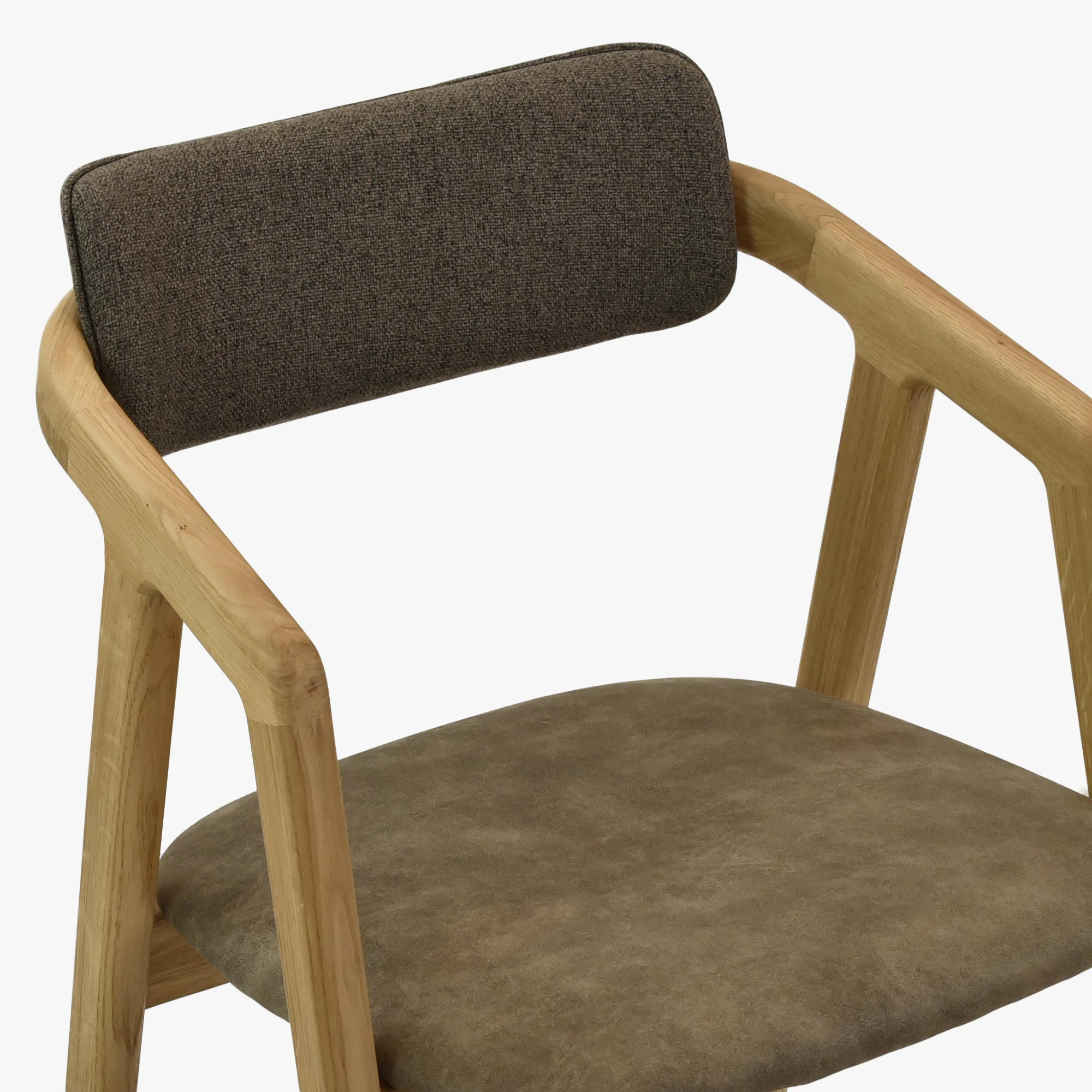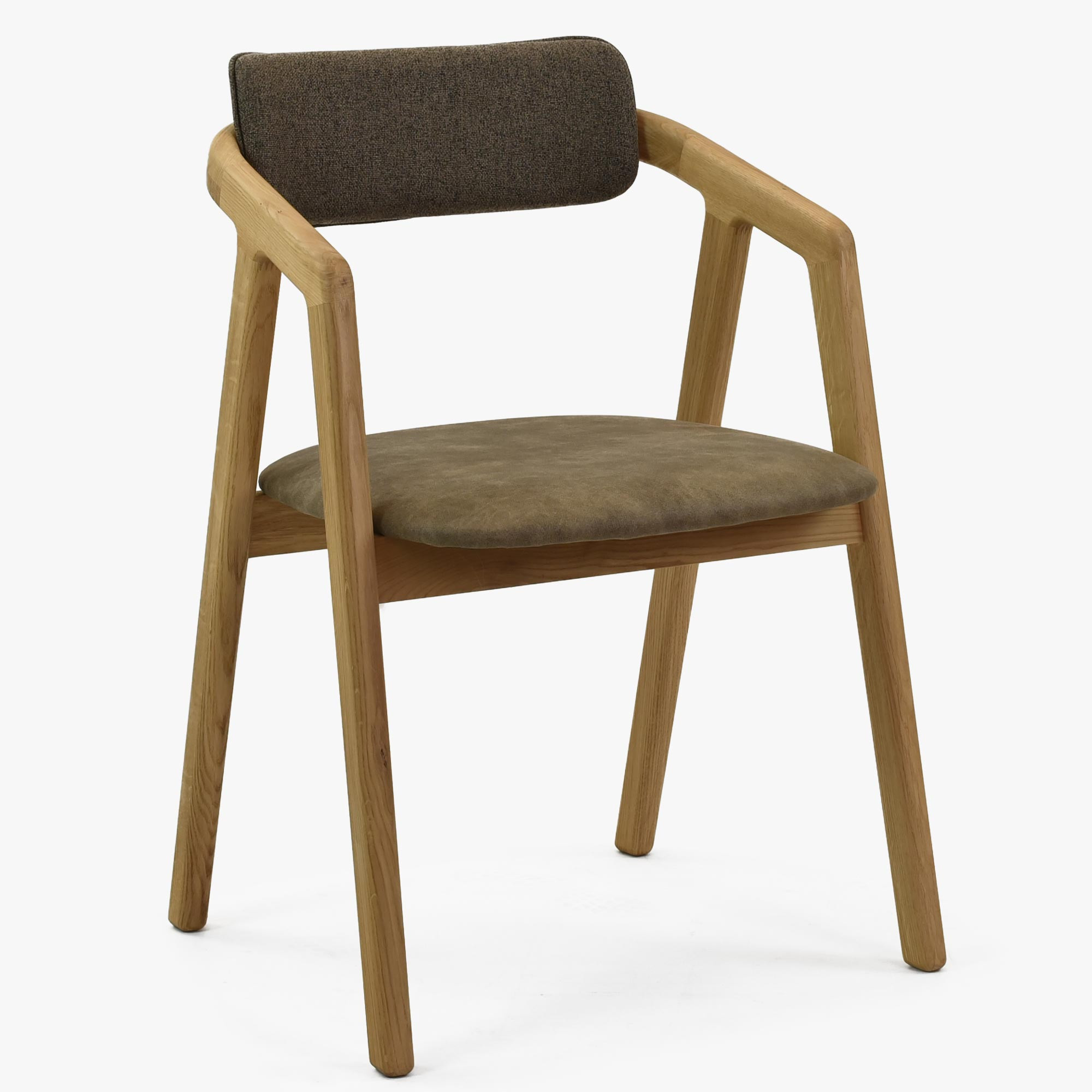 Elegantná dubová stolička v prírodnom odtieni dub natural vnáša do jedálne skutočné čaro masívneho dreva. Rám z pevného dubu ošetreného prírodným olejom zvýrazňuje kresbu dreva a zaručuje dlhú životnosť. Ergonomicky tvarované podrúčky plynule prechádzajú do predných nôh, takže stolička pôsobí odľahčene a zároveň poskytuje stabilnú oporu. Sedák je potiahnutý látkou imitujúcou luxusnú melírovanú kožu v hnedo-zelenom tóne, zatiaľ čo operadlo kryje kvalitné čalúnenie v jednotnej farbe. Vďaka kombinácii dreva a textilu zaujme stolička rovnako milovníkov moderného škandinávskeho štýlu ako klasických interiérov.