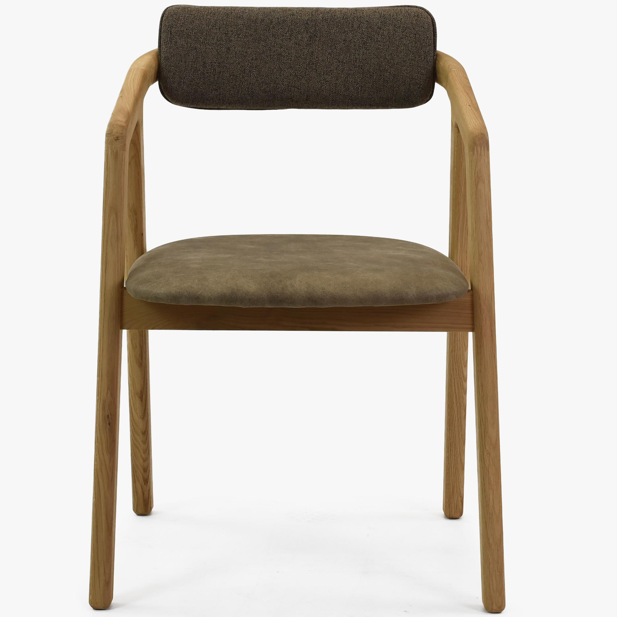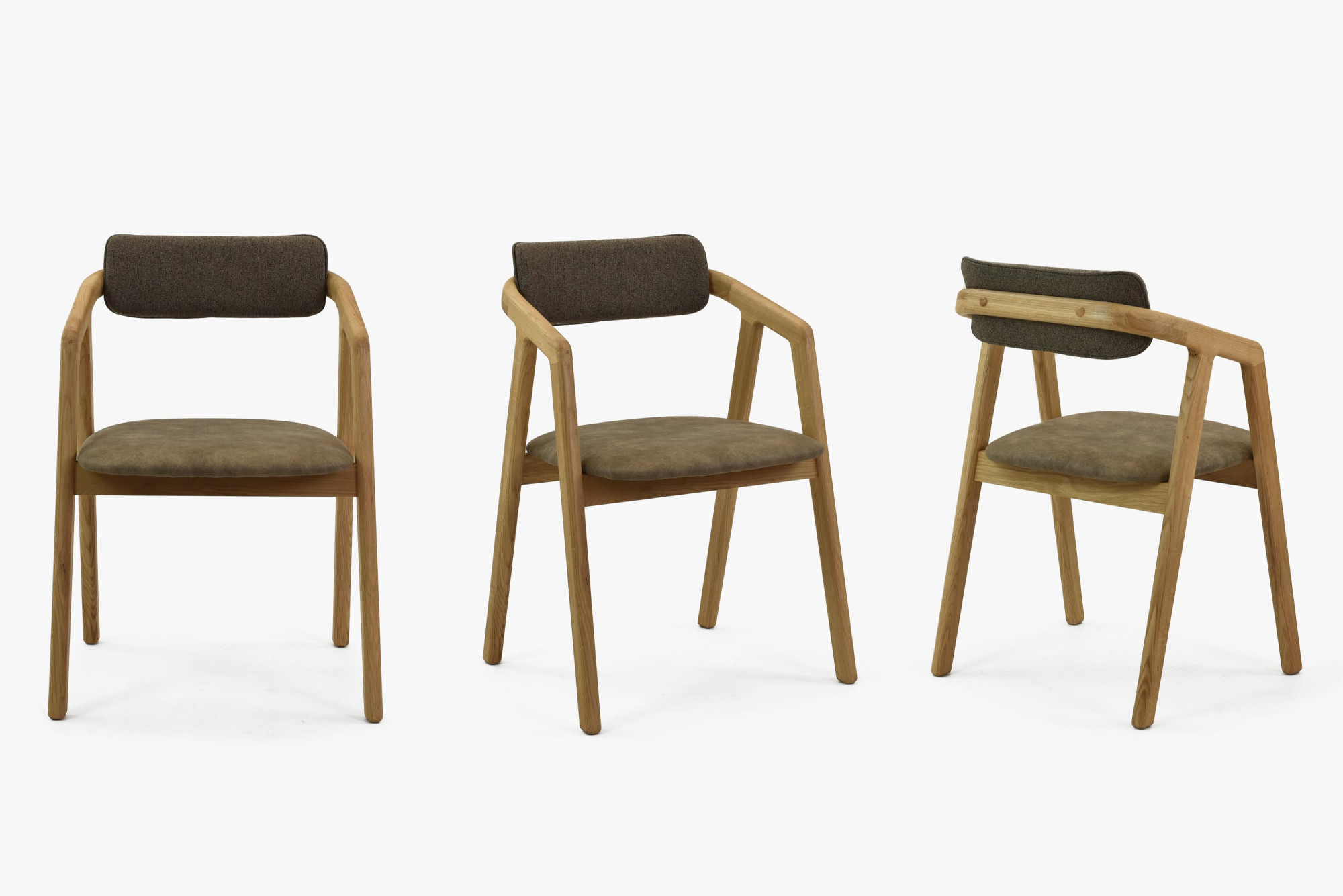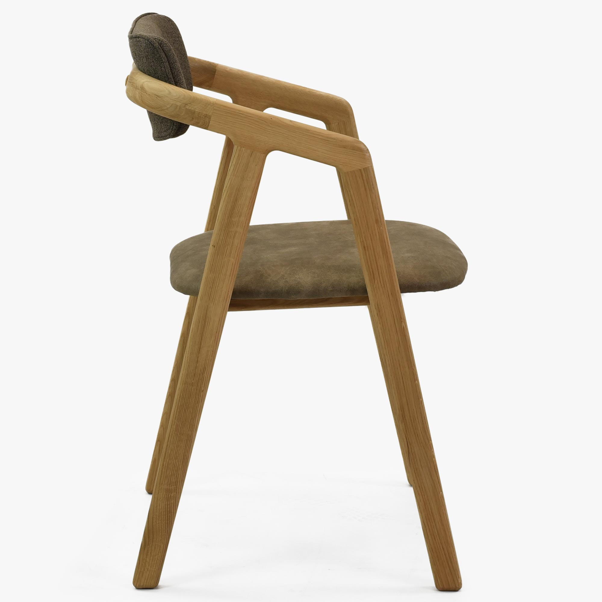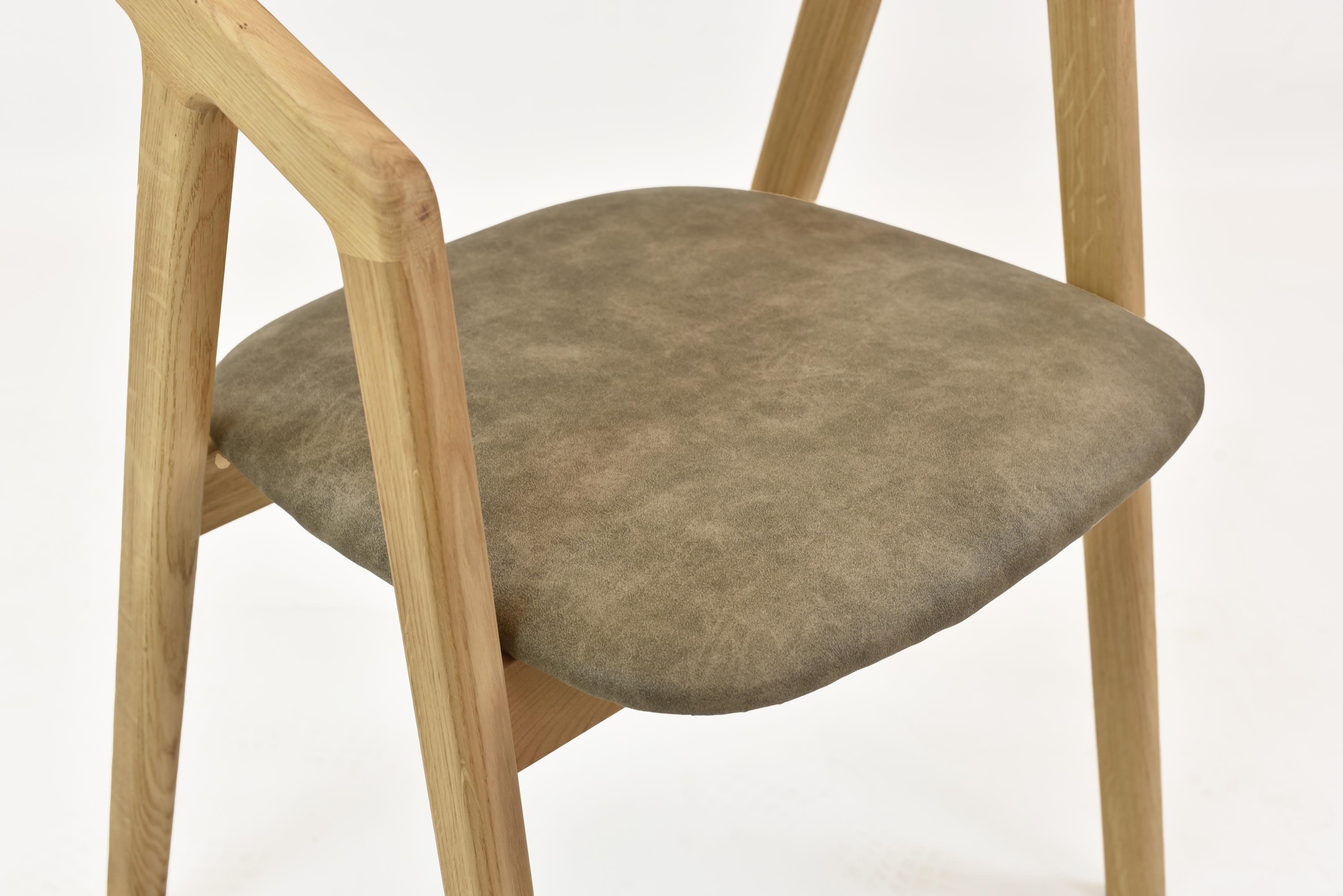 Elegantná dubová stolička v prírodnom odtieni dub natural vnáša do jedálne skutočné čaro masívneho dreva. Rám z pevného dubu ošetreného prírodným olejom zvýrazňuje kresbu dreva a zaručuje dlhú životnosť. Ergonomicky tvarované podrúčky plynule prechádzajú do predných nôh, takže stolička pôsobí odľahčene a zároveň poskytuje stabilnú oporu. Sedák je potiahnutý látkou imitujúcou luxusnú melírovanú kožu v hnedo-zelenom tóne, zatiaľ čo operadlo kryje kvalitné čalúnenie v jednotnej farbe. Vďaka kombinácii dreva a textilu zaujme stolička rovnako milovníkov moderného škandinávskeho štýlu ako klasických interiérov.
