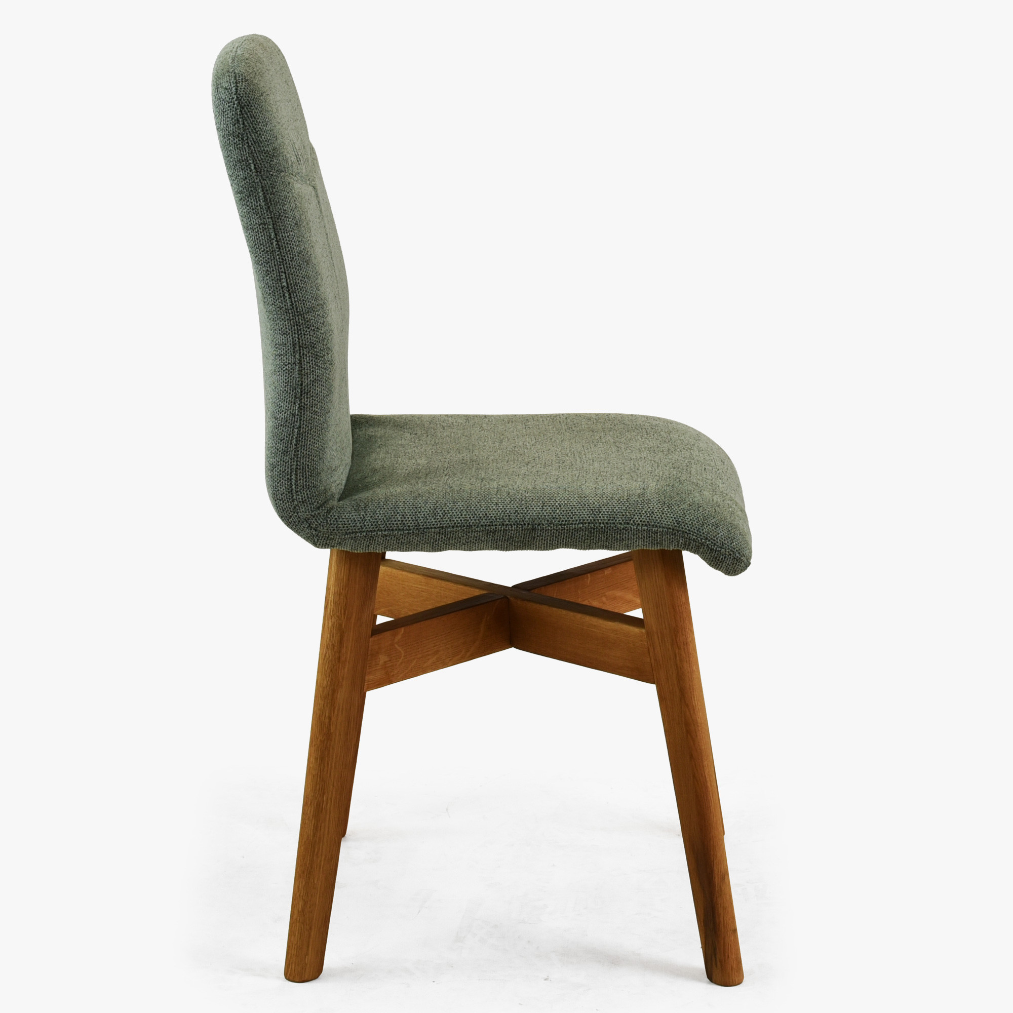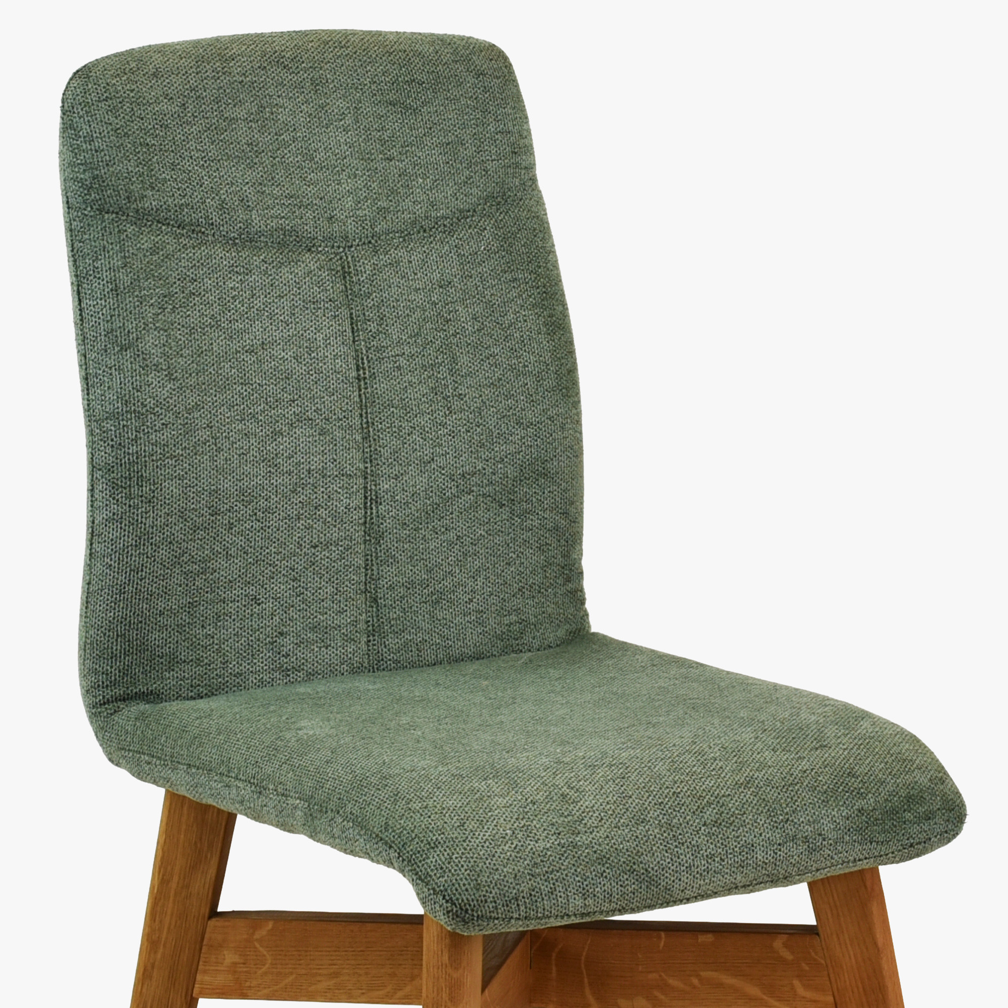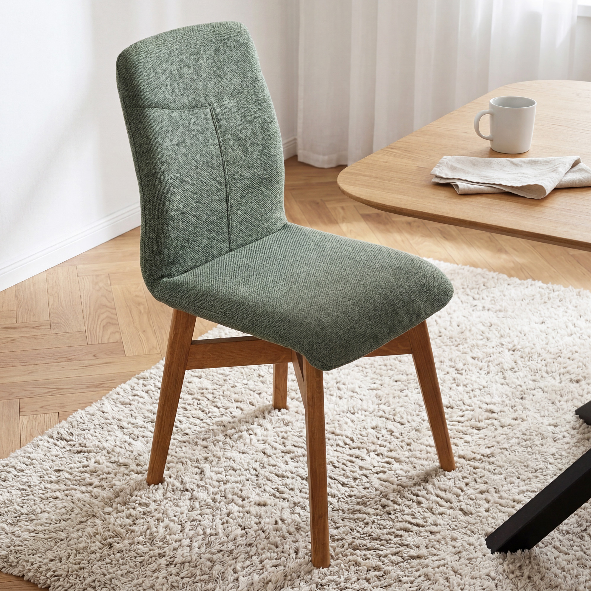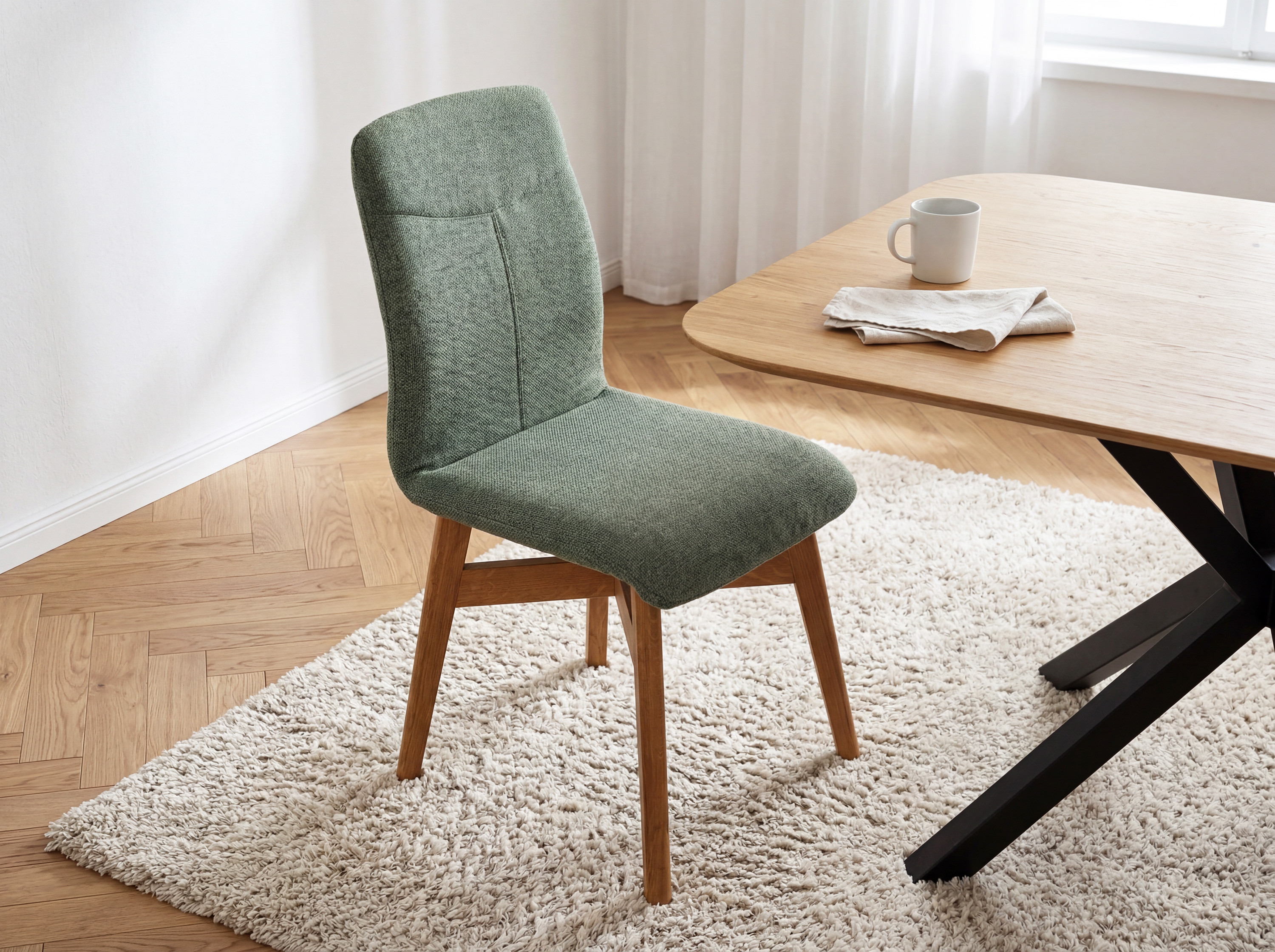Sedák stoličky je vyplnený vysoko elastickou penou, ktorá zaručuje maximálny komfort aj pri dlhom sedení. Dubové nohy v prírodnom odtieni sú ošetrené transparentným olejom, ktorý zdôrazňuje prirodzenú krásu dreva. Mimoriadnou výhodou je easy clean poťah, ktorý umožňuje odstránenie 99 % škvŕn len pomocou vody. Stolička sa dodáva už profesionálne zmontovaná a vďaka hmotnosti len 8 kg je ľahko premiestniteľná. Ergonomický tvar sedáka s opierkami zaisťuje pohodlie počas celého večera, zatiaľ čo nosnosť až 120 kg a odolnosť látky voči oderu 50 000 cyklov garantujú dlhú životnosť produktu.
