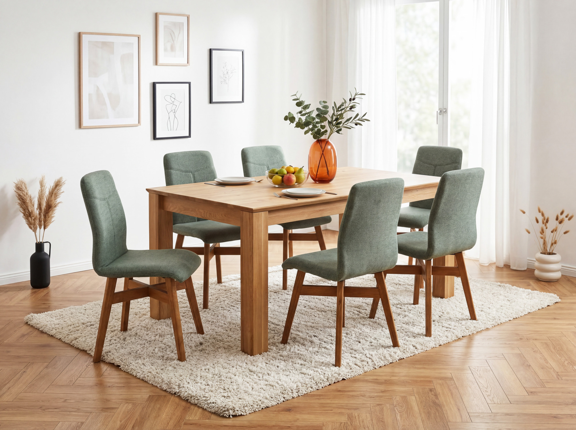 * Na obrázku dubový rozkladací stôl Jakub XL a jedálenská stolička York v zelenej farbe - easy clean látka