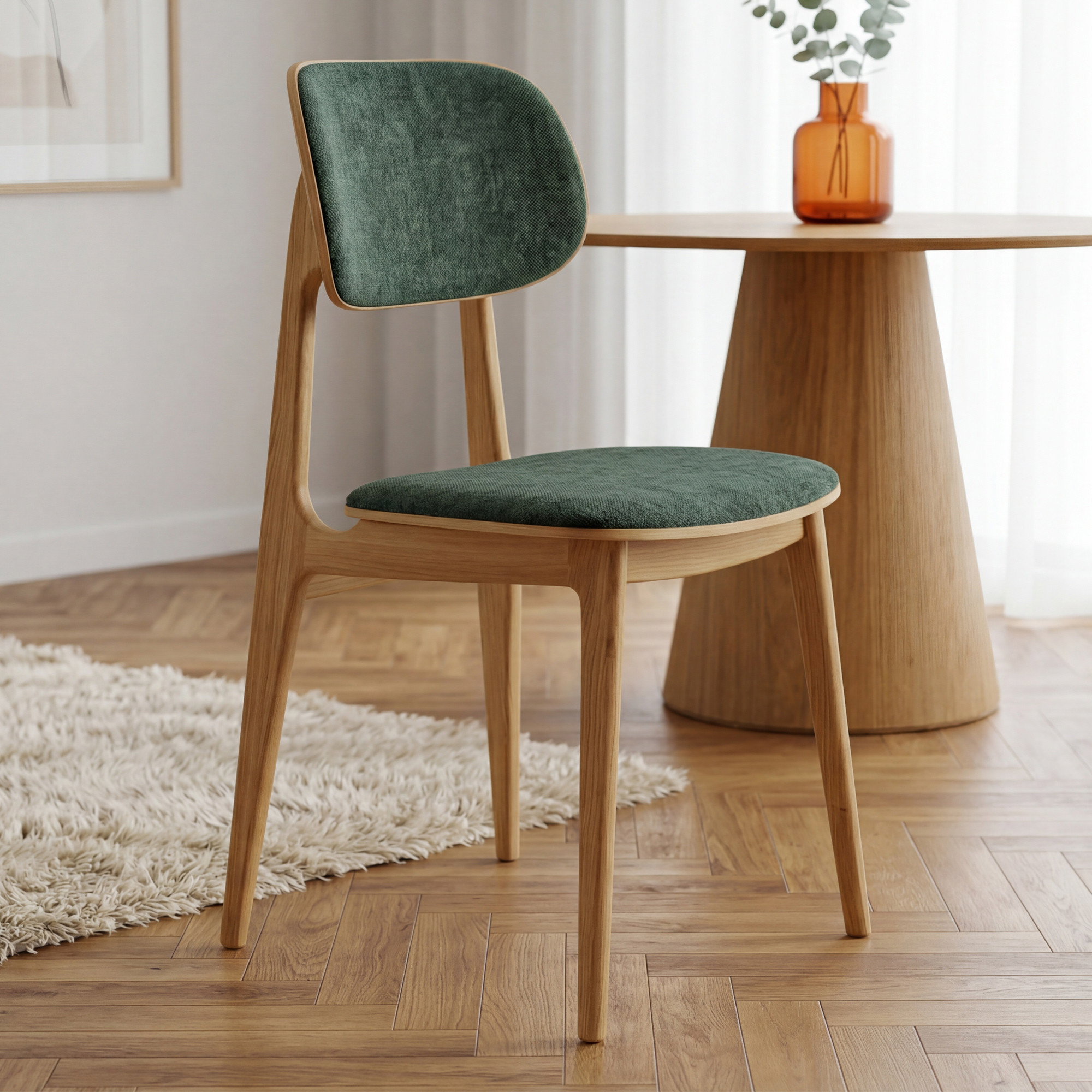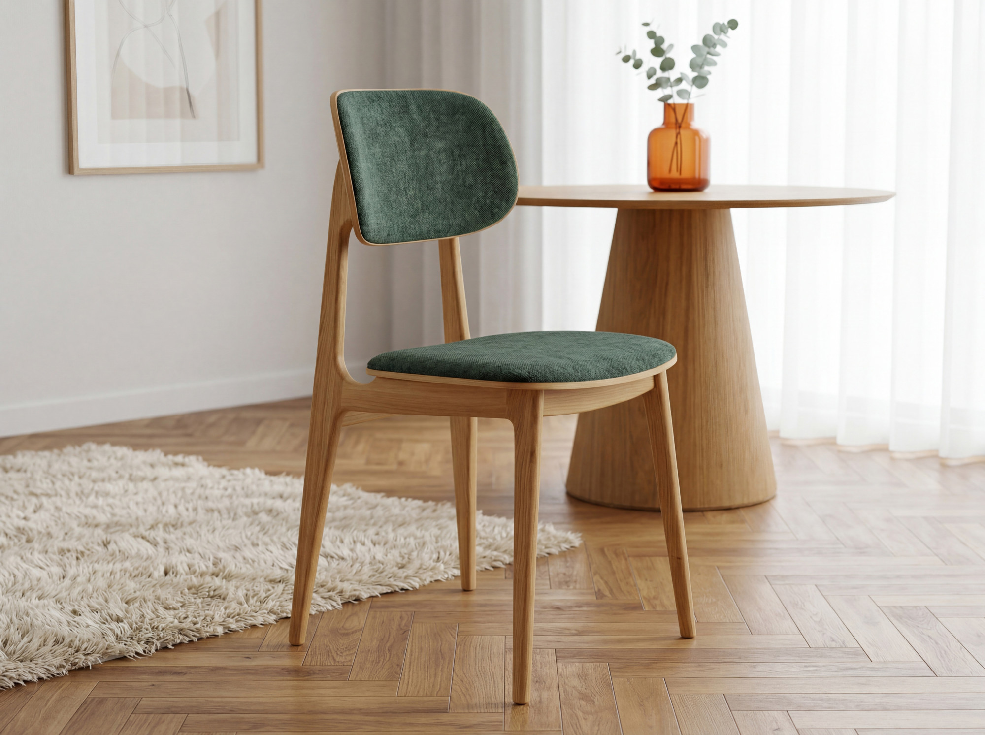 Jedálenská stolička Vard je elegantnou voľbou pre každého, kto hľadá kvalitnú čalúnenú stoličku s nadčasovým dizajnom. Konštrukcia z masívneho dubového dreva dodáva stoličke prirodzenú krásu i výnimočnú odolnosť. Sedák a operadlo sú potiahnuté odolnou látkou Mistral v zelenej farbe, ktorá je vyrobená zo 100 % polyesteru a dosahuje hodnotu viac než 100 000 cyklov v teste Martindale. Vďaka hladkým, organicky tvarovaným líniám sa táto stolička výborne hodí do moderných aj škandinávsky ladených interiérov.