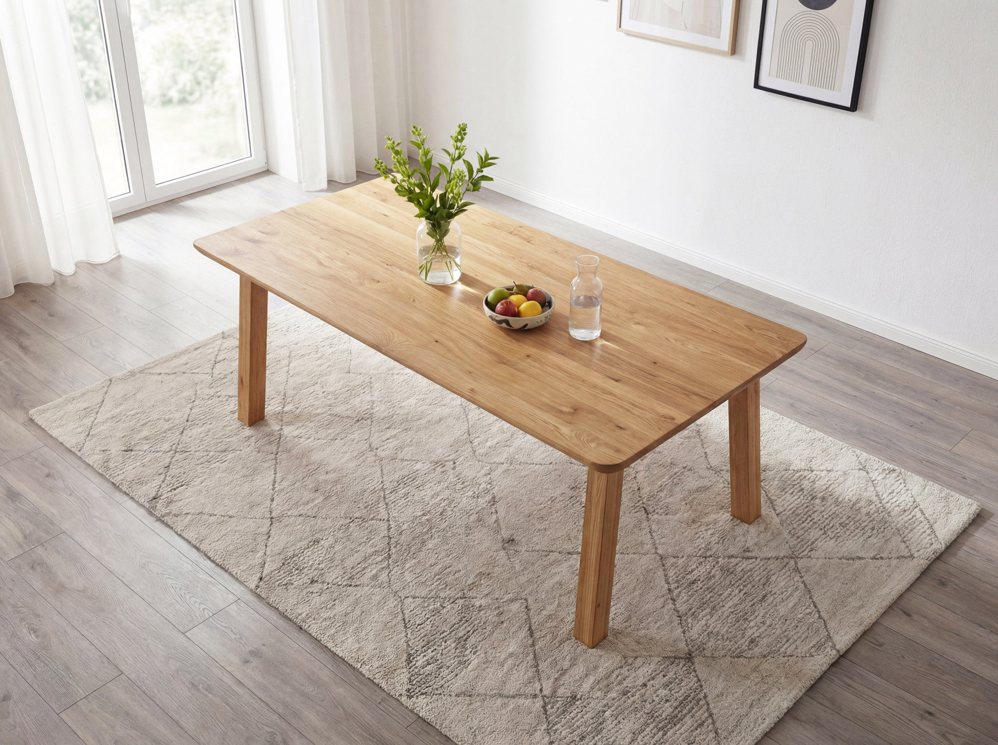 Konštrukcia stola vyniká premysleným dizajnom – nohy sú umiestnené takmer na samom okraji dosky, vďaka čomu získavate maximálny priestor pre jedálenské stoličky po celej dĺžke stola. Šikmé prevedenie nôh navyše poskytuje dostatok miesta aj za čelami stola. Hrúbka dosky 2 + 2 cm zaručuje mimoriadnu pevnosť a stabilitu celého stola. Dubový masív je tvrdé drevo, do ktorého je ťažké vytvoriť ryhy či škrabance, preto je tento stôl zárukou kvality na dlhé roky. Stôl je dodávaný v demonte s jednoduchým návodom – montáž zvládnete rýchlo a bez špeciálneho náradia.
