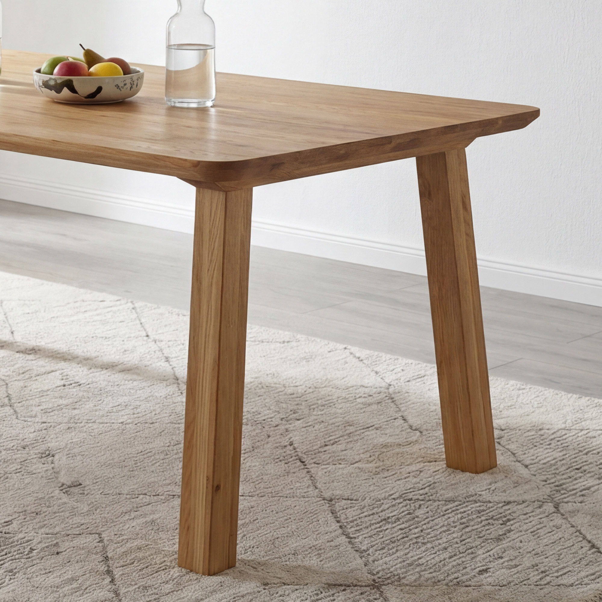 Konštrukcia stola vyniká premysleným dizajnom – nohy sú umiestnené takmer na úplnom okraji dosky, vďaka čomu získavate maximálny priestor pre jedálenské stoličky po celej dĺžke stola. Šikmé prevedenie nôh navyše poskytuje dostatok miesta aj za čelami stola. Hrúbka dosky 2 + 2 cm zaručuje mimoriadnu pevnosť a stabilitu celého stola. Dubový masív je tvrdé drevo, do ktorého je ťažké vytvoriť ryhy alebo škrabance, preto je tento stôl zárukou kvality na dlhé roky. Stôl je dodávaný v demonte s jednoduchým návodom – montáž zvládnete rýchlo a bez špeciálnych náradí.