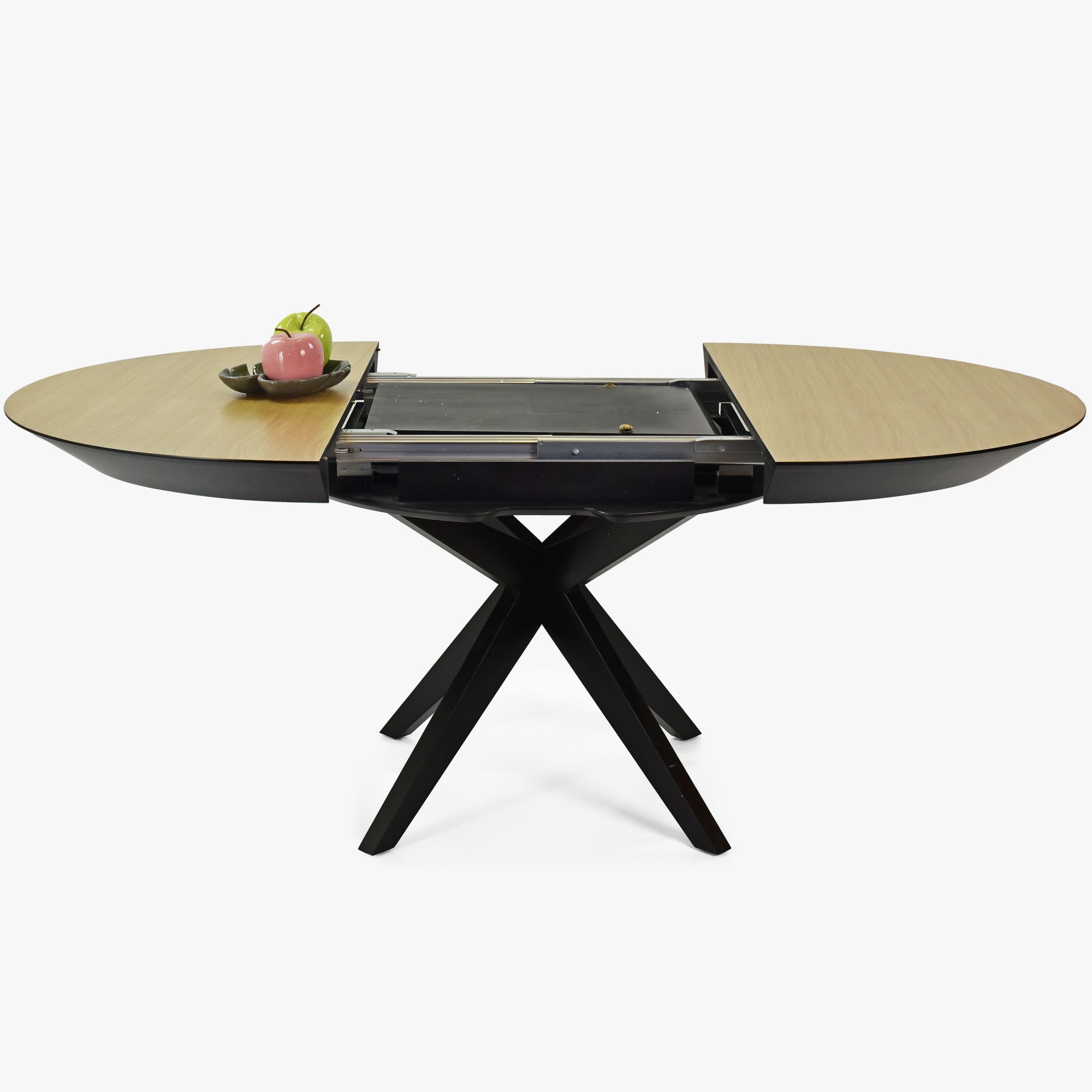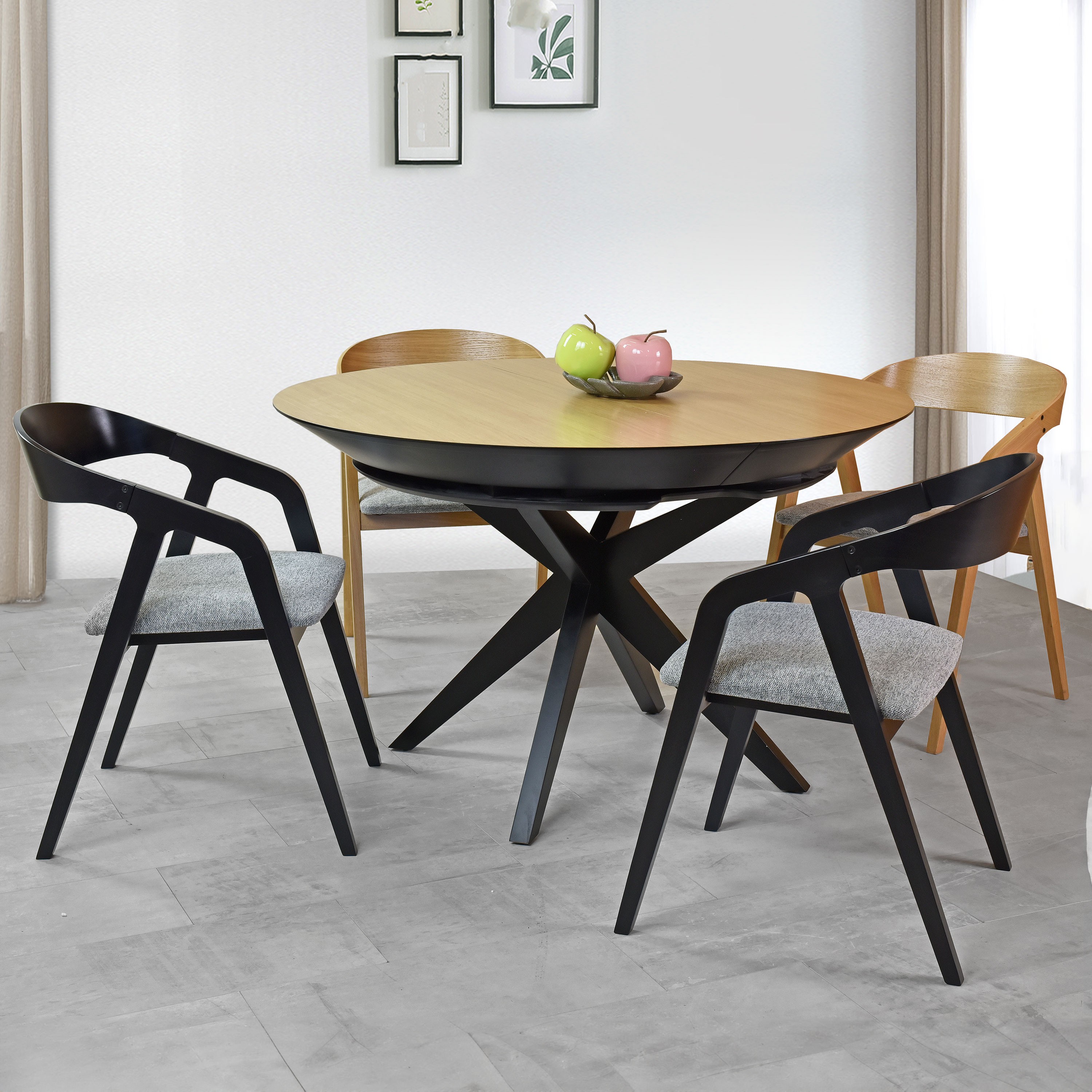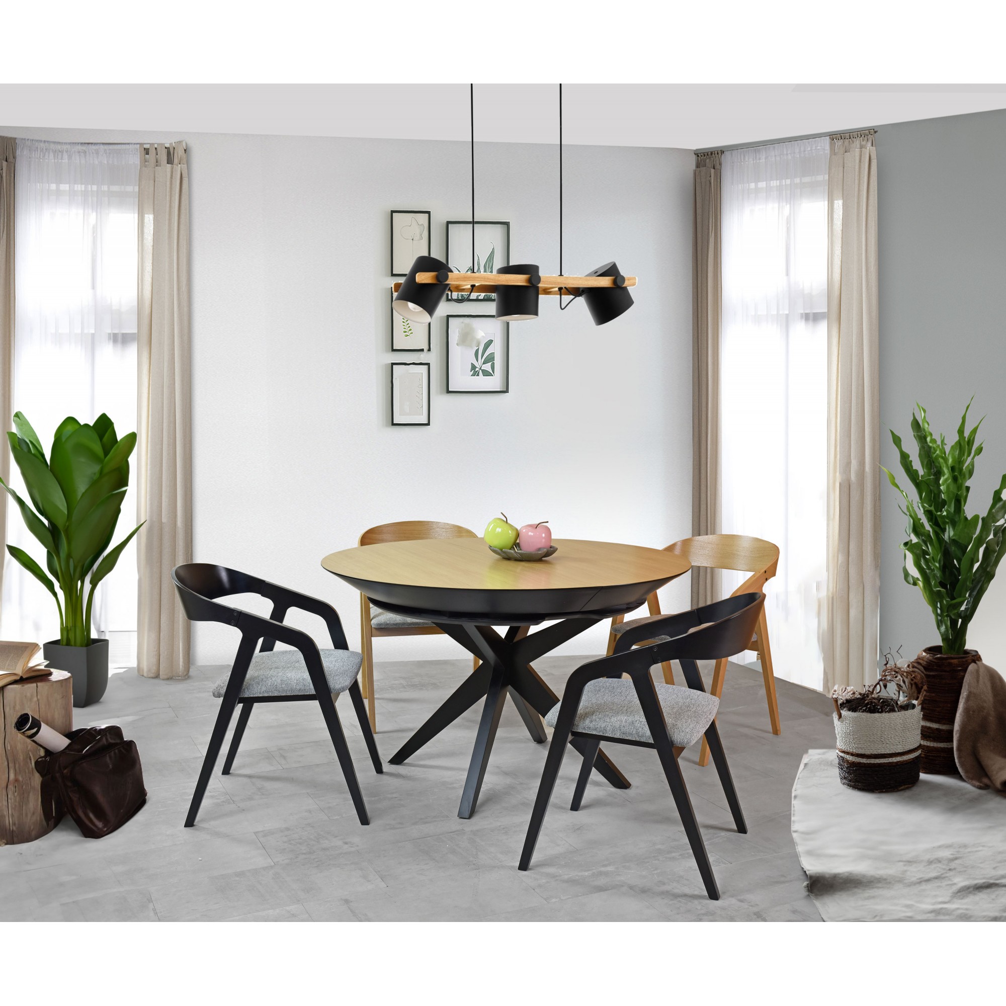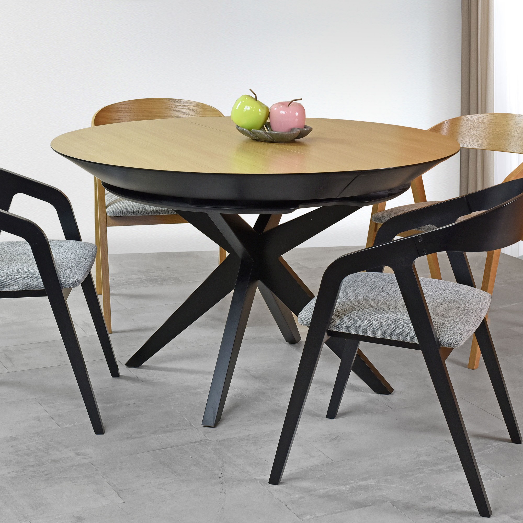 Tento guľatý jedálenský stôl predstavuje skvostnú kombináciu moderného dizajnu a praktických funkcií, čo vytvára ideálny kus nábytku pre každú domácnosť. Vyhotovený s dôrazom na detail z prírodných materiálov, tento stôl zosilňuje estetický vzhľad a funkčnosť každej jedálne. Konštrukcia a elegantne skrížené nohy stola sú vyrobené z kvalitného bukového dreva, a sú dokončené matným čiernym lakom, čo pôsobí výrazným a sofistikovaným dojmom. Priemer stola je 127 cm, po rozložení dĺžka až 227 cm.