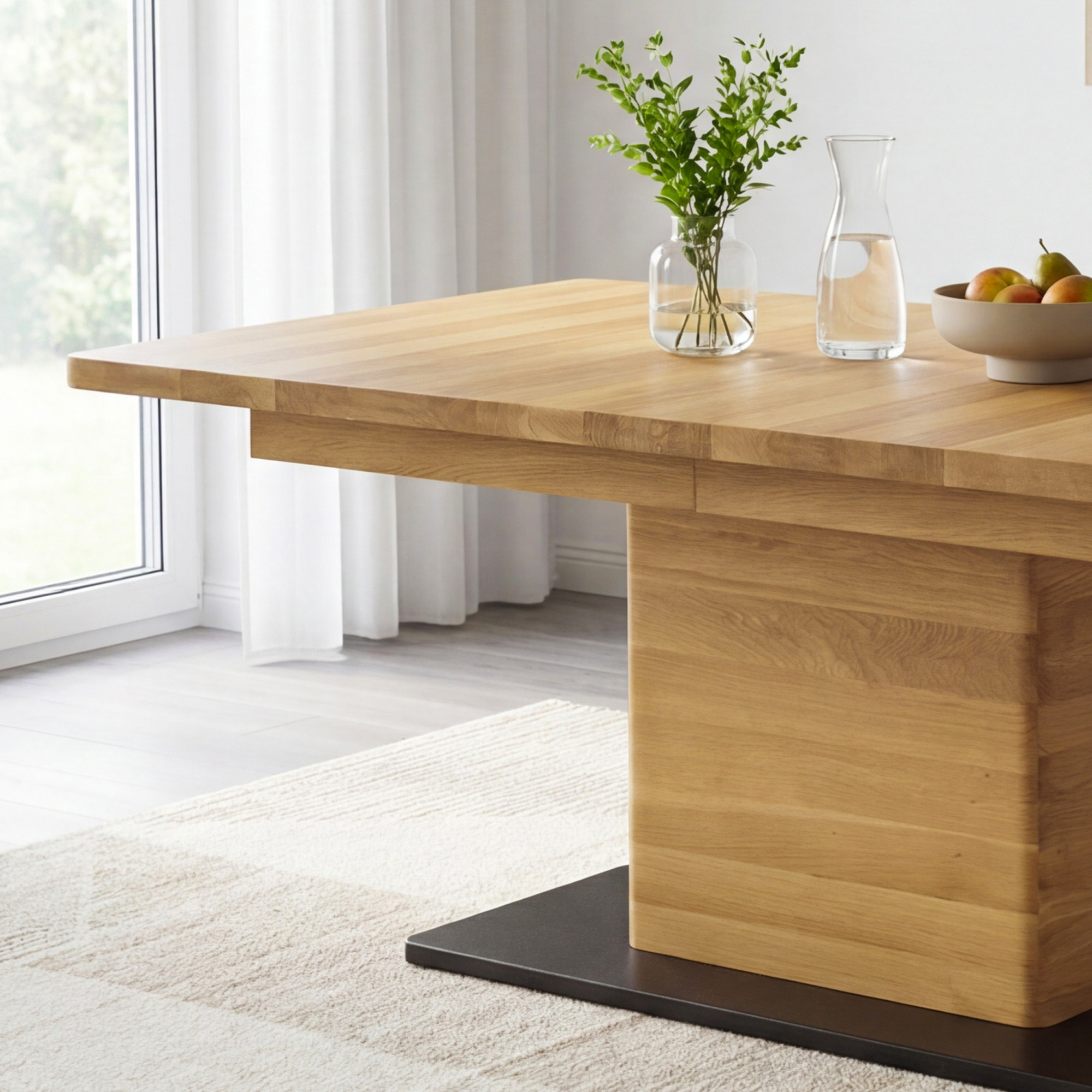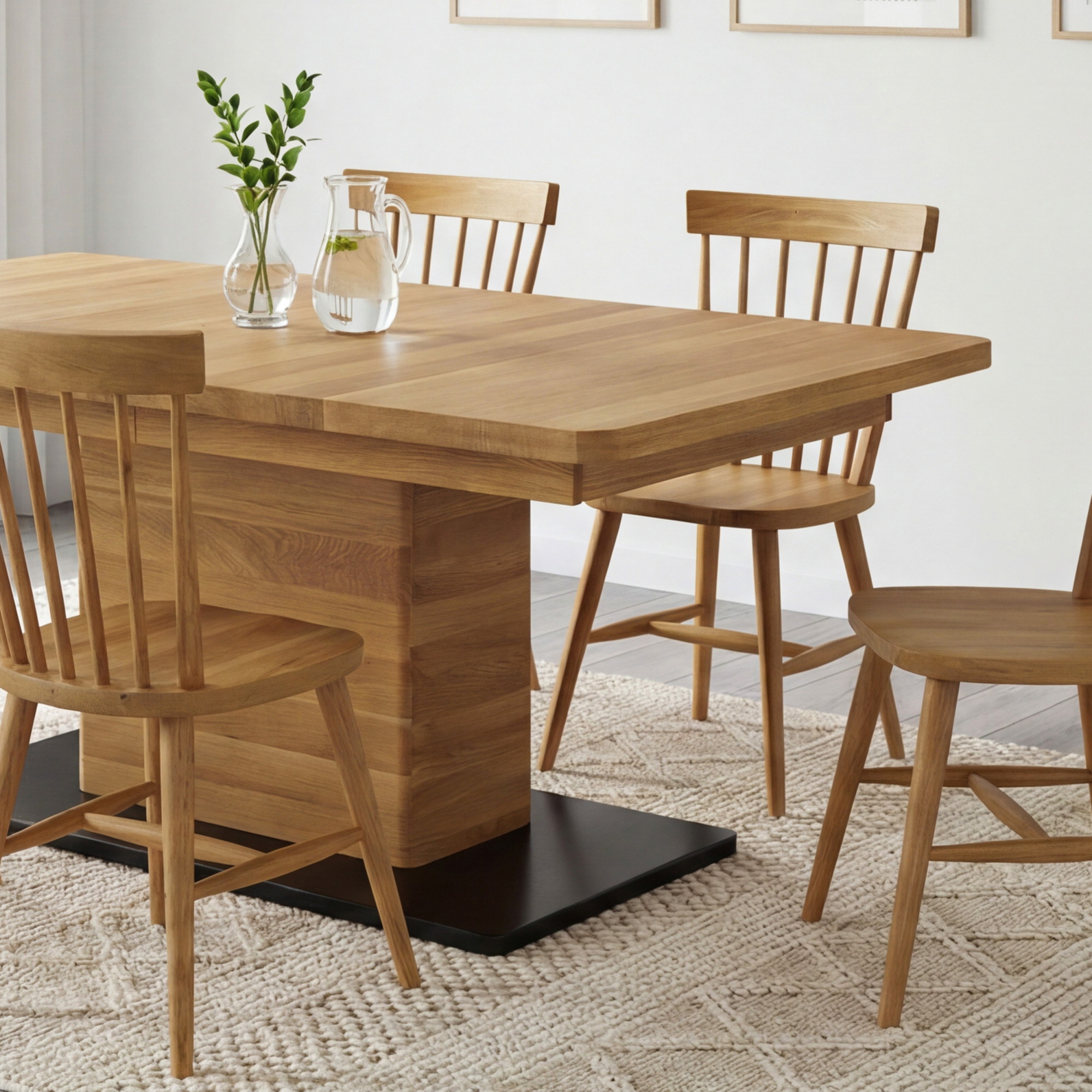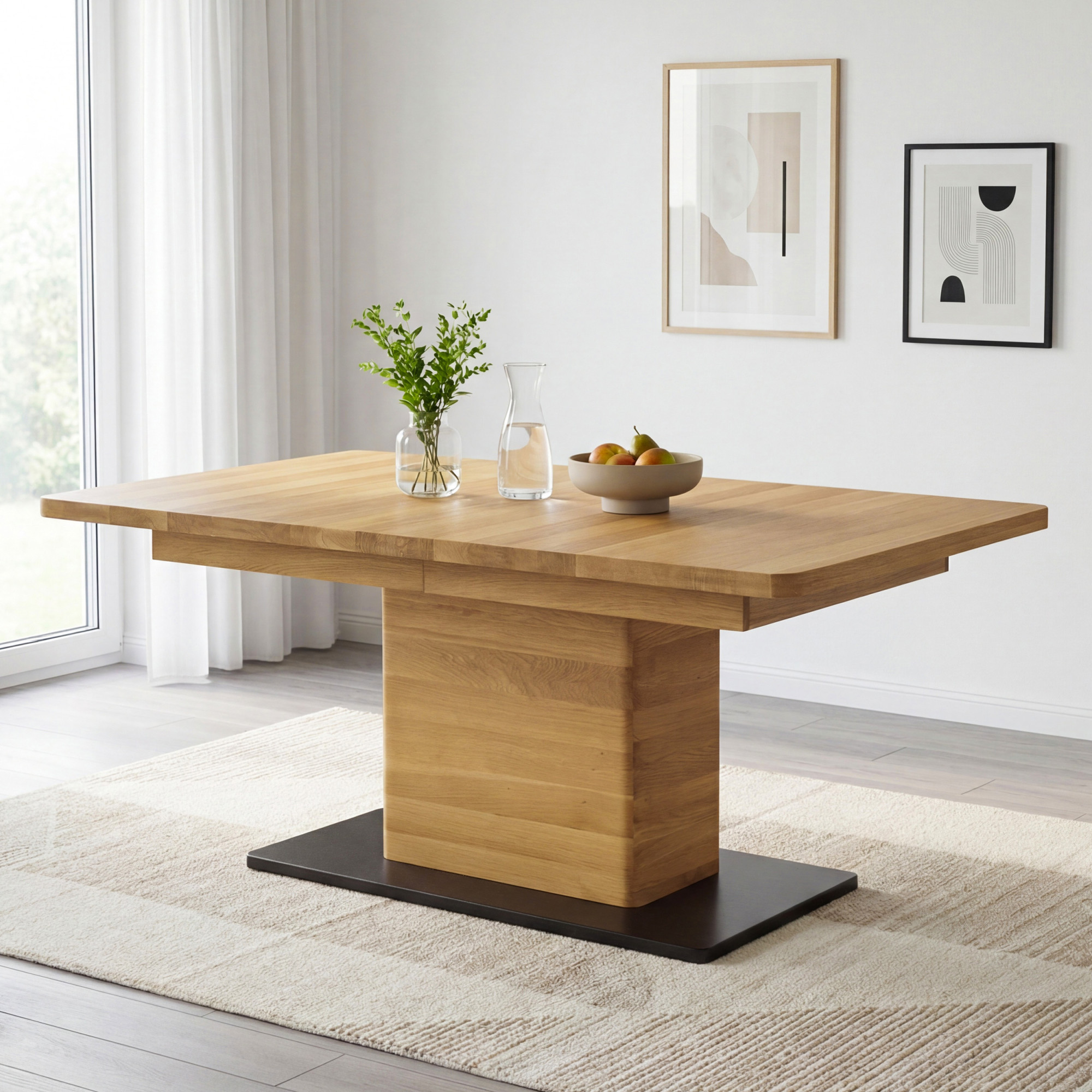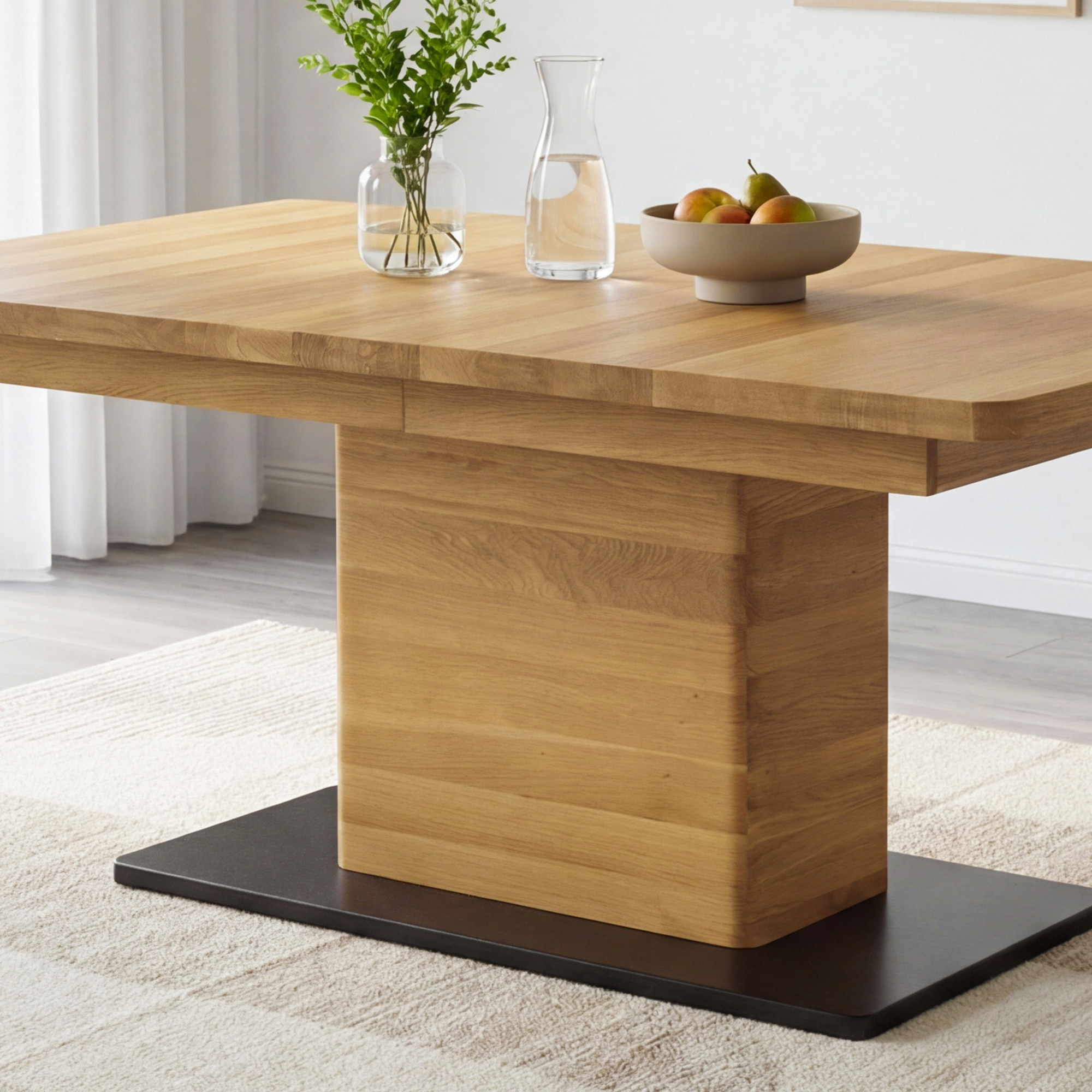 Dubový rozkladací jedálenský stôl na jednej nohe je elegantným a funkčným riešením pre každú domácnosť, ktorá hľadá kvalitný a štýlový nábytok z prírodného dreva. Tento stôl vyniká svojim moderným dizajnom, ktorý kombinuje masívne dubové drevo a čierny podstavec, čo vytvára unikátny a esteticky príťažlivý prvok vo vašom interiéri. Zaoblené rohy stola nielen pridávajú na bezpečnosti, najmä v rodinách s deťmi, ale tiež dodávajú jemnosť a eleganciu celkovému vzhľadu stola.