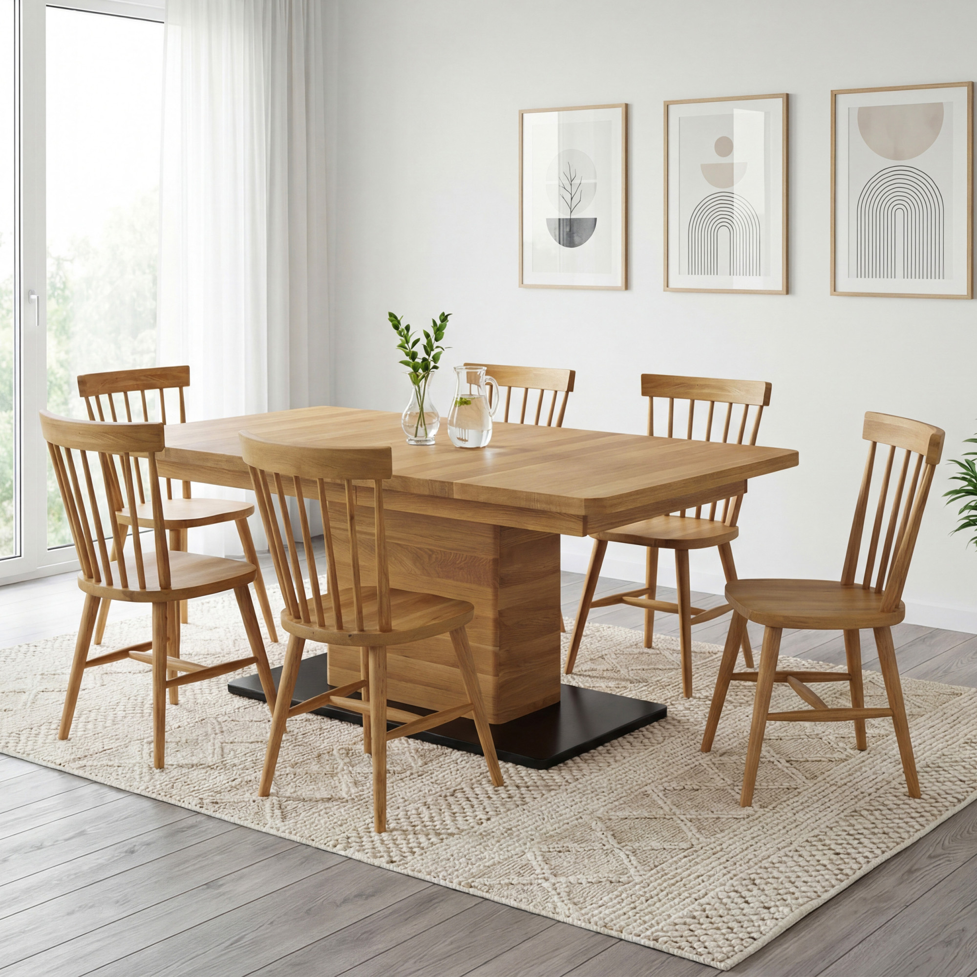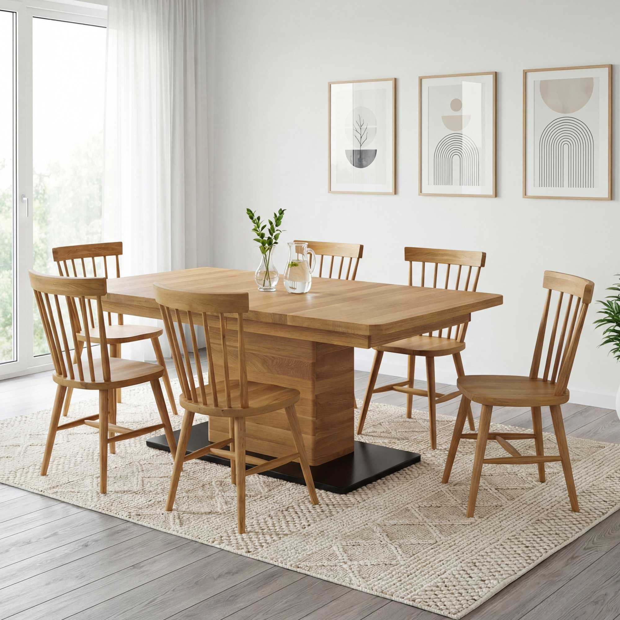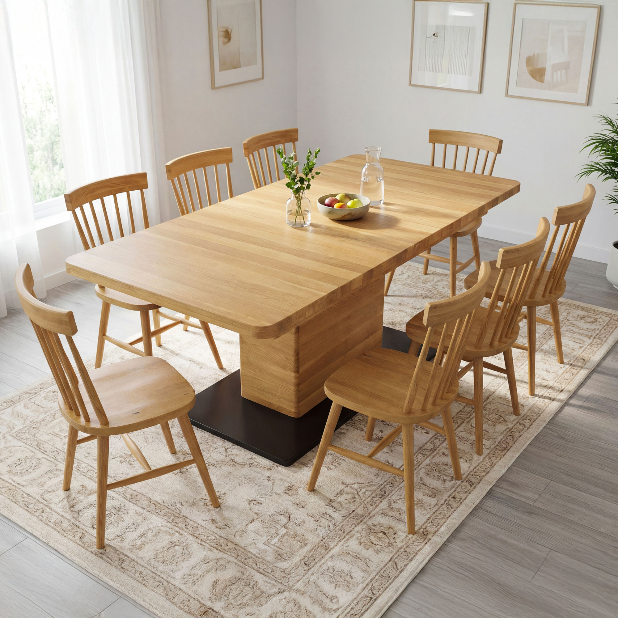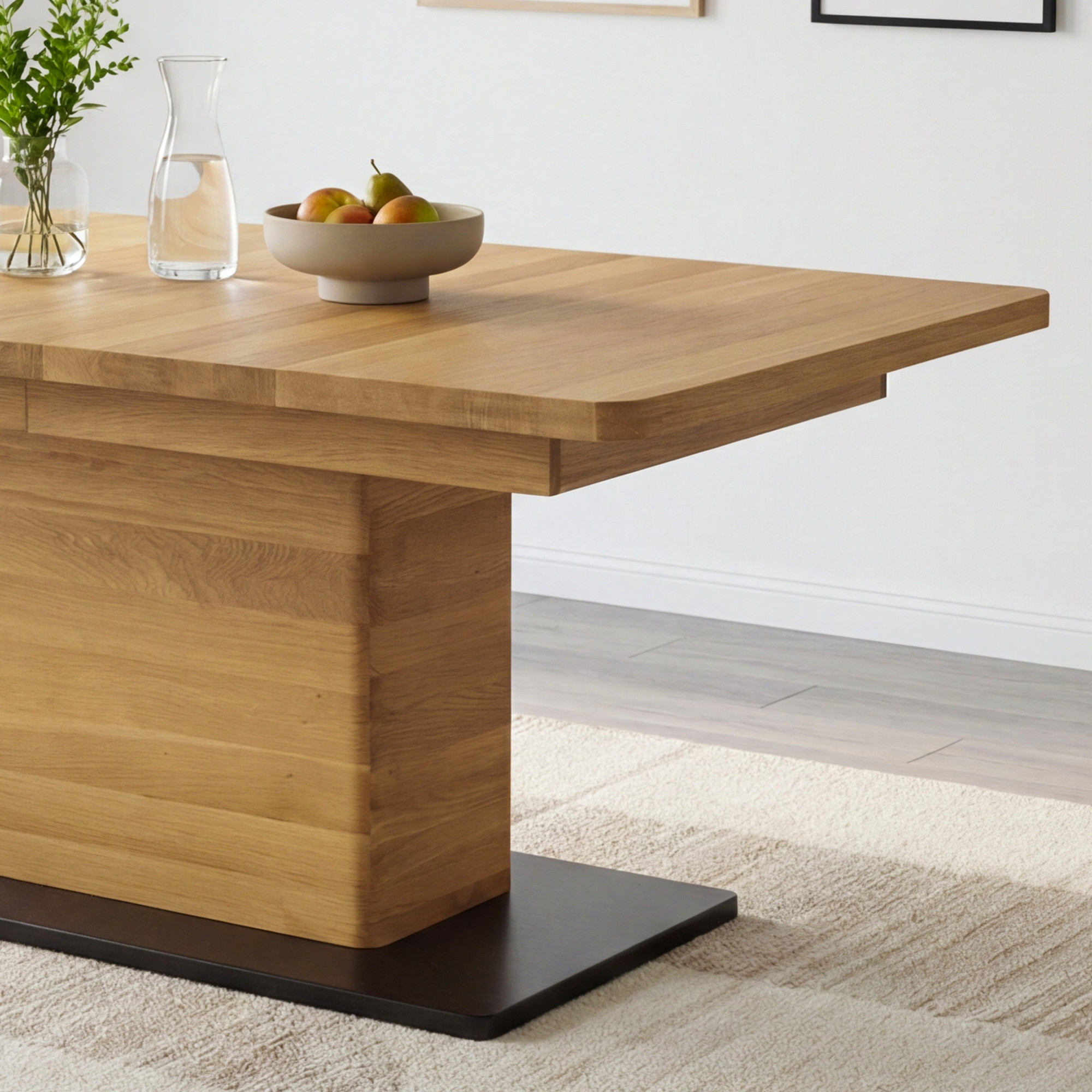 Dubový rozkladací jedálenský stôl na jednej nohe je elegantným a funkčným riešením pre každú domácnosť, ktorá hľadá kvalitný a štýlový nábytok z prírodného dreva. Tento stôl vyniká svojim moderným dizajnom, ktorý kombinuje masívne dubové drevo a čierny podstavec, čo vytvára unikátny a esteticky príťažlivý prvok vo vašom interiéri. Zaoblené rohy stola nielen pridávajú na bezpečnosti, najmä v rodinách s deťmi, ale tiež dodávajú jemnosť a eleganciu celkovému vzhľadu stola.