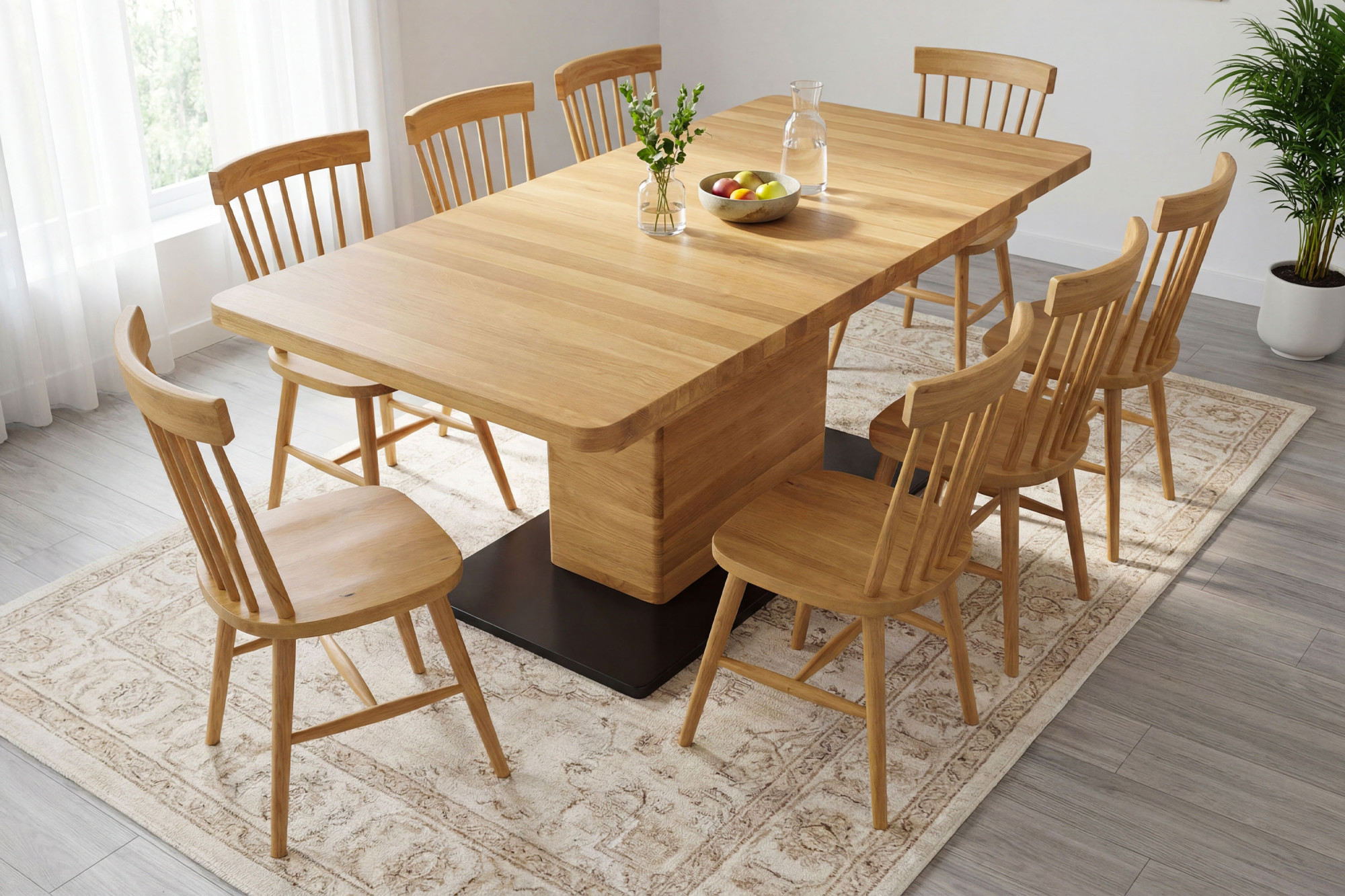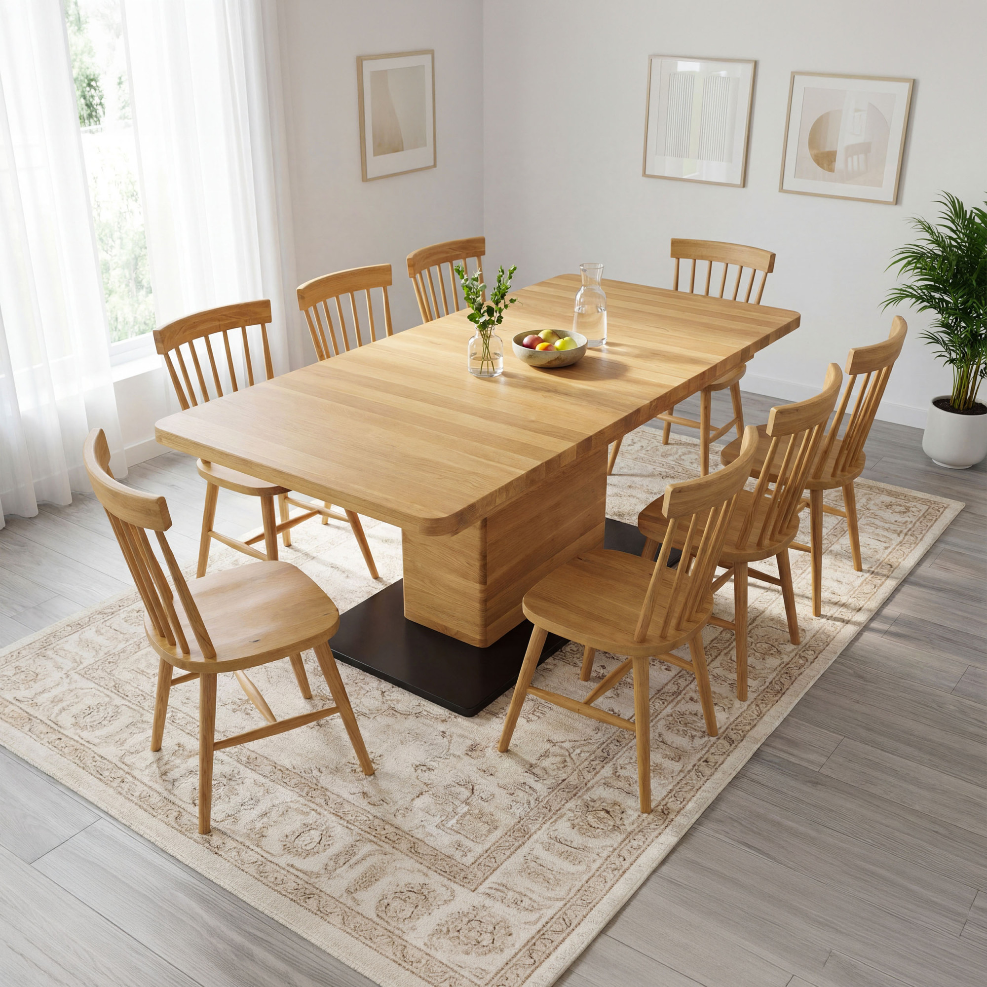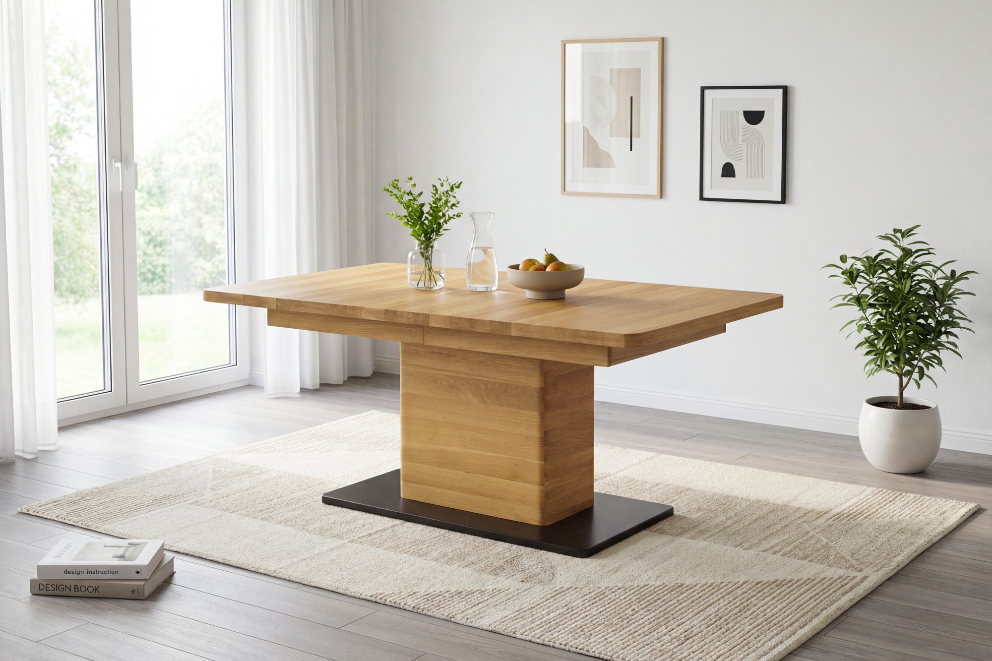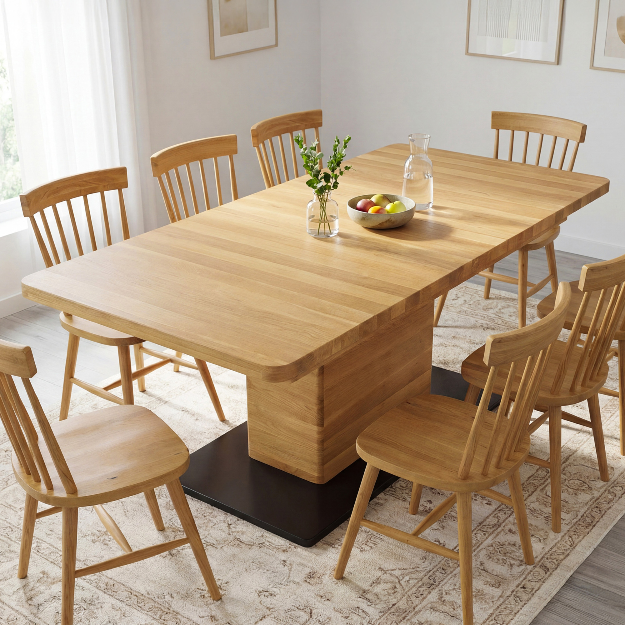 Dubový rozkladací jedálenský stôl na jednej nohe je elegantným a funkčným riešením pre každú domácnosť, ktorá hľadá kvalitný a štýlový nábytok z prírodného dreva. Tento stôl vyniká svojim moderným dizajnom, ktorý kombinuje masívne dubové drevo a čierny podstavec, čo vytvára unikátny a esteticky príťažlivý prvok vo vašom interiéri. Zaoblené rohy stola nielen pridávajú na bezpečnosti, najmä v rodinách s deťmi, ale tiež dodávajú jemnosť a eleganciu celkovému vzhľadu stola.