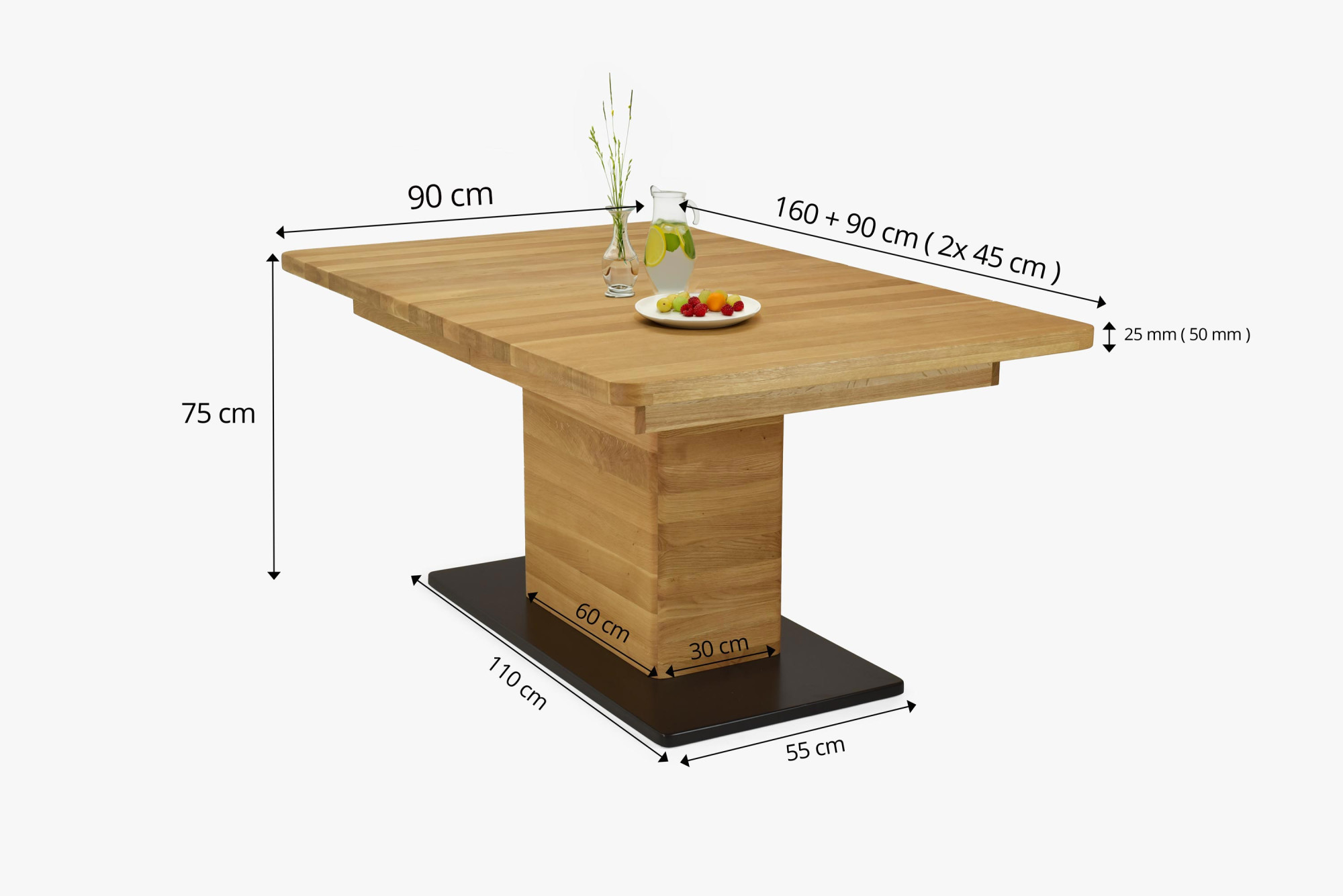 Stôl ponúka možnosť rozkladu, čo oceníte hlavne pri rodinných posedeniach alebo návštevách priateľov. Základný rozmer stola je 160 x 90 cm, čo je ideálne pre bežné denné použitie. Po rozložení, kedy je možné pridať jeden alebo dva diely, môže stôl dosiahnuť dĺžku 205 cm alebo 250 cm, čo ponúka dostatok miesta až pre 10 osôb. Rozkladací mechanizmus je starostlivo skrytý v strednej časti stola, takže nenarušuje estetiku a zostáva nenápadný, keď nie je potrebný. Výška stola je 75 cm a doska má hrúbku 25 mm, pričom opticky okraje dosky pôsobia ešte robustnejšie, s hrúbkou až 50 mm.