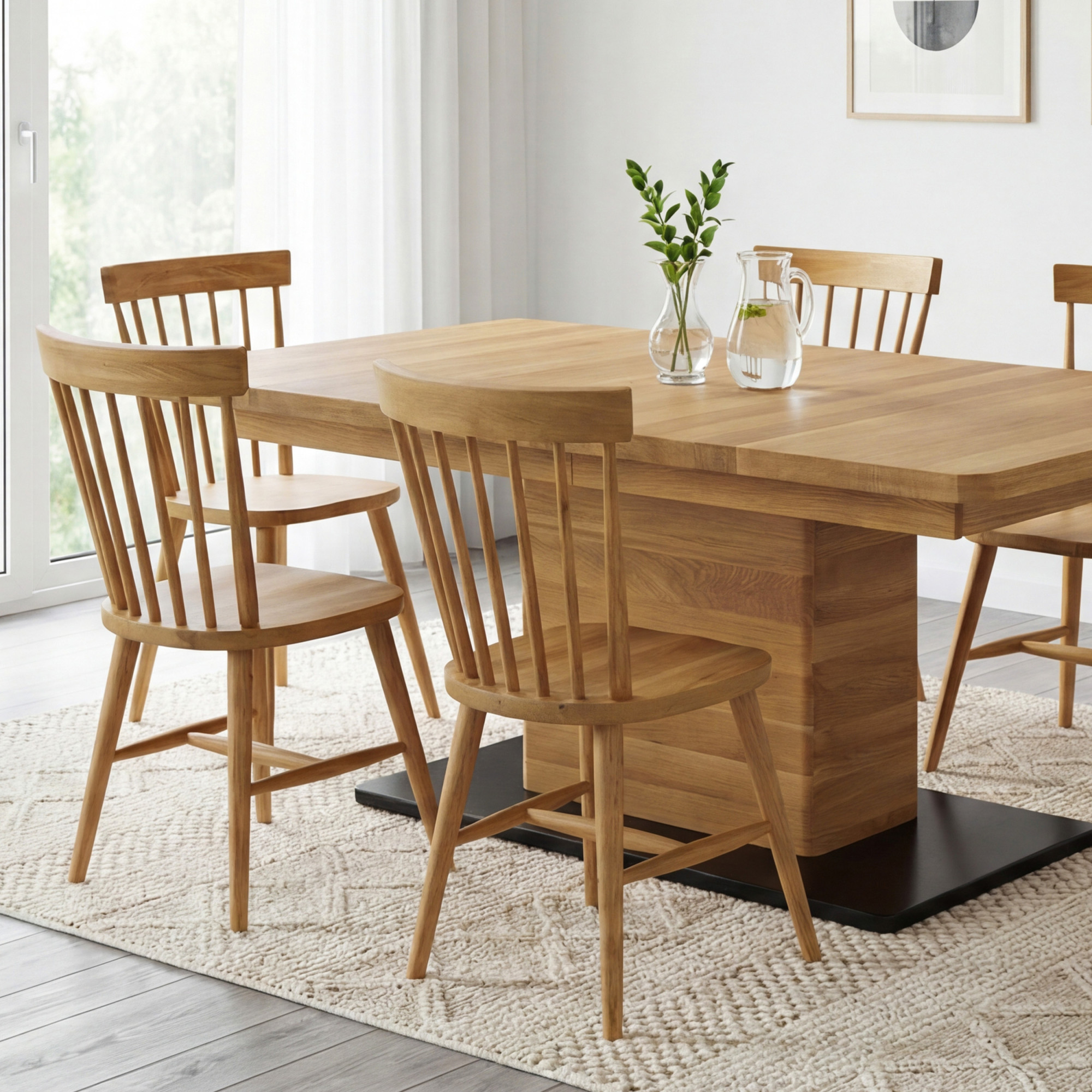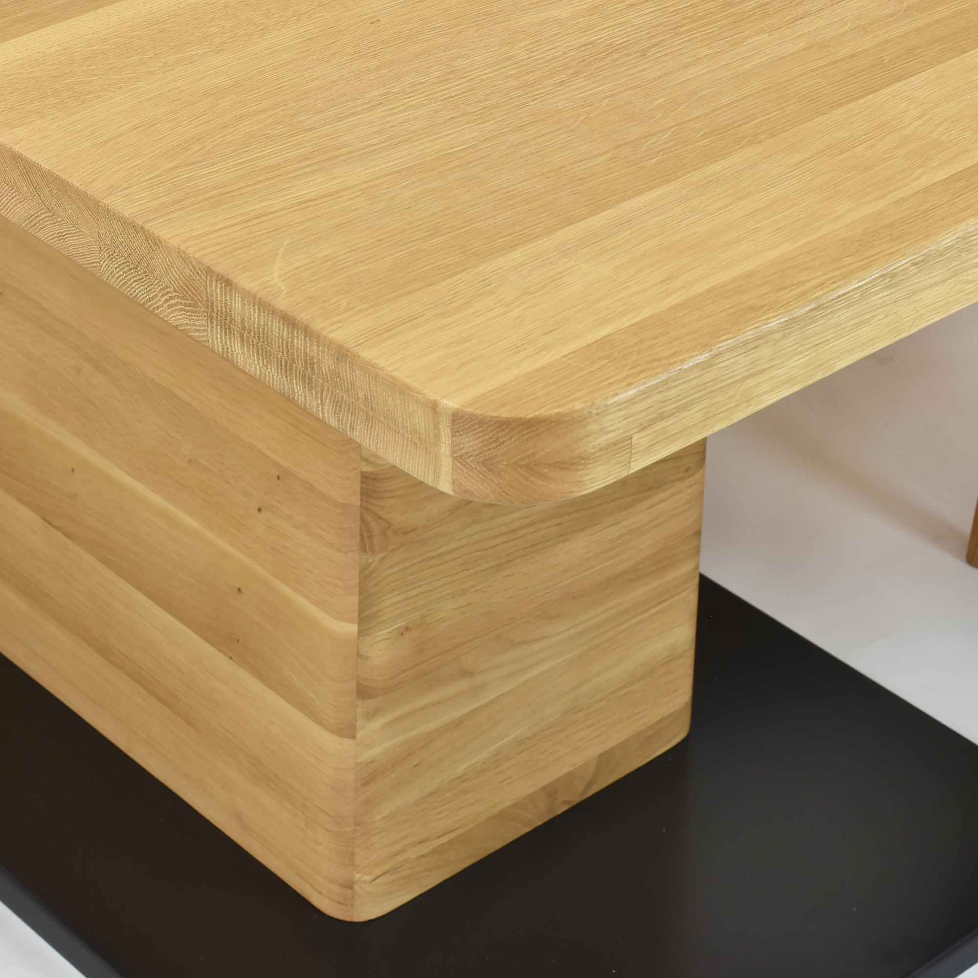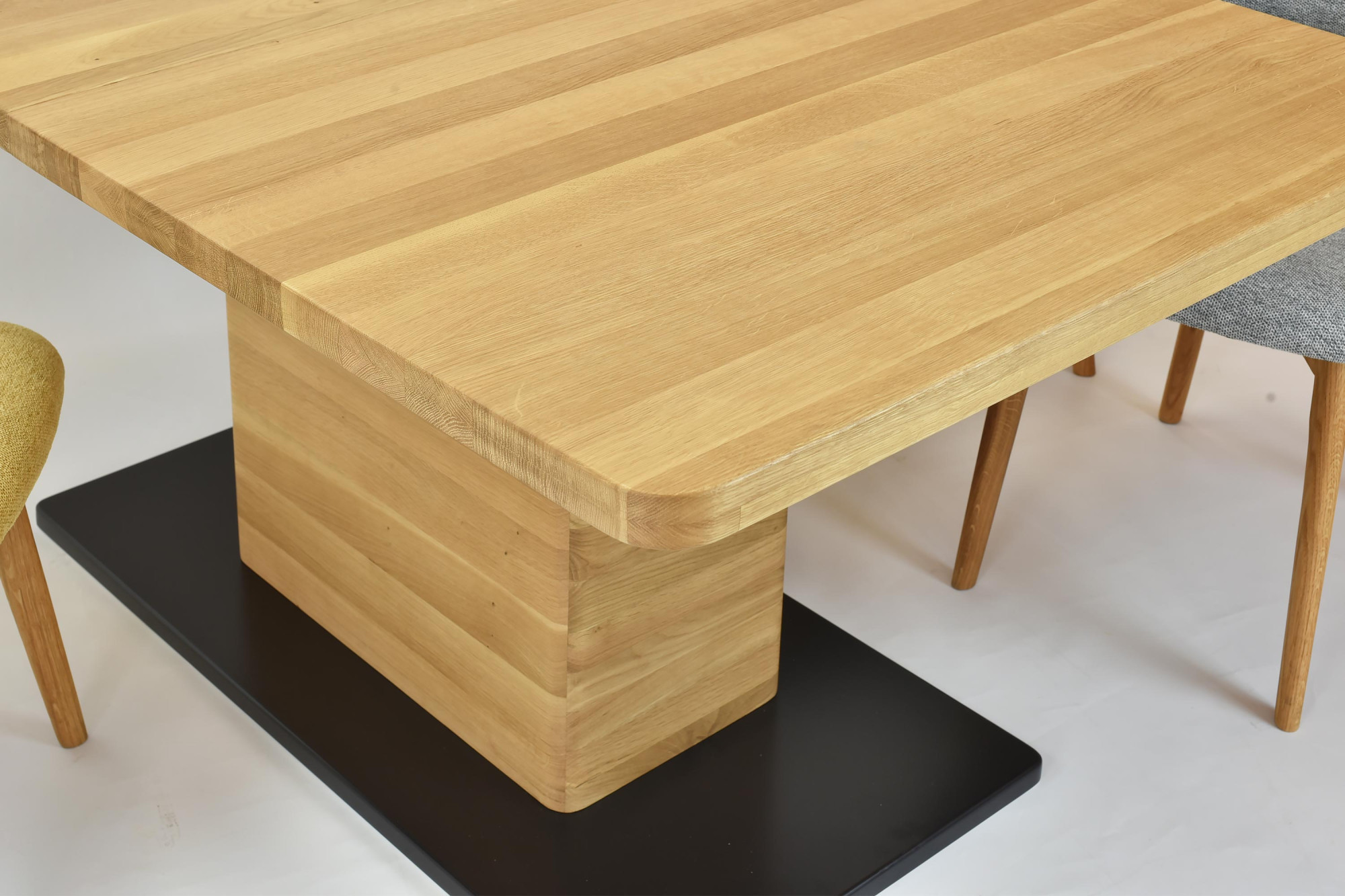 Stôl je vyrobený z kvalitného dubového dreva, ktoré je ošetrené dánskym prírodným olejom Woca, čo zabezpečuje jeho dlhú životnosť a odolnosť. Hlavnou dominantou tohto stola je jeho centrálna noha, ktorá je umiestnená na pevnom čiernom podstavci. Toto riešenie nielen umožňuje maximálne pohodlie pri sedení, ale tiež pridáva stolu moderný, minimalistický vzhľad.