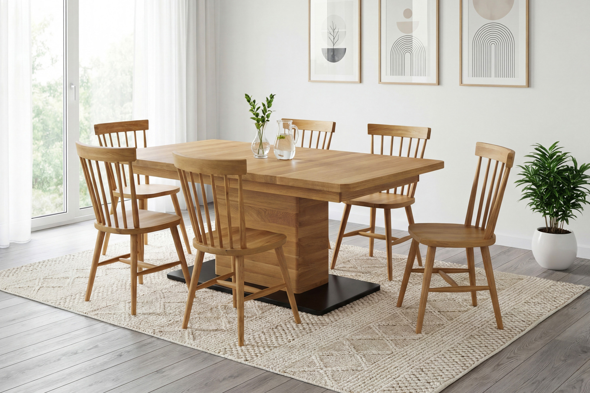 - Čierny podstavec – dodáva stolu stabilitu a elegantný kontrast s dubovým drevom.