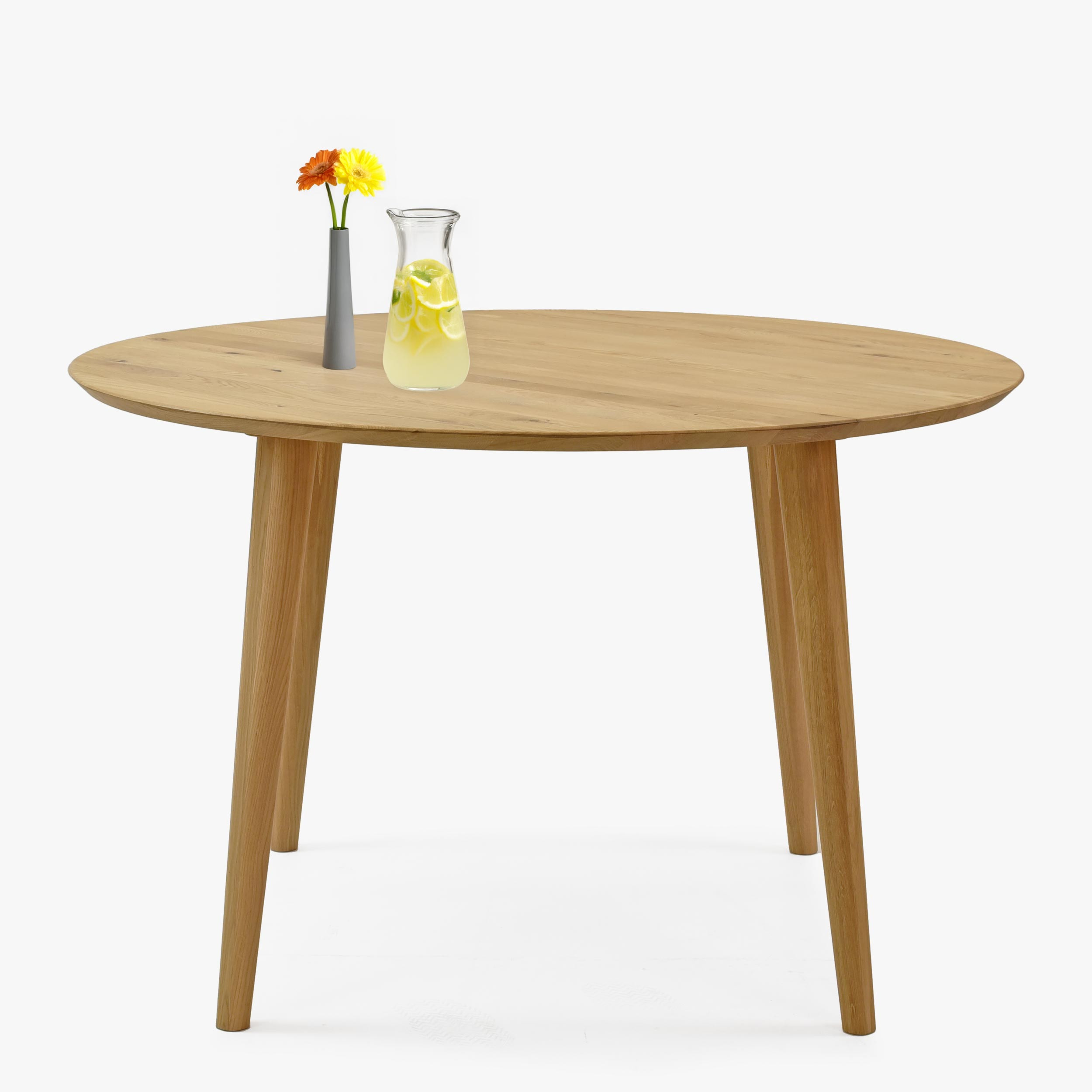 Tento dubový okrúhly stôl sa vyznačuje nielen svojím nadčasovým dizajnom, ale aj vysokou kvalitou spracovania. Vrchná doska stola je vyrobená z dubového masívu s hrúbkou 25 mm, čo zaručuje jej pevnosť a odolnosť. Nohy stola sú elegantne tvarované s mierne valcovitým profilom, ktorý dodáva stolu stabilitu a zároveň podčiarkuje jeho moderný vzhľad. Povrchová úprava olejom nielen chráni drevo, ale tiež zvýrazňuje jeho prirodzenú krásu a kresbu. Dubový okrúhly stôl sa dodáva v demonte, ale jeho montáž je veľmi jednoduchá a zvládne ju každý.