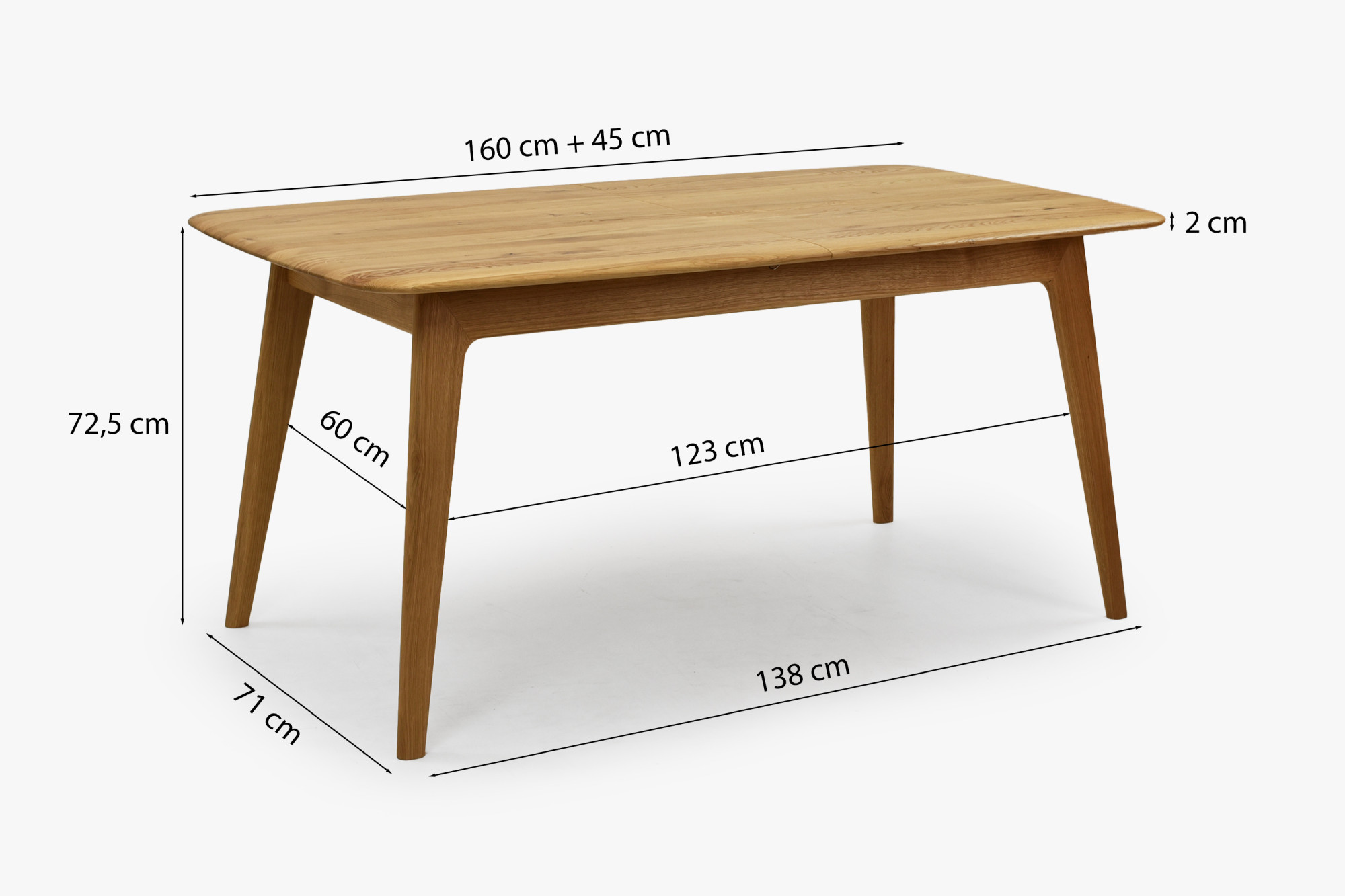 Stôl je rozkladací – jeho pôvodná dĺžka 160 cm sa ľahko predĺži o ďalších 45 cm vďaka skrytému rozkladaciemu mechanizmu, a vznikne tak plocha o rozmere 205 x 90 cm. Túto funkciu oceníte najmä pri stretnutiach s rodinou alebo priateľmi. Vďaka robustnej konštrukcii z masívu je zabezpečená vysoká stabilita a pevnosť. Montáž je veľmi jednoduchá, keďže stôl je dodávaný v demontovanom stave so zrozumiteľným návodom. Vďaka svojmu elegantnému dizajnu sa hodí ako do moderných, tak i tradičných interiérov a ľahko sa kombinuje s ďalšími výrobkami z dubového dreva.