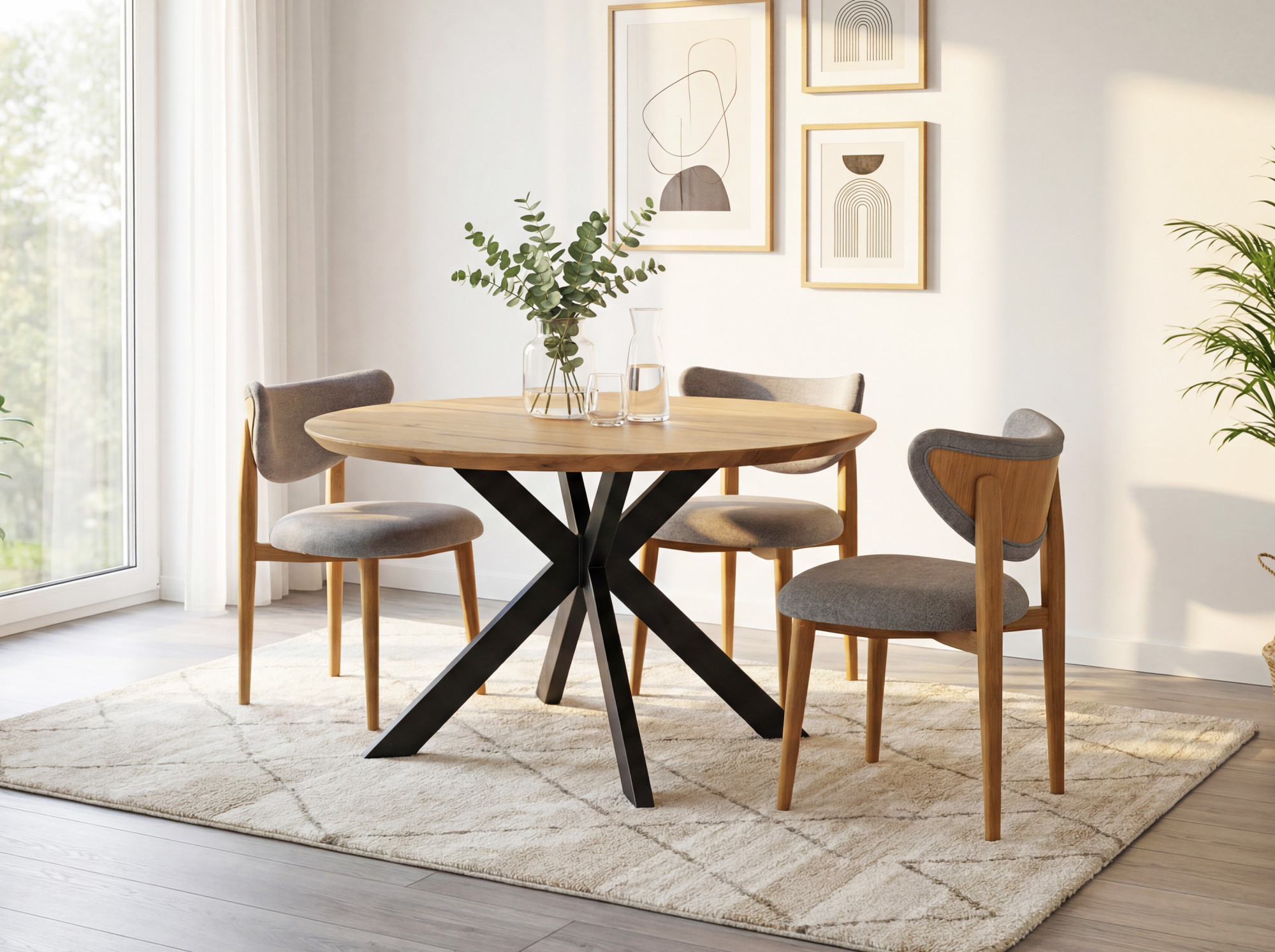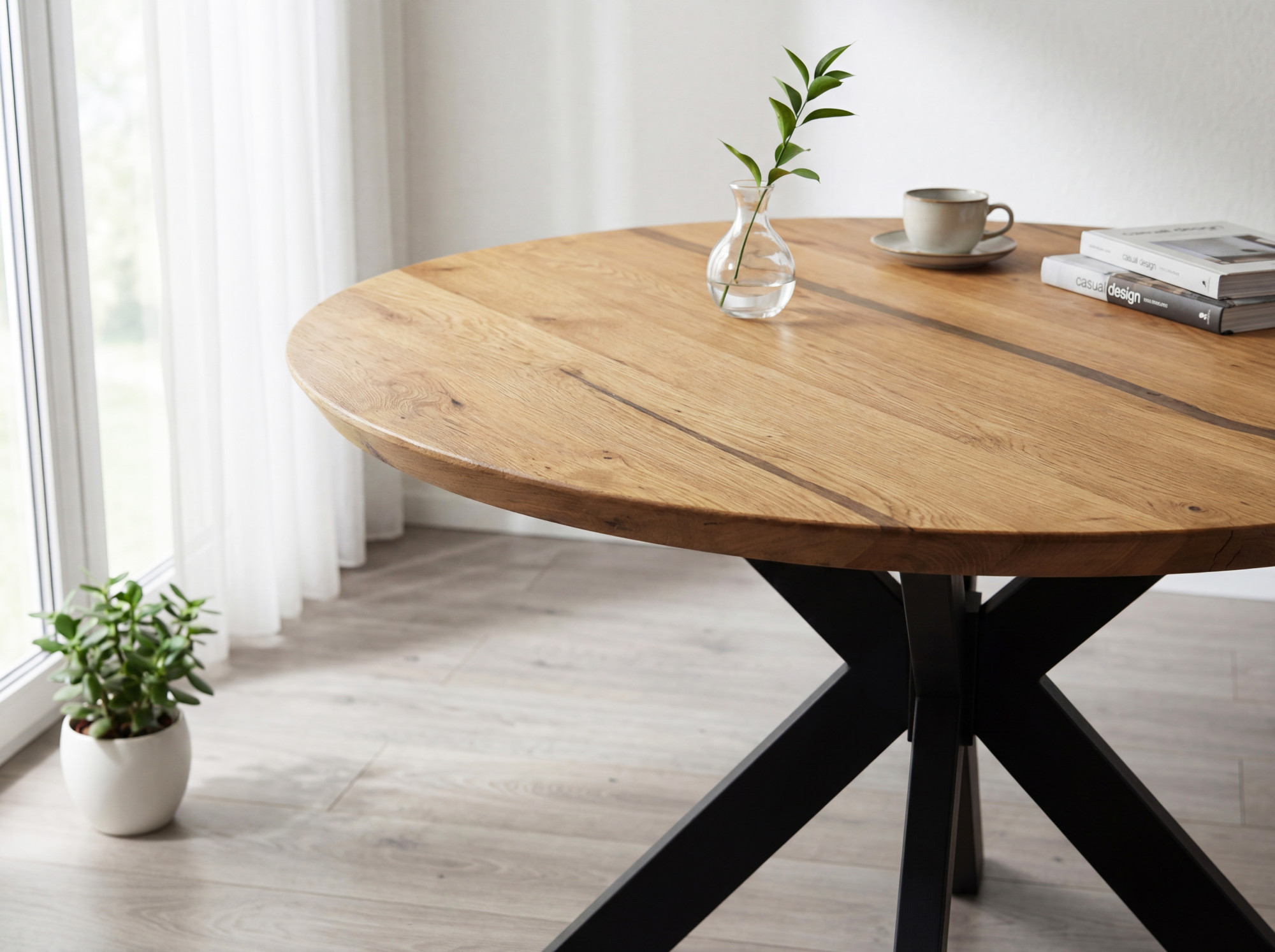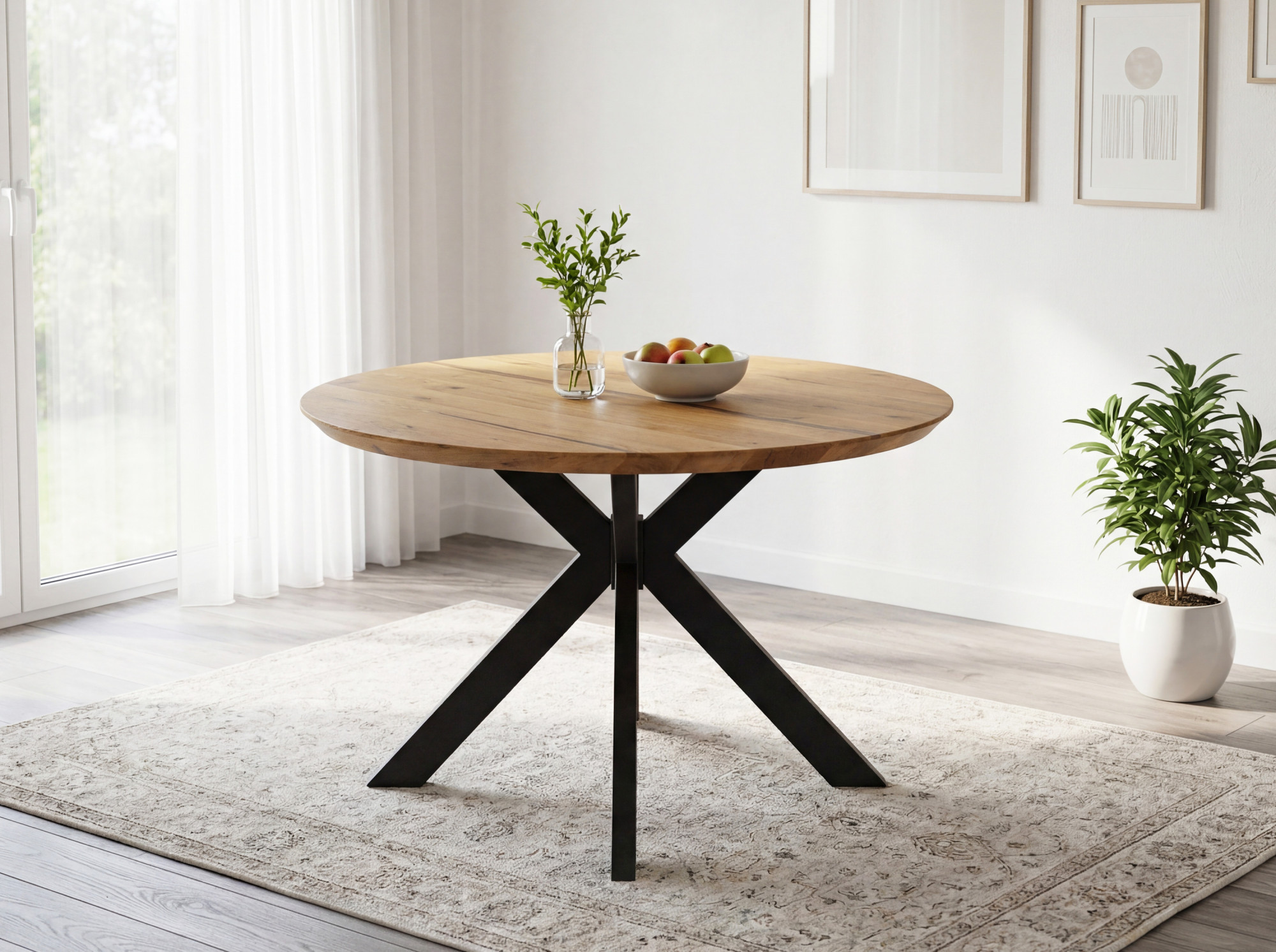 Kulatý jedálenský stôl dub + epoxid spája poctivý prírodný materiál s moderným spracovaním. Doska o priemere 120 cm a hrúbke až 4 cm je vyrobená z masívneho dubového dreva, ktoré vyniká dlhou životnosťou, stabilitou a nezameniteľnou kresbou. Transparentná epoxidová živica elegantne dopĺňa dub a vytvára jedinečný dizajnový prvok – každý kus je originál. Povrch je ošetrený prírodným olejom v odtieni Dub Natural, ktorý zvýrazňuje štruktúru dreva a umožňuje jednoduchú lokálnu obnovu. Konštrukciu dopĺňajú kovové nohy v čiernej farbe, ktoré zabezpečujú pevnosť a vizuálnu ľahkosť.