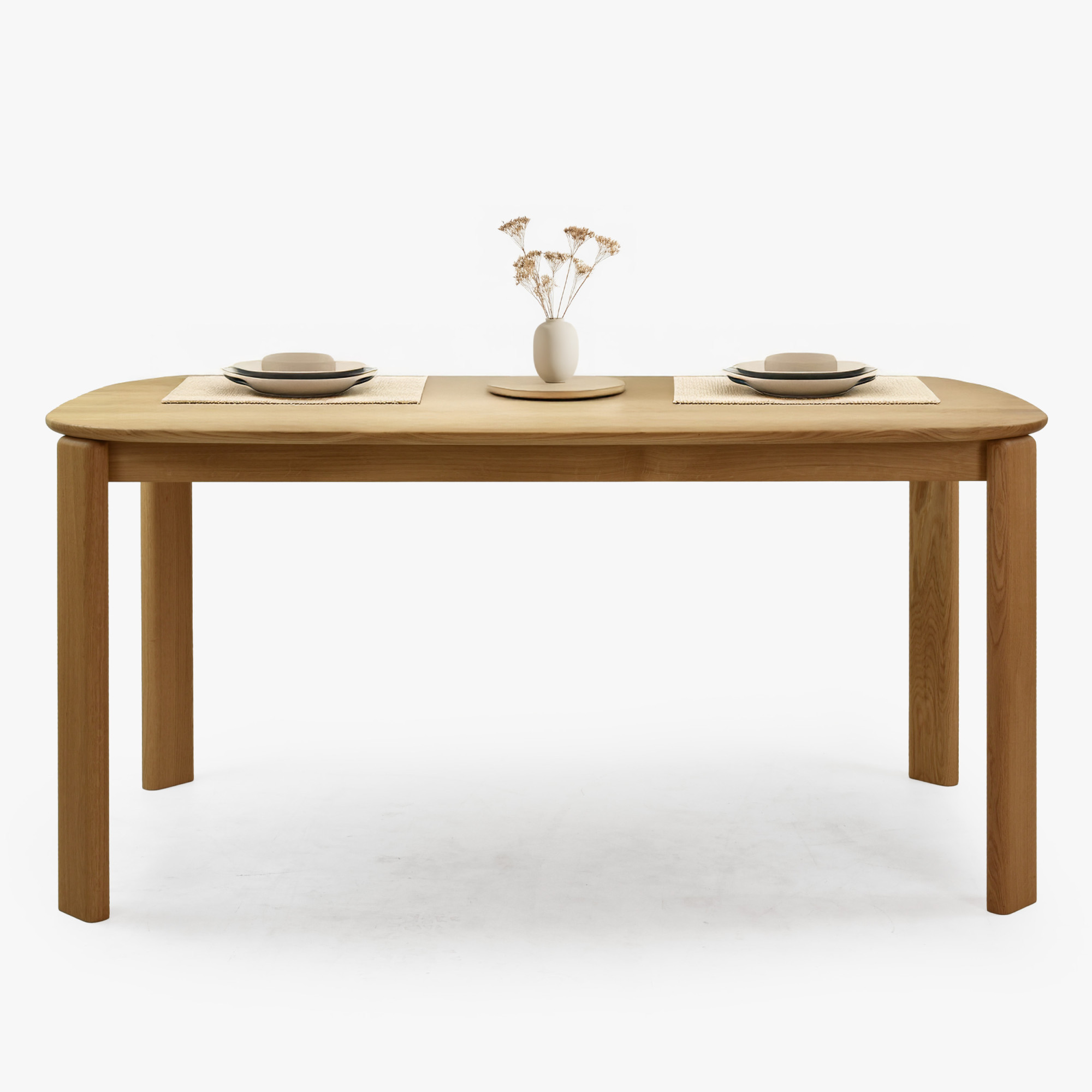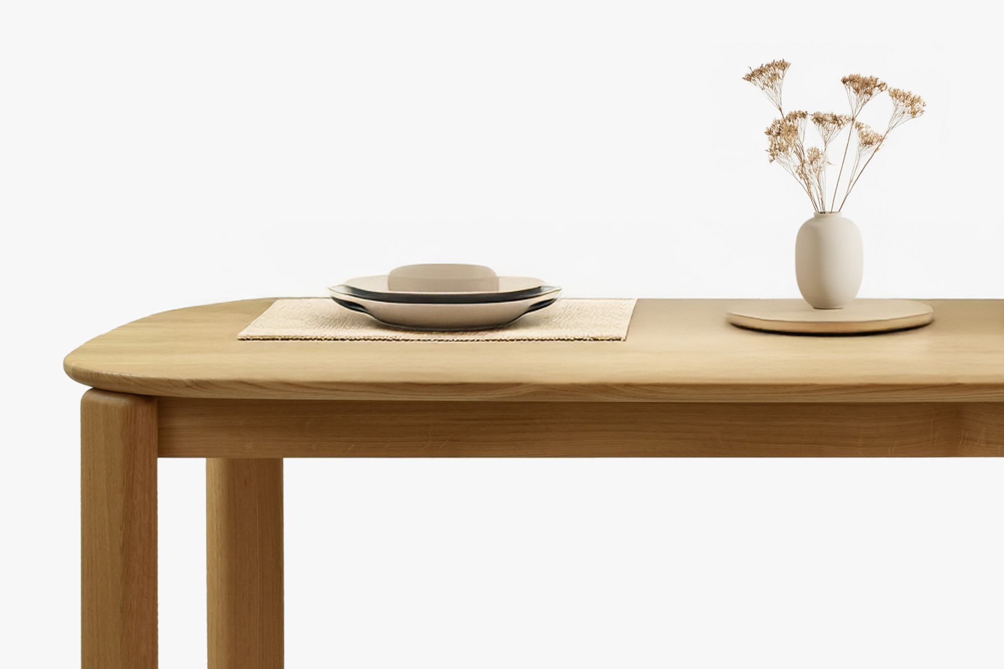Dubový jedálenský stôl model Robi sa vyznačuje oválno-okrúhlym tvarom, ktorý ponúka dostatok miesta na stolovanie a zároveň nepôsobí masívne. Vrchná doska s hrúbkou 20 mm je z vybraného dubového dreva s FSC certifikátom, čo zaručuje ohľaduplnosť k prírode a dlhú životnosť. Povrch je ošetrený talianskym olejom Borma Wachs v odtieni dub natural, ktorý zvýrazňuje prirodzenú kresbu a chráni pred vlhkosťou i opotrebením. Stôl má zaoblené hrany, čo ocenia najmä rodiny s deťmi.