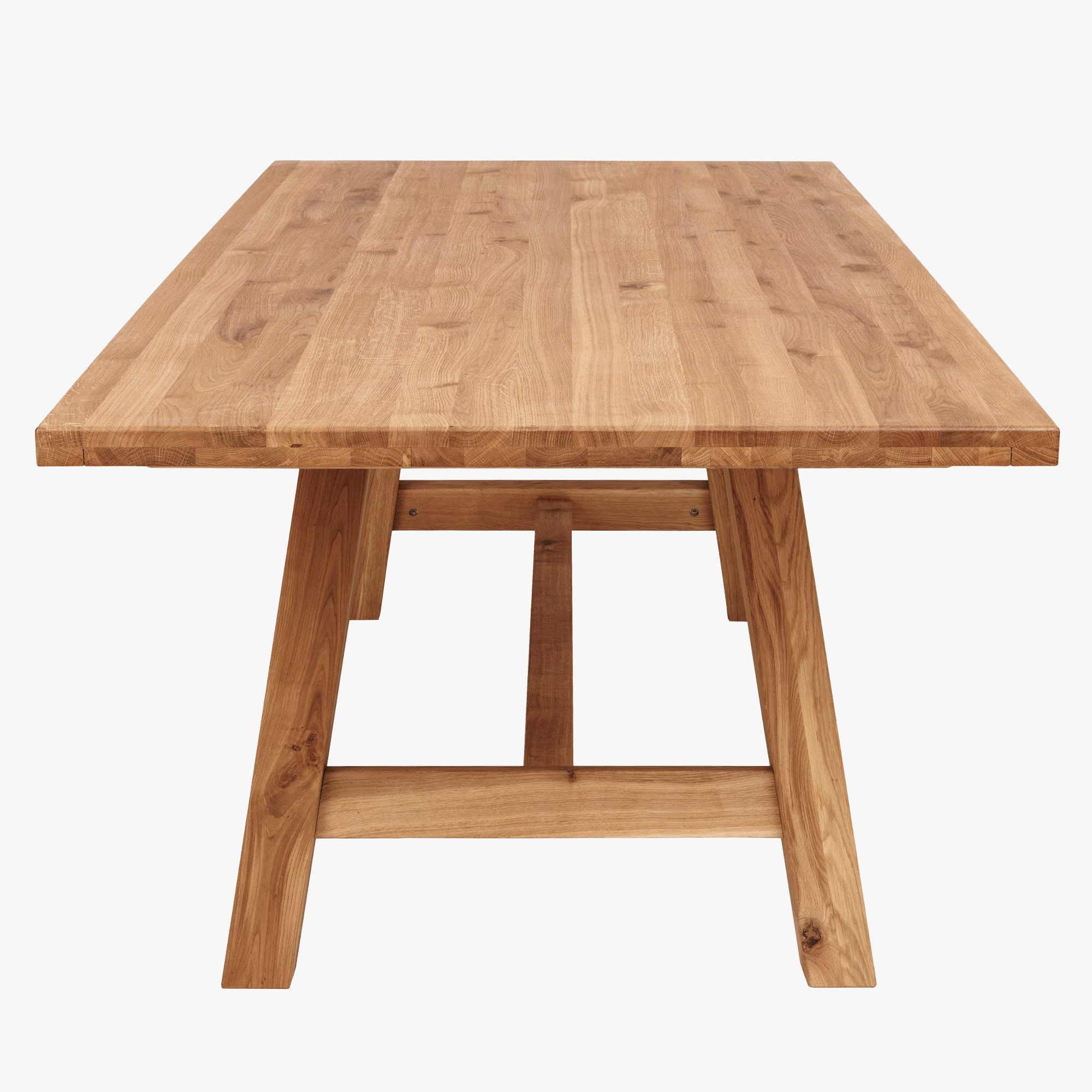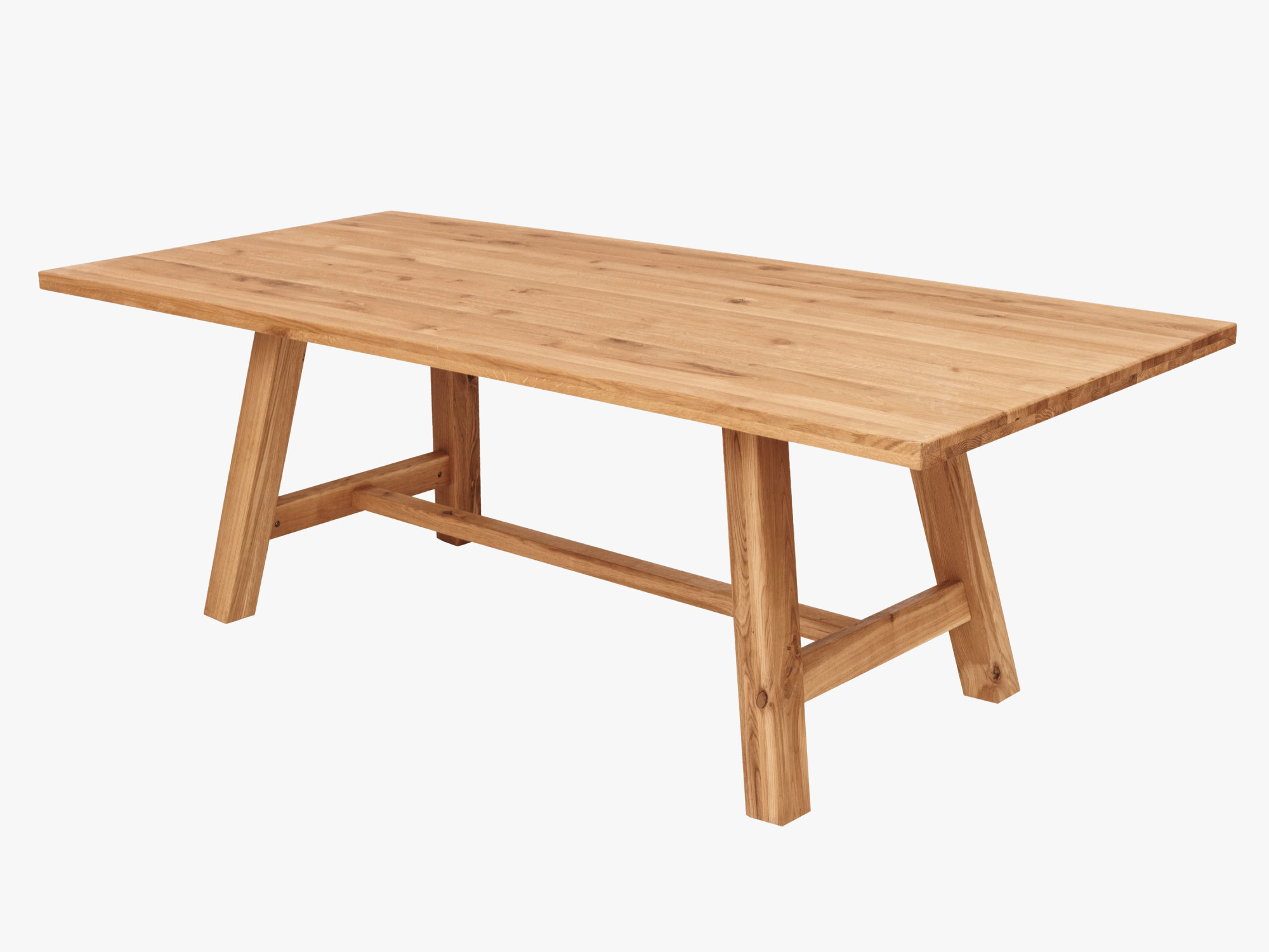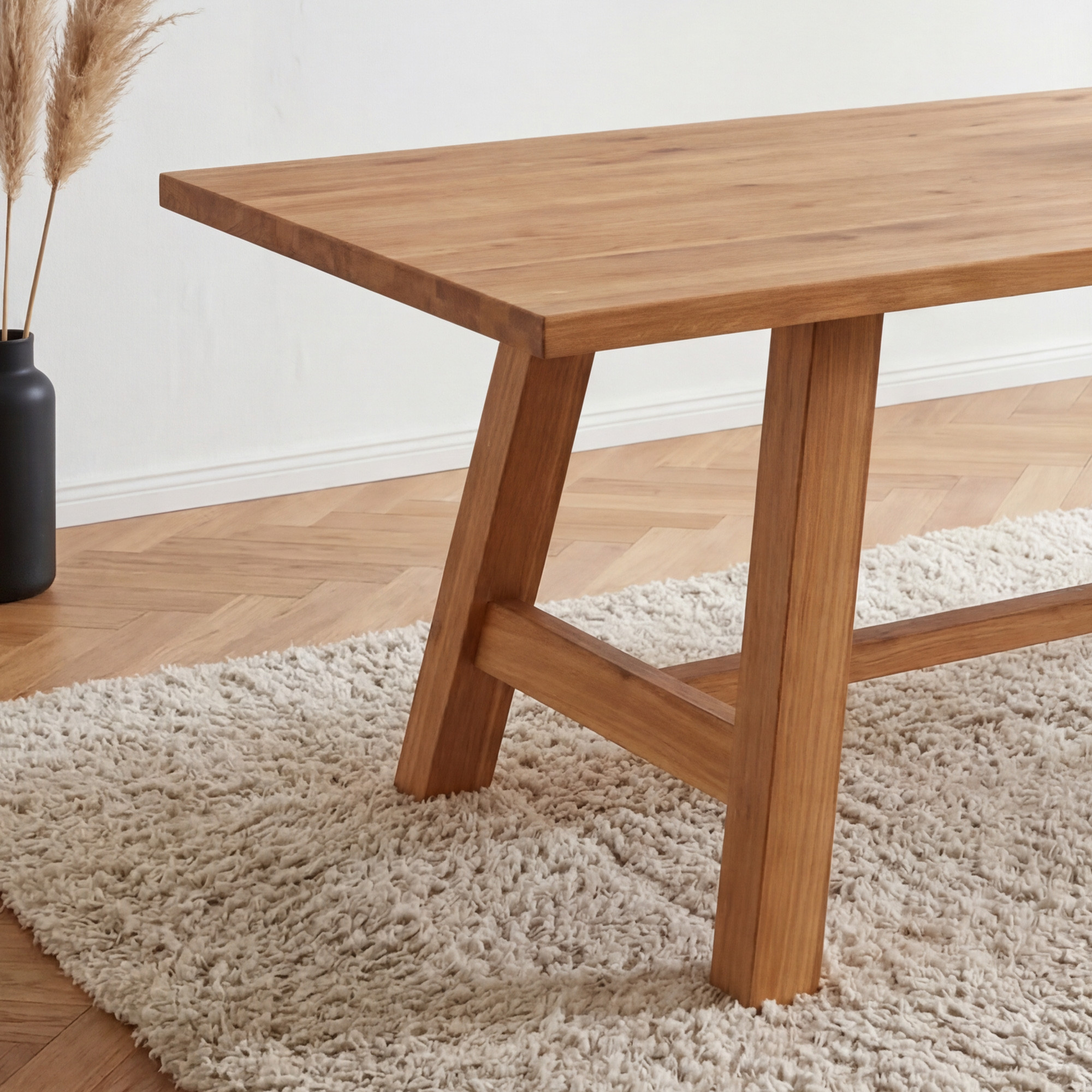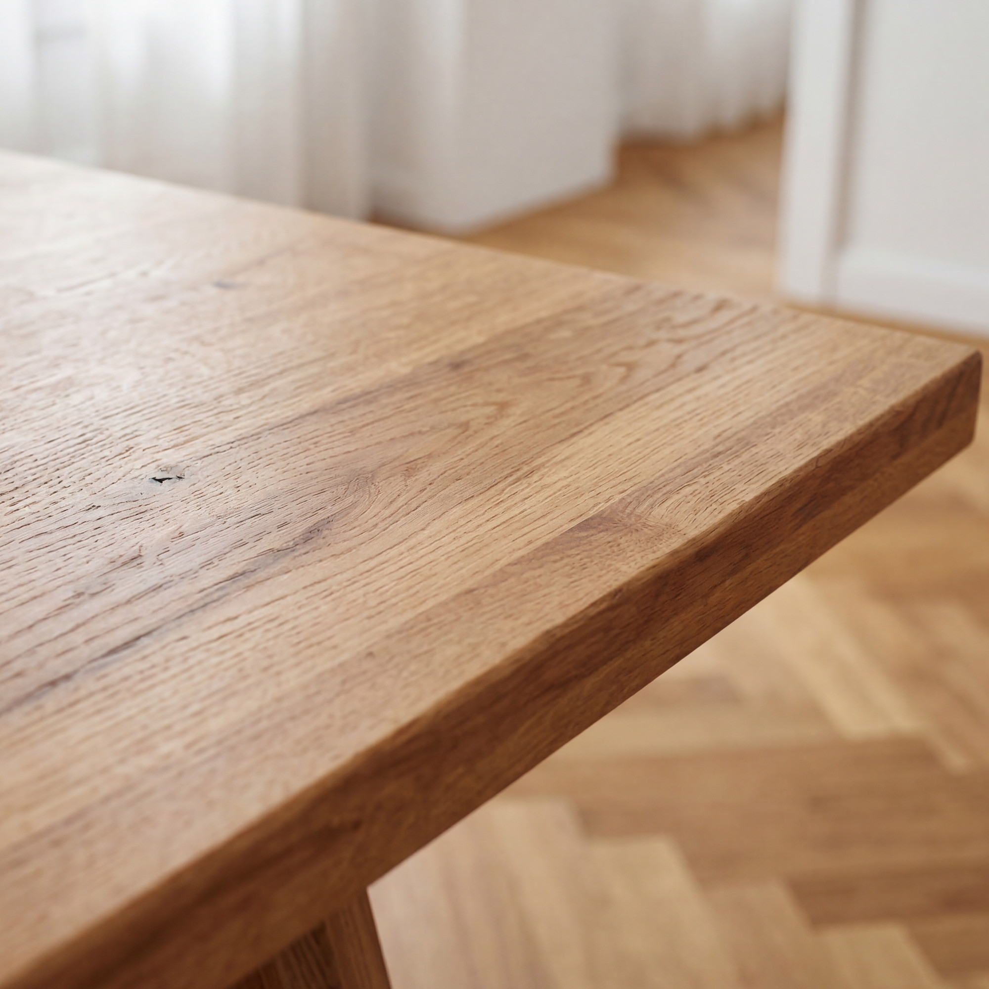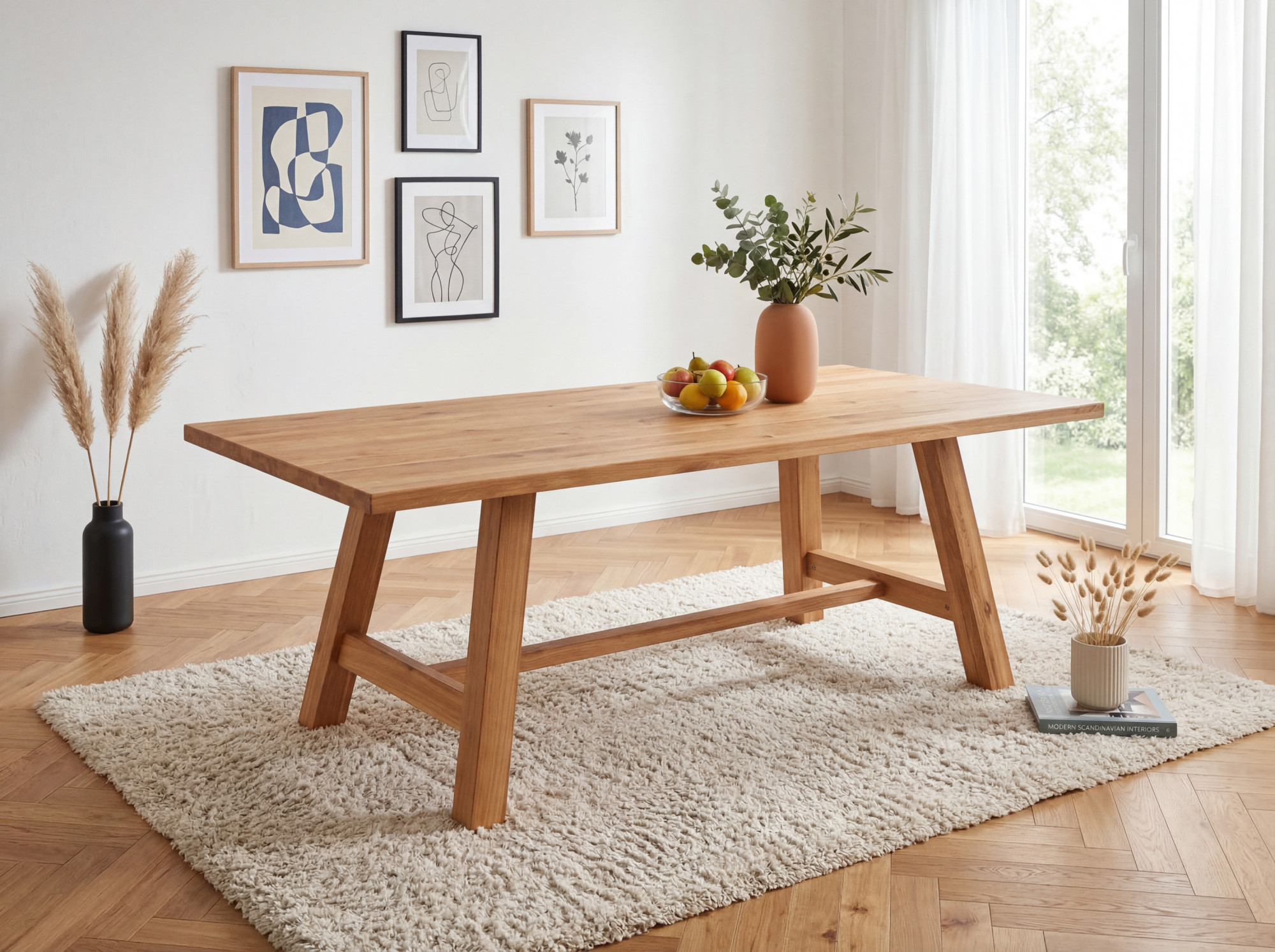 Povrch stola je ošetrený kvalitným olejom, ktorý chráni drevo a zároveň zvýrazňuje jeho prirodzenú štruktúru a teplý odtieň. Olejovaný povrch je príjemný na dotyk a ľahko sa obnovuje aj po rokoch používania. Svetlá výška stola 71,3 cm zaručuje pohodlné sedenie pri jedle aj pri práci. Vďaka rozostupu nôh 140 cm na dlhšej strane je zabezpečený dostatočný priestor pre nohy všetkých sediacich. Stôl je ideálnou voľbou do jedálne, kuchyne aj priestrannej obývačky, kde sa stane výraznou dominantou interiéru.