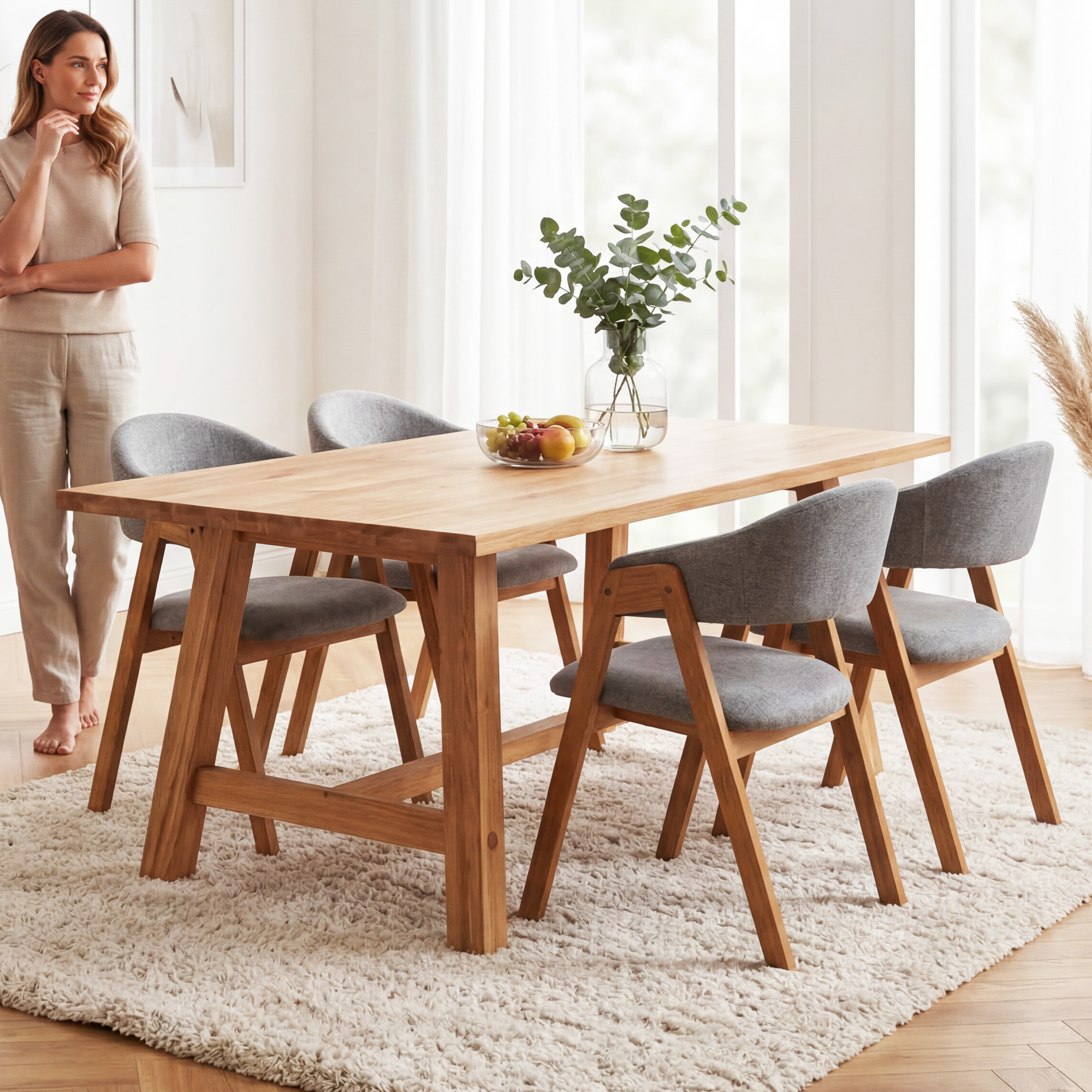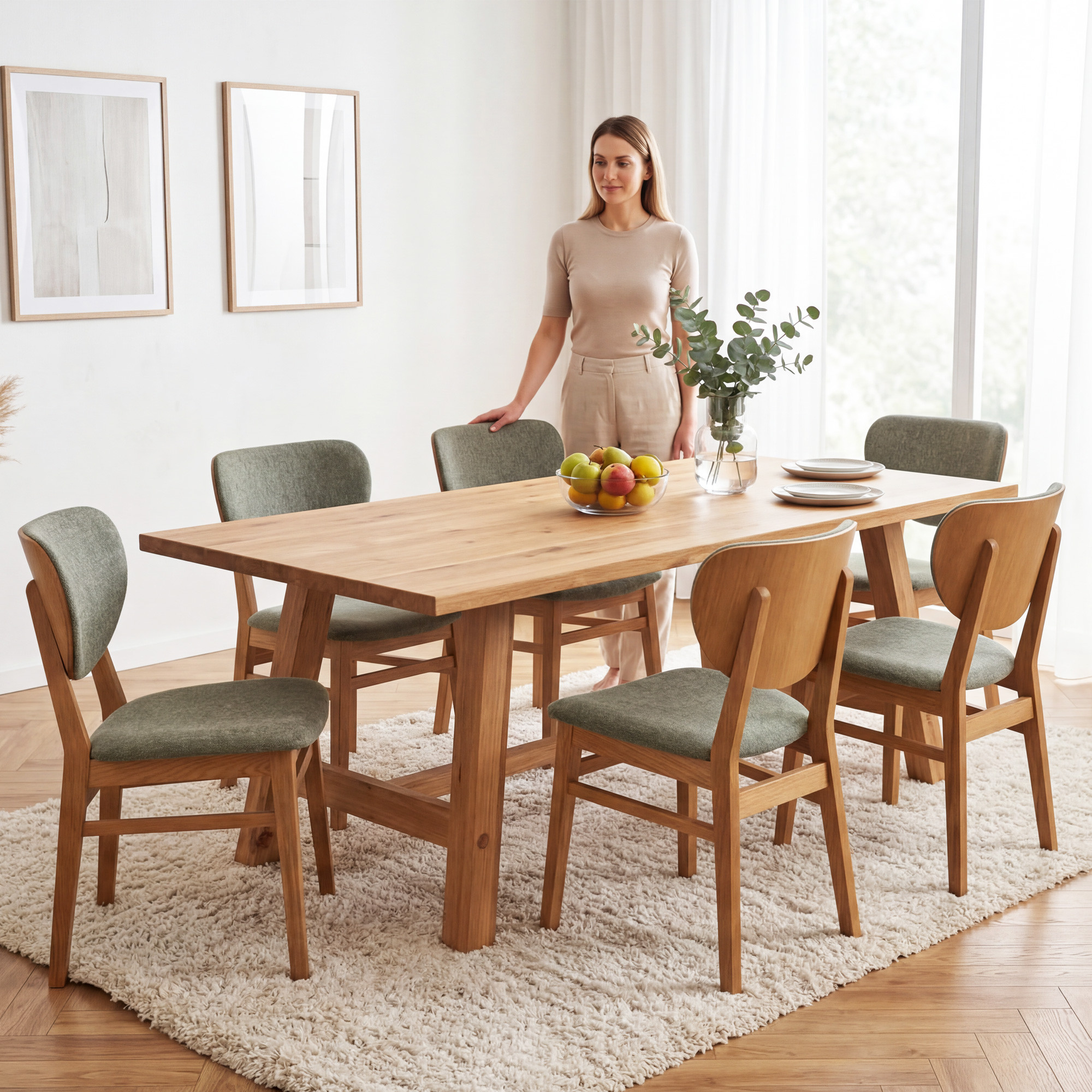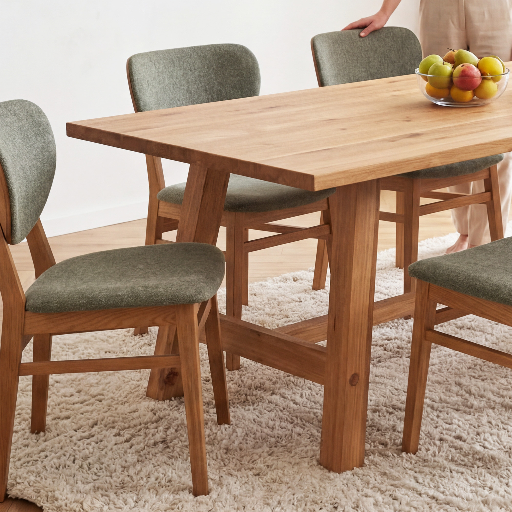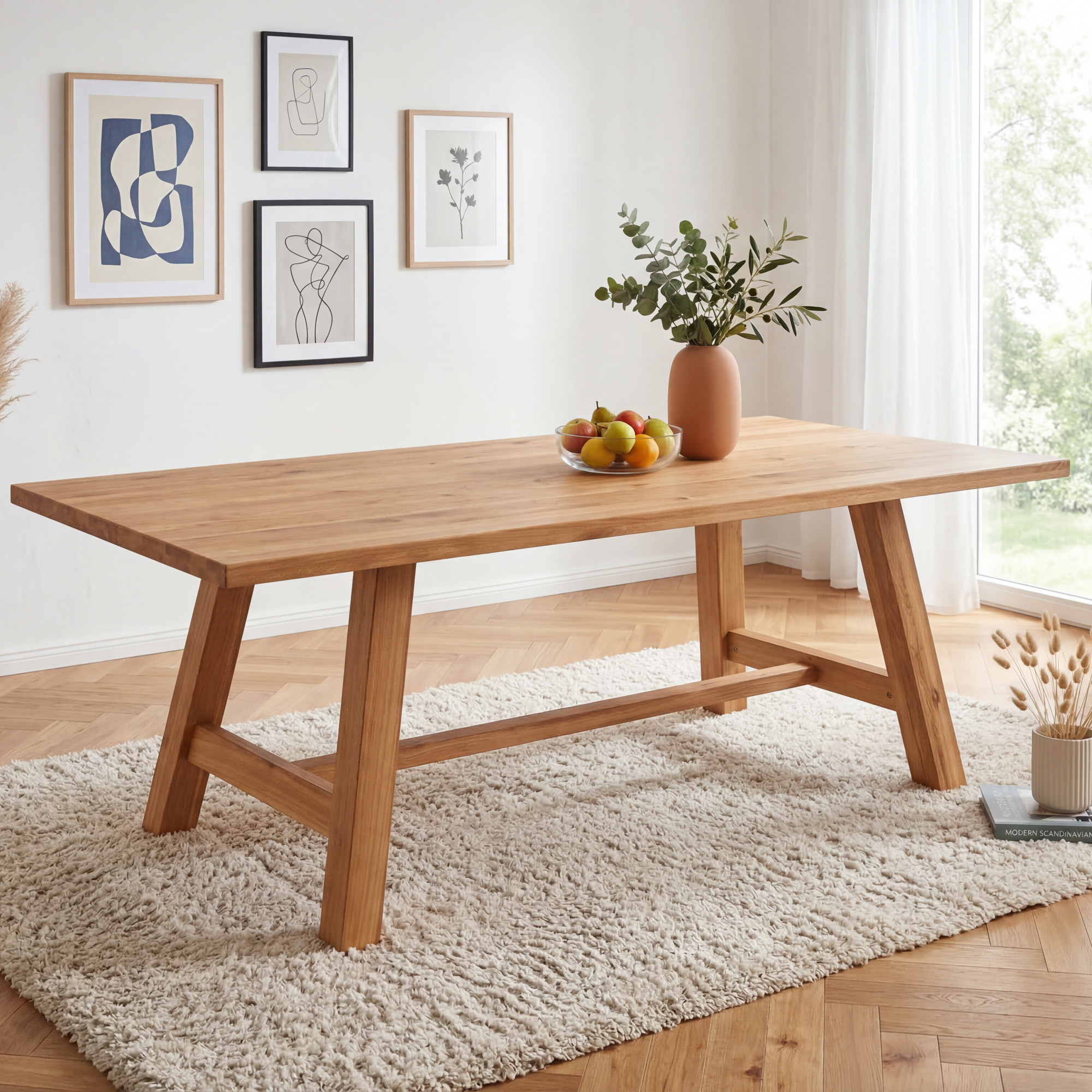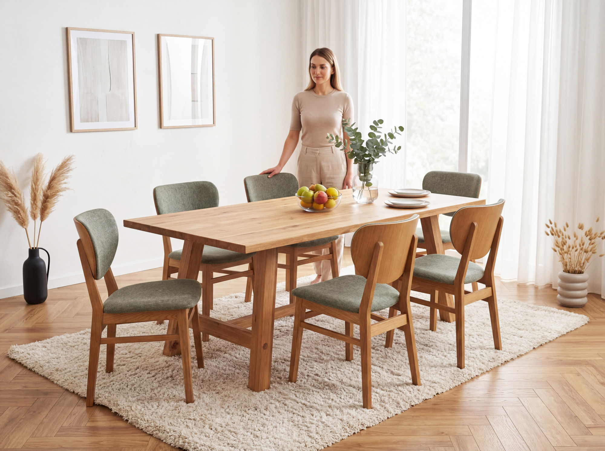 Povrch stola je ošetrený kvalitným olejom, ktorý chráni drevo a zároveň zvýrazňuje jeho prirodzenú štruktúru a teplý odtieň. Olejovaný povrch je príjemný na dotyk a ľahko sa obnovuje aj po rokoch používania. Svetlá výška stola 71,3 cm zaručuje pohodlné sedenie pri jedle aj pri práci. Vďaka rozostupu nôh 140 cm na dlhšej strane je zabezpečený dostatočný priestor pre nohy všetkých sediacich. Stôl je ideálnou voľbou do jedálne, kuchyne aj priestrannej obývačky, kde sa stane výraznou dominantou interiéru.