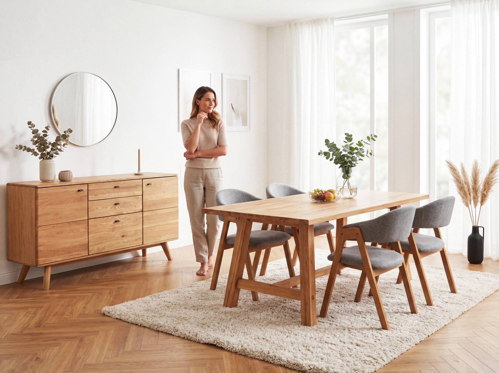 * Na obrázku dubová komoda Janošík typ 49, jedálenský stôl model Hamburg 220 x 100 cm a jedálenská stolička Arco.