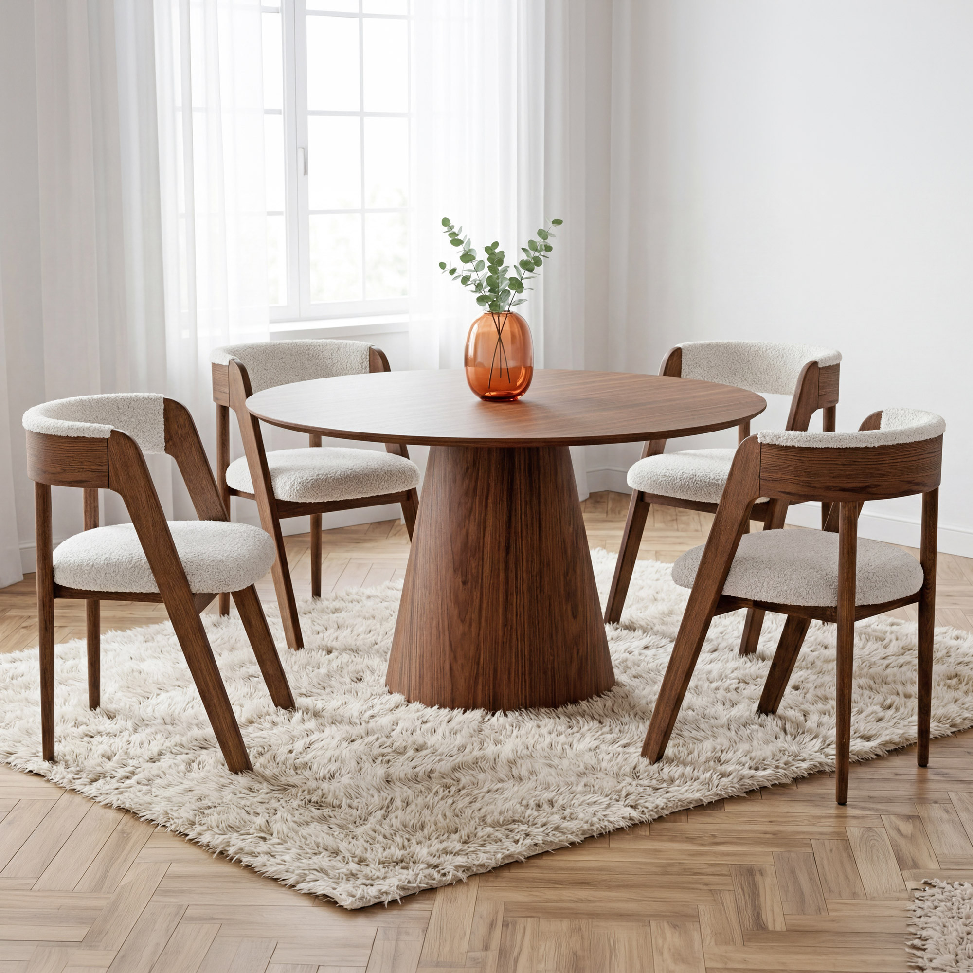 Hľadáte guľatý jedálenský stôl, ktorý sa stane výraznou dominantou vášho interiéru? Tento designový stôl s priemerom 120 cm zaujme na prvý pohľad svojou sofistikovanou farbou bordo-orech a minimalistickým tvarom. Guľatá doska stola spočíva na efektné kužeľovitej centrálnej nohe, ktorá dodáva celému kusu moderný a vzdušný charakter. Teplý orechovo-vínový odtieň vnáša do miestnosti nádych luxusu a útulnosti. Vďaka priemeru 120 cm pohodlne posadíte 4–5 osôb k spoločnému stolovaniu, bez toho aby stôl zaberali príliš miesta.