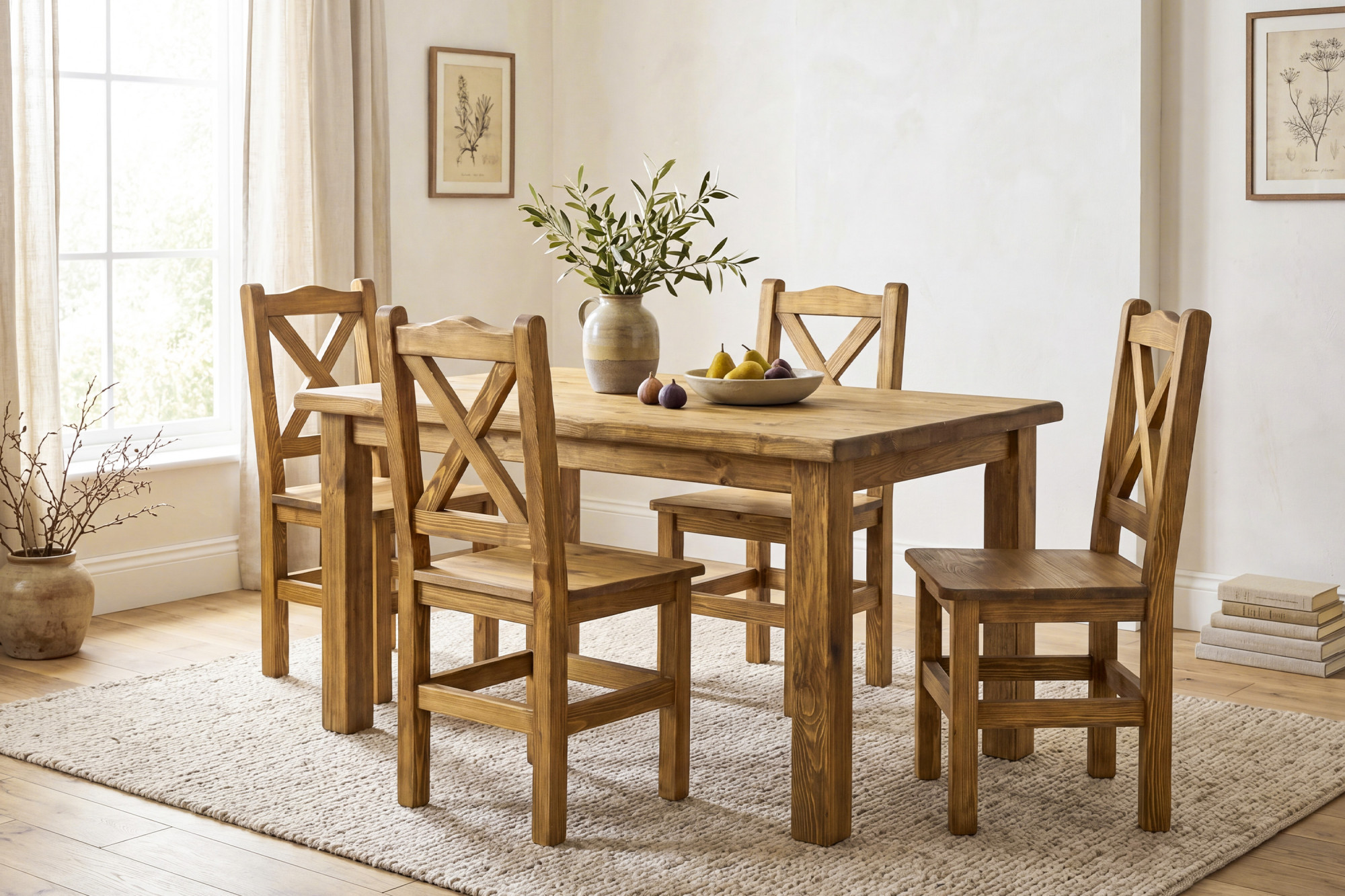 Jedálny stôl z masívu je srdcom každej jedálne. Tento model z kolekcie Venkov vyniká nielen krásnym vzhľadom, ale tiež praktickými vlastnosťami pre každodenný život. Vďaka pevnej konštrukcii, silnej vrchnej doske a stabilným nohám je vhodný pre bežné rodinné stolovanie aj príležitostné stretnutia s priateľmi. Medový voskovaný povrch dodáva nábytku útulný charakter a zároveň podčiarkuje krásu prírodného dreva, vďaka čomu každý kus pôsobí originálne.
