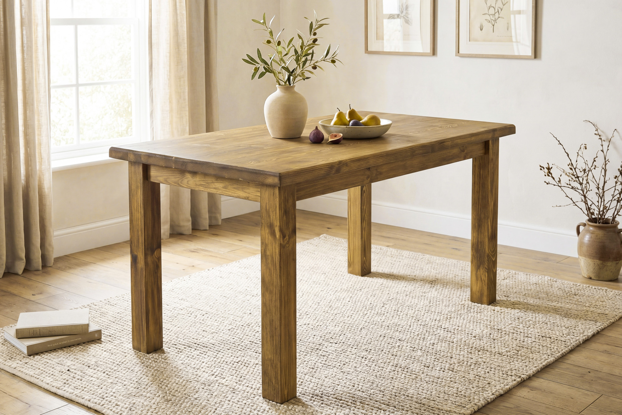Stôl je vyrobený z kvalitného masívneho borovicového dreva, ktoré vyniká pevnosťou, dlhou životnosťou a krásnou kresbou. Dominantou je vrchná doska s hrúbkou až 4 cm, ktorá dodáva stolu mimoriadne pevný vzhľad a vysokú odolnosť pri každodennom používaní. Povrch je ošetrený ekologicky nezávadným voskom v medovom odtieni, ktorý je príjemný na dotyk, zvýrazňuje prirodzenú štruktúru dreva a chráni povrch pred bežnými nehodami, ako je napríklad rozliatie tekutín. Pod horúce nádoby však odporúčame používať podložky.
