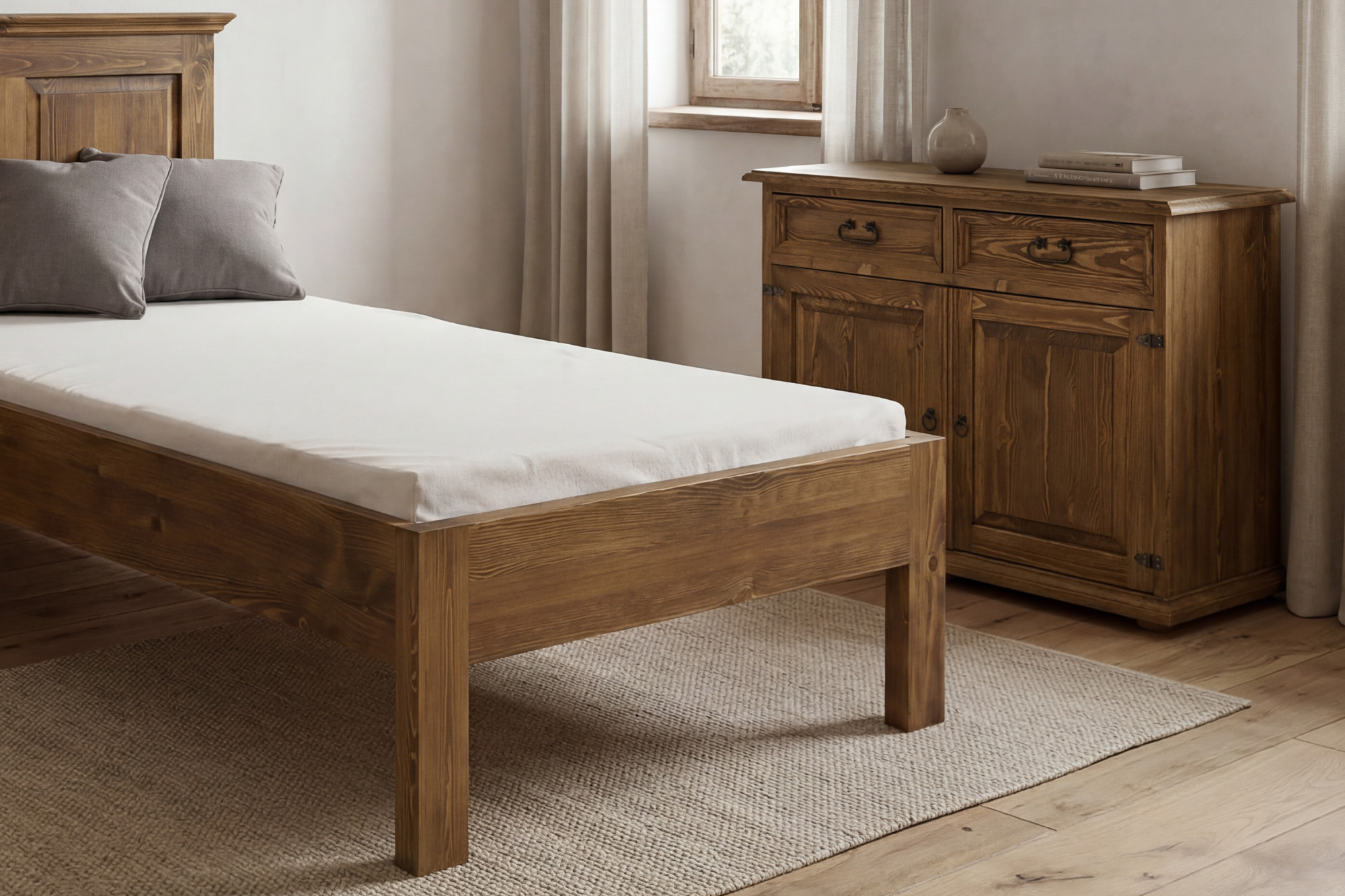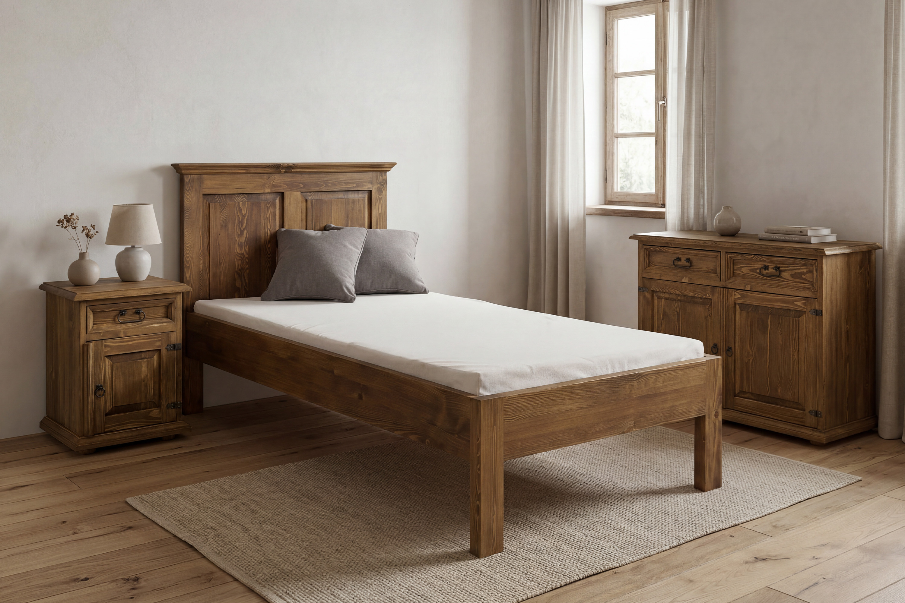 * Na obrázku jednolôžková rustikálna posteľ 90 x 200 cm z masívnej borovice a Nočný stolík vidiecky štýl a Rustikálna komoda do spálne