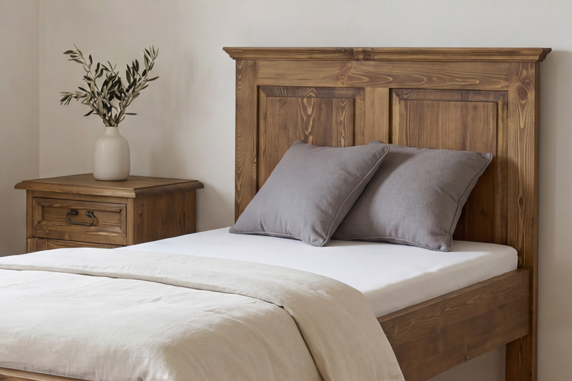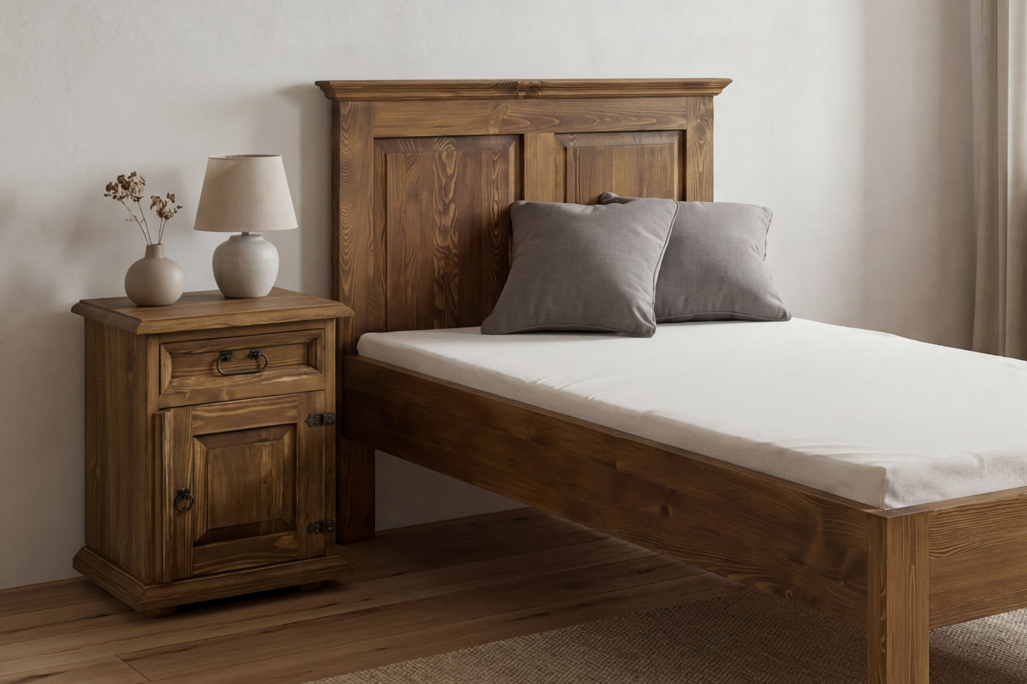 * Na obrázku jednolôžková rustikálna posteľ 90 x 200 cm z masívnej borovice a Nočný stolík vidiecky štýl
