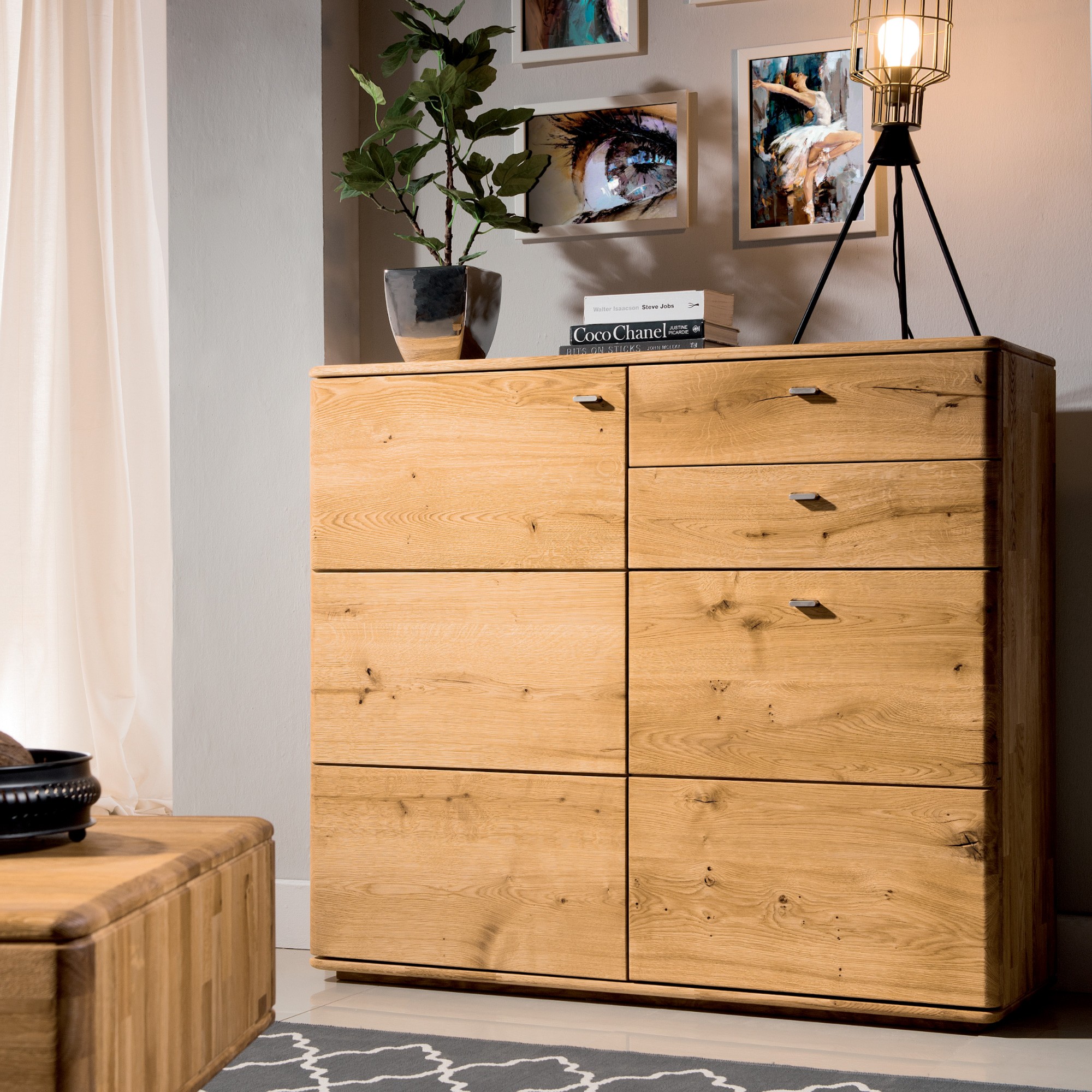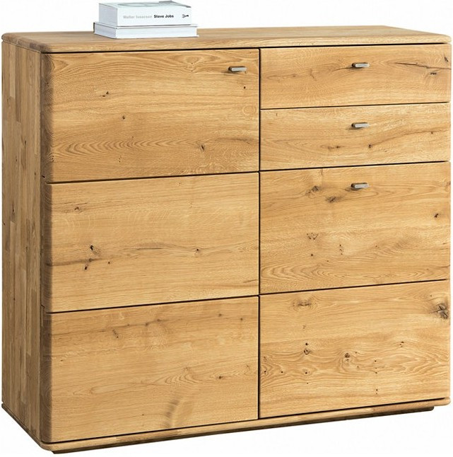 Komoda Texas vás zaujme svojim dizajnovým spracovaním. Prírodné dubové drevo si môžete vybrať z dvoch farebných variantov. Výrobcovia úmyselne ponechali na komode prírodné nedokonalosti, ako sú suky a praskliny, čím podčiarkli autentickosť prírodného spracovania. Okrem pekného vzhľadu komoda svojim užívateľom ponúka aj dostatočne veľkú hornú odkladaciu plochu a množstvo úložného priestoru vo forme zásuviek a skrinkovej časti. S komodou si budete rozumieť, bez pochýb.