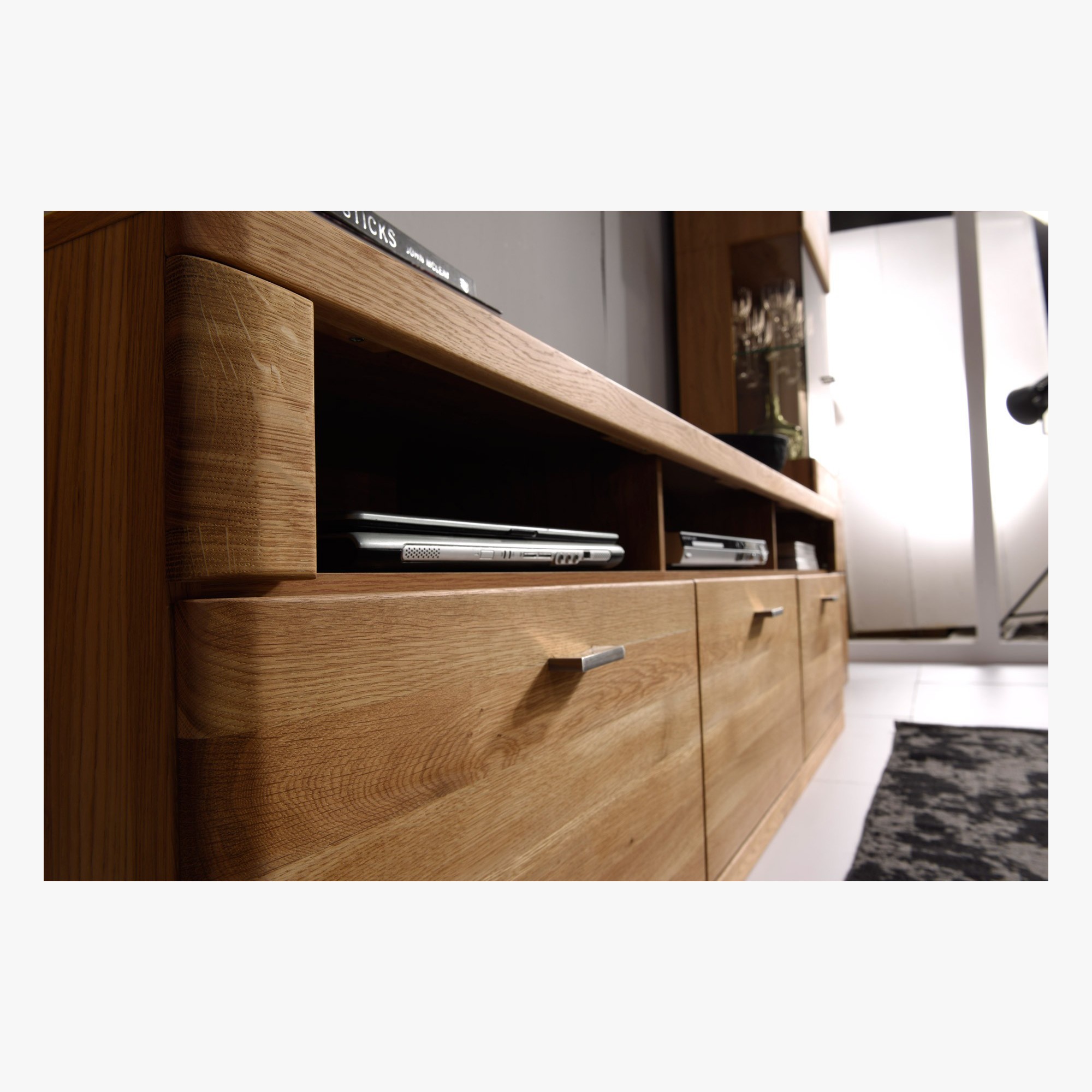 Nadčasový nábytok vyrobený v kombinácii z prírodného dubového dreva a prírodnej dubovej dyhy. Nábytok je určený do obývacej izby a jedálne. Nábytok má nadčasový dizajn, je ošetrený prírodným olejom. V kolekcii nábytku Boston nájdete TV komodu v dvoch dĺžkach, presklenú vitrínu, konferenčný stolík, rovnako dizajnovú komodu. Nábytok sa dodáva už zložený bez osvetlenia, za príplatok je možné si osvetlenie dokúpiť. Predné čelá komody a dvierok sú dubové drevo, vrchná doska - bočné výplne korpusu sú prírodná dubová dyha.
