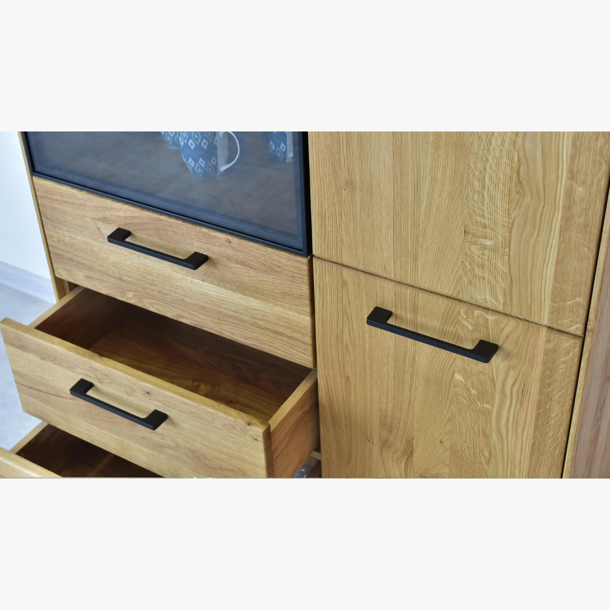 Vysoká dubová komoda so sklom vyrobeným v štýle Loft, určená do moderného interiéru. Komoda so sklom je postavená na čiernych kovových nožičkách a pôsobí tak industriálnym dojmom. Práve spojenie kovu a dreva je mimoriadne atraktívne. Komoda sa dodáva už zmontovaná. Osvetlenie nie je súčasťou, no je možné si ho za príplatok kúpiť. Nábytok je vyrobený najmodernejšími CNC strojmi, čo zaručuje najvyššiu kvalitu. Prezrite si všetky druhy a modely z kolekcie Lagos.