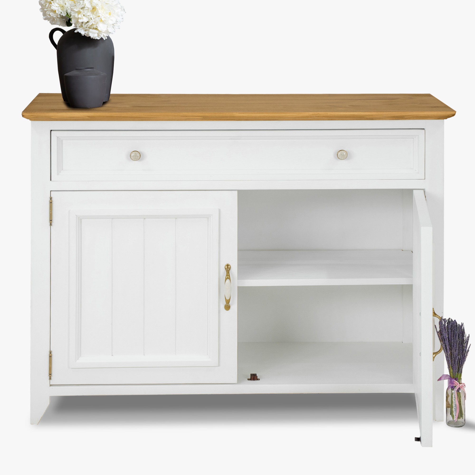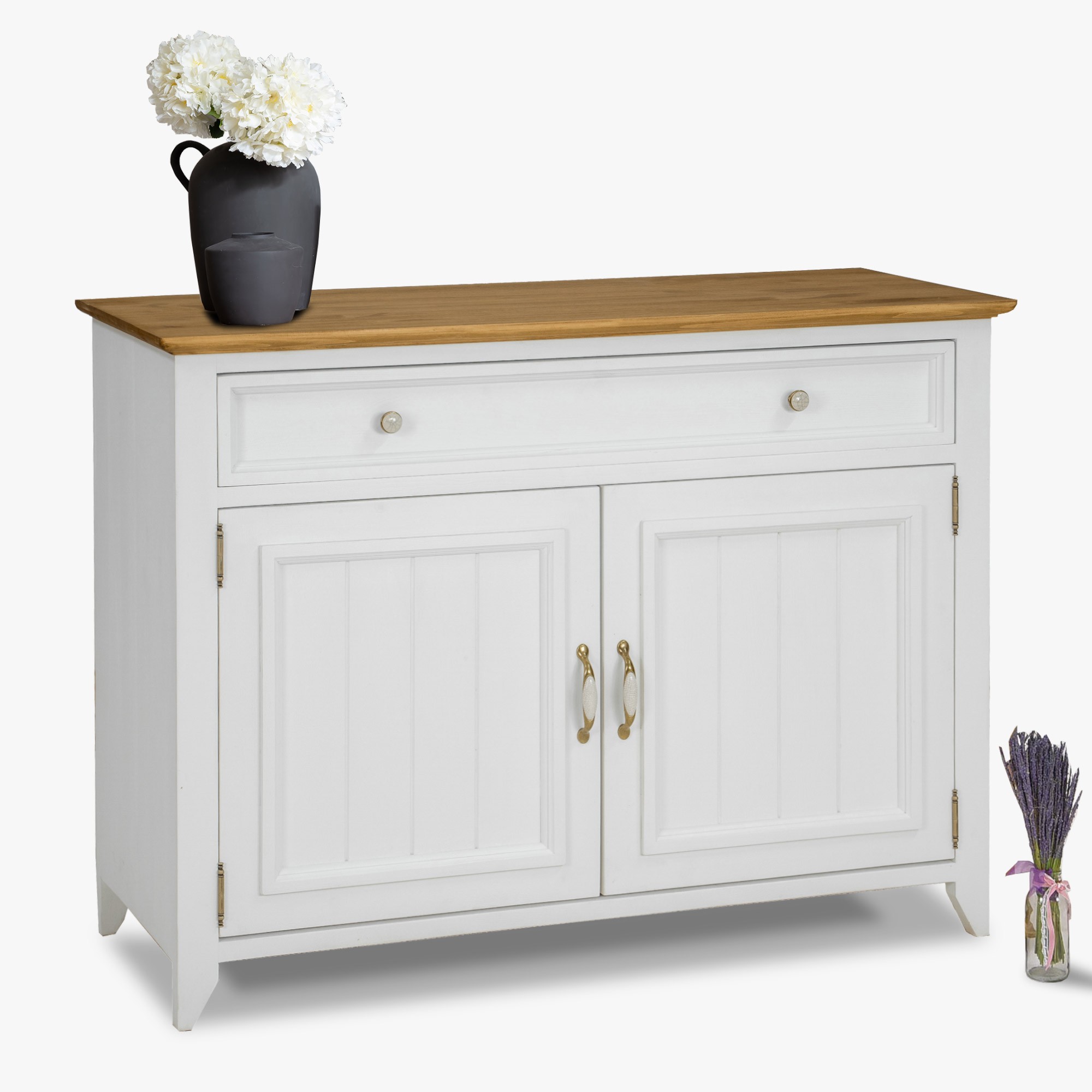 Prírodná komoda vyrobená v provensálskom štýle v bielo hnedej farebnej kombinácii vyrobená z čistého borovicového dreva. Atraktívny vzhľad komody, ktorý imituje francúzsku vidiek. Komoda je vhodná do spálne, pracovne aj jedálne. Komoda má v hornej časti 1 zásuvku, v spodnej časti sú otváracie dvierka, kde vo vnútornej časti sa nachádza drevená polica. Komoda sa dodáva už zmontovaná. Rozšírte svoj interiér o tento atraktívny kúsok a prežívajte denne silu prírodného nábytku. Ekológia prírodného produktu a harmónia nádherného dizajnu sú vlastnosti, ktoré sme spojili pri výrobe komody LILLE.