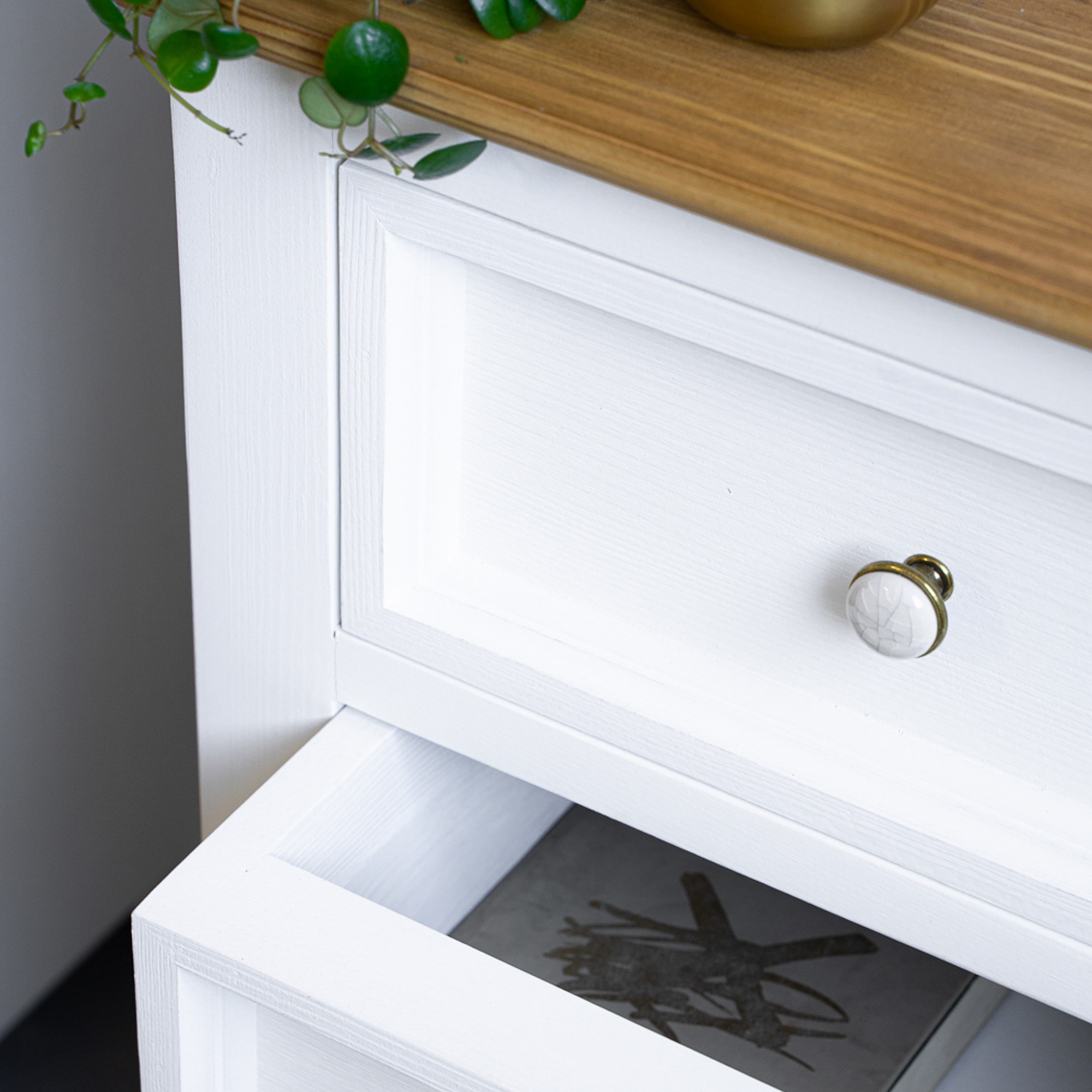 Hnedé časti na nábytku sú ošetrené prírodným včelím voskom výborným na údržbu. Biele časti nábytku sú ošetrené farbou na vodnej báze, kde je jemne vidieť štruktúru dreva.