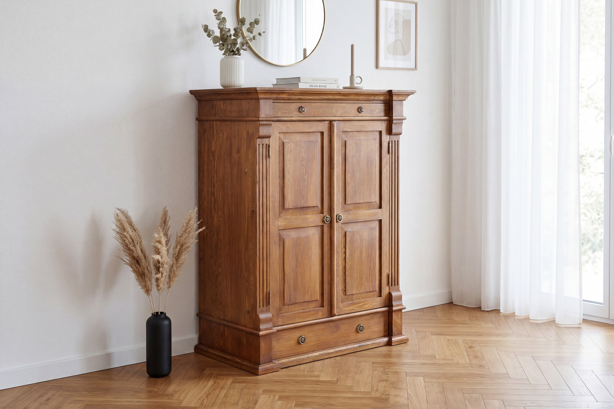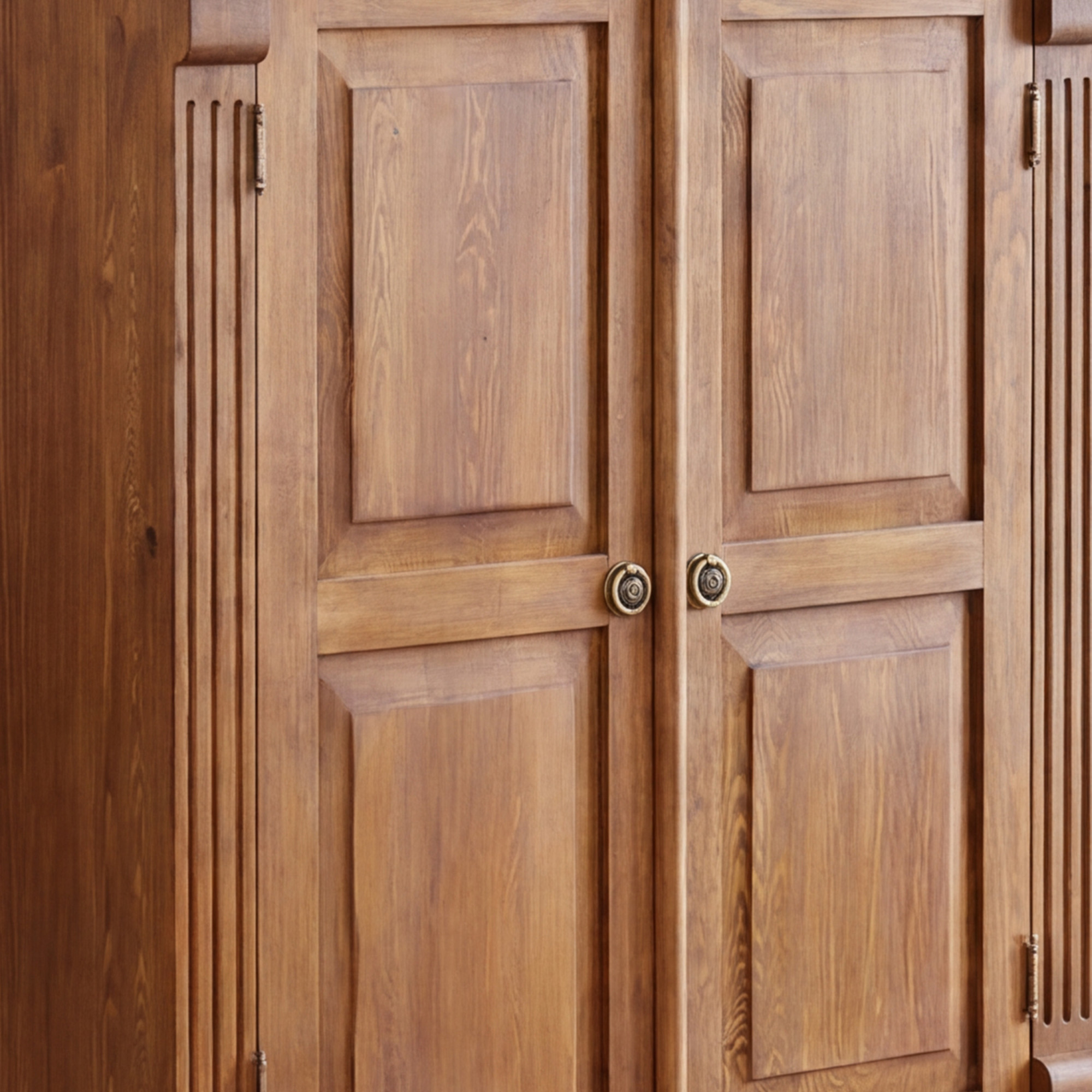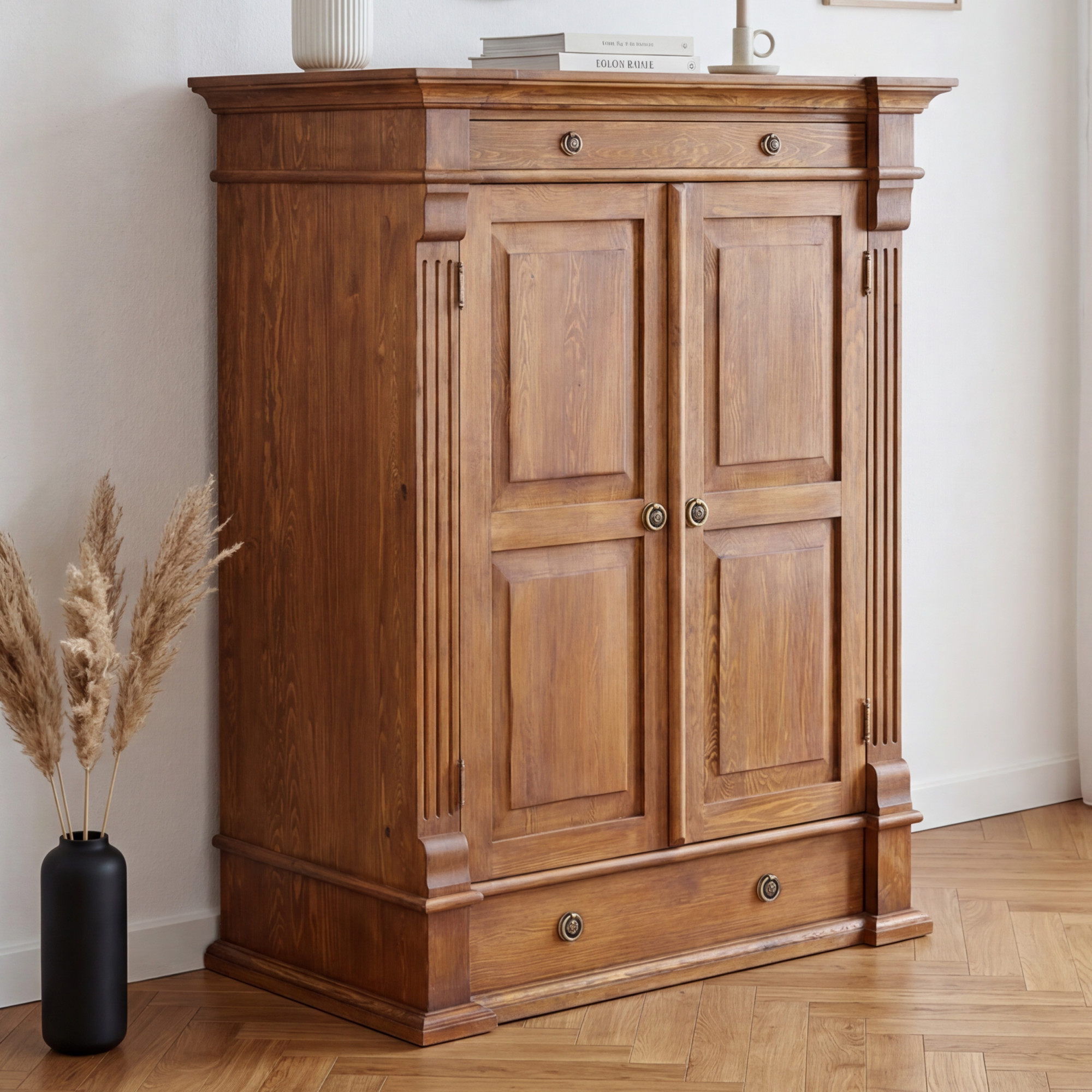 Prádelník ponúka rozmery 113 cm na šírku, 145 cm na výšku a 49 cm do hĺbky, takže poskytuje dostatok úložného priestoru bez zbytočne veľkých nárokov na miesto. Vo vnútri nájdete 2 zásuvky bez pojazdov a 2 dvierka s drevenou policou, čo umožňuje prehľadné usporiadanie oblečenia, posteľnej bielizne, doplnkov i ďalších domácich potrieb. Celkový vzhľad dopĺňajú talianske úchyty Bosetti Marella a staro mosadzné zapustené pánty, ktoré podčiarkujú rustikálny a elegantný charakter nábytku.