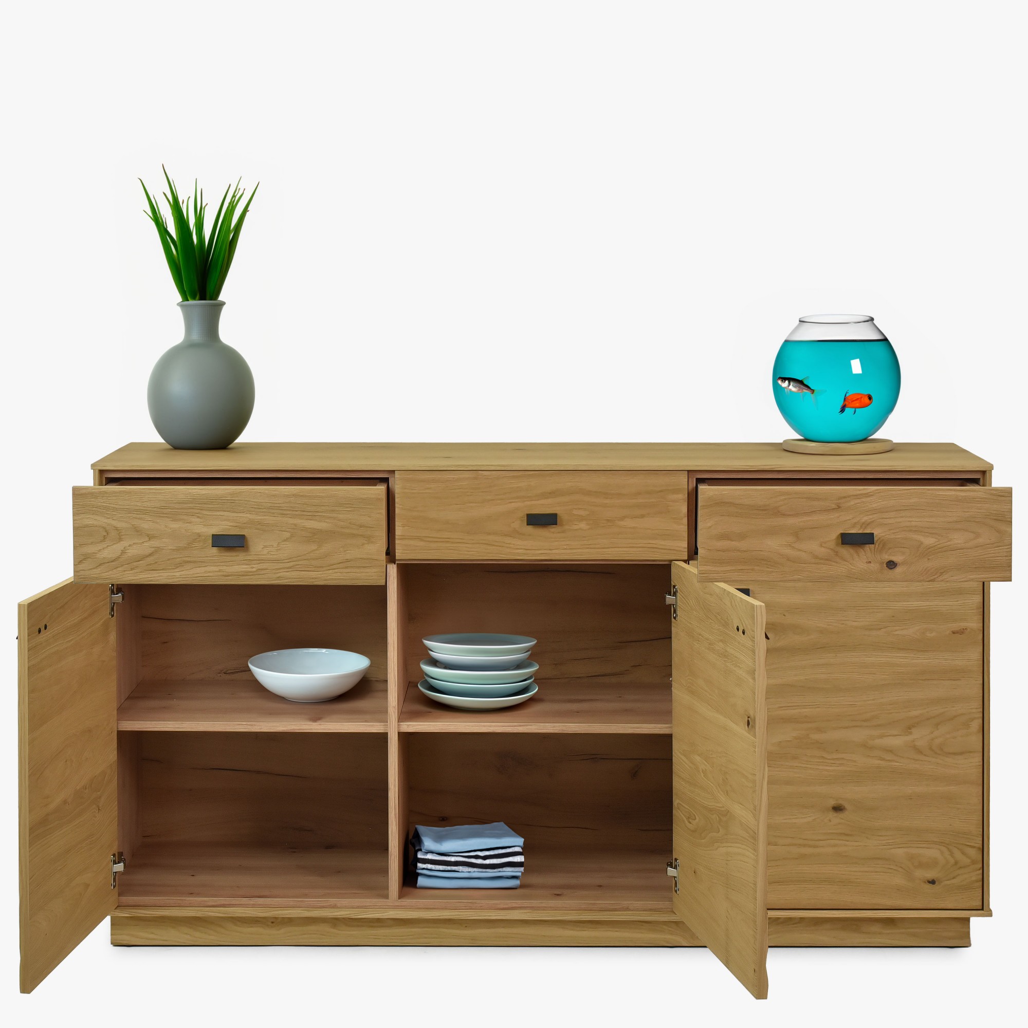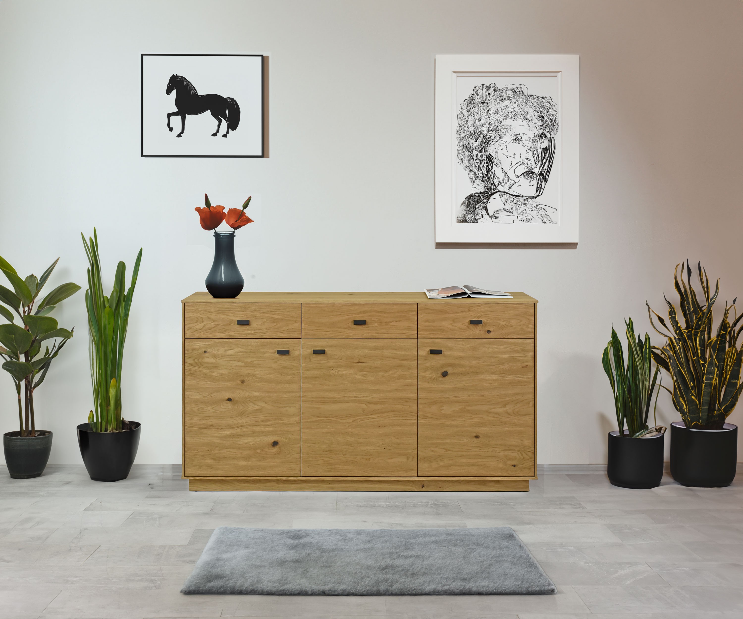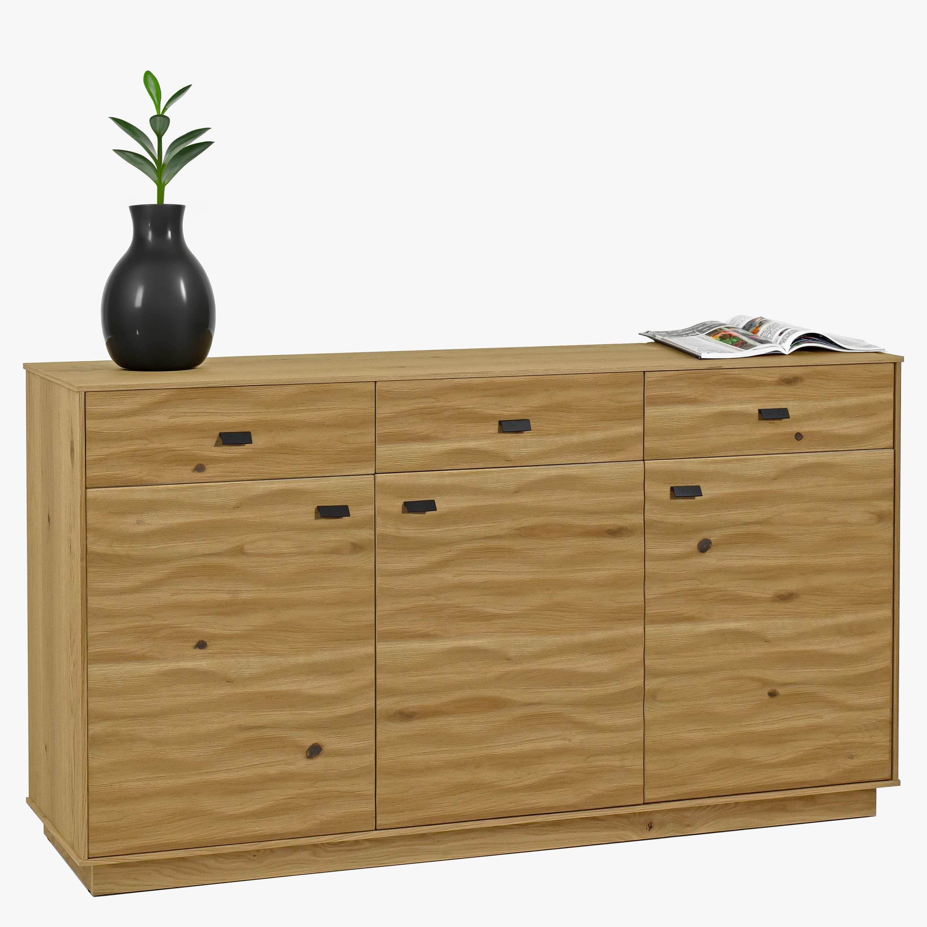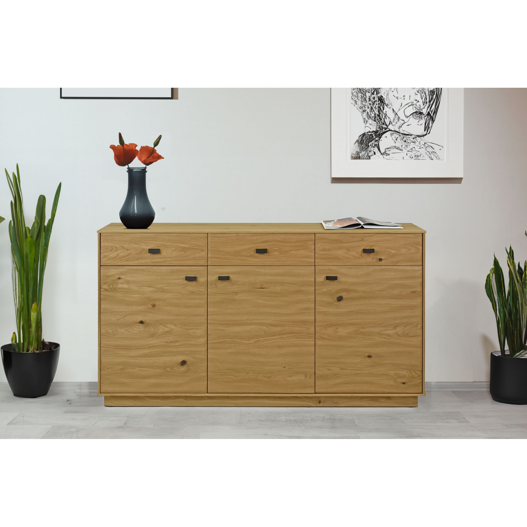 Komoda zo série nábytku Oslo - dokonalý kúsok nábytku pre Vašu spálňu, pracovňu alebo jedáleň. Táto elegantná komoda disponuje 3 dvierkami a 3 zásuvkami, ktoré Vám poskytnú dostatok úložného priestoru a udržia Váš domov dobre usporiadaný. Samozrejmosťou je zatváranie soft-close. Komoda je vyrobená z kvalitnej prírodnej dubovej dyhy, ktorá pokrýva všetky viditeľné časti nábytku - predné časti, boky a vrch. Tento prírodný materiál pridá do každej miestnosti teplú a prirodzenú atmosféru. Vnútorný korpus je vyrobený z imitácie dreva fólie v farbe dubu, čo zaisťuje nielen estetický vzhľad, ale aj odolnosť a trvácnosť.