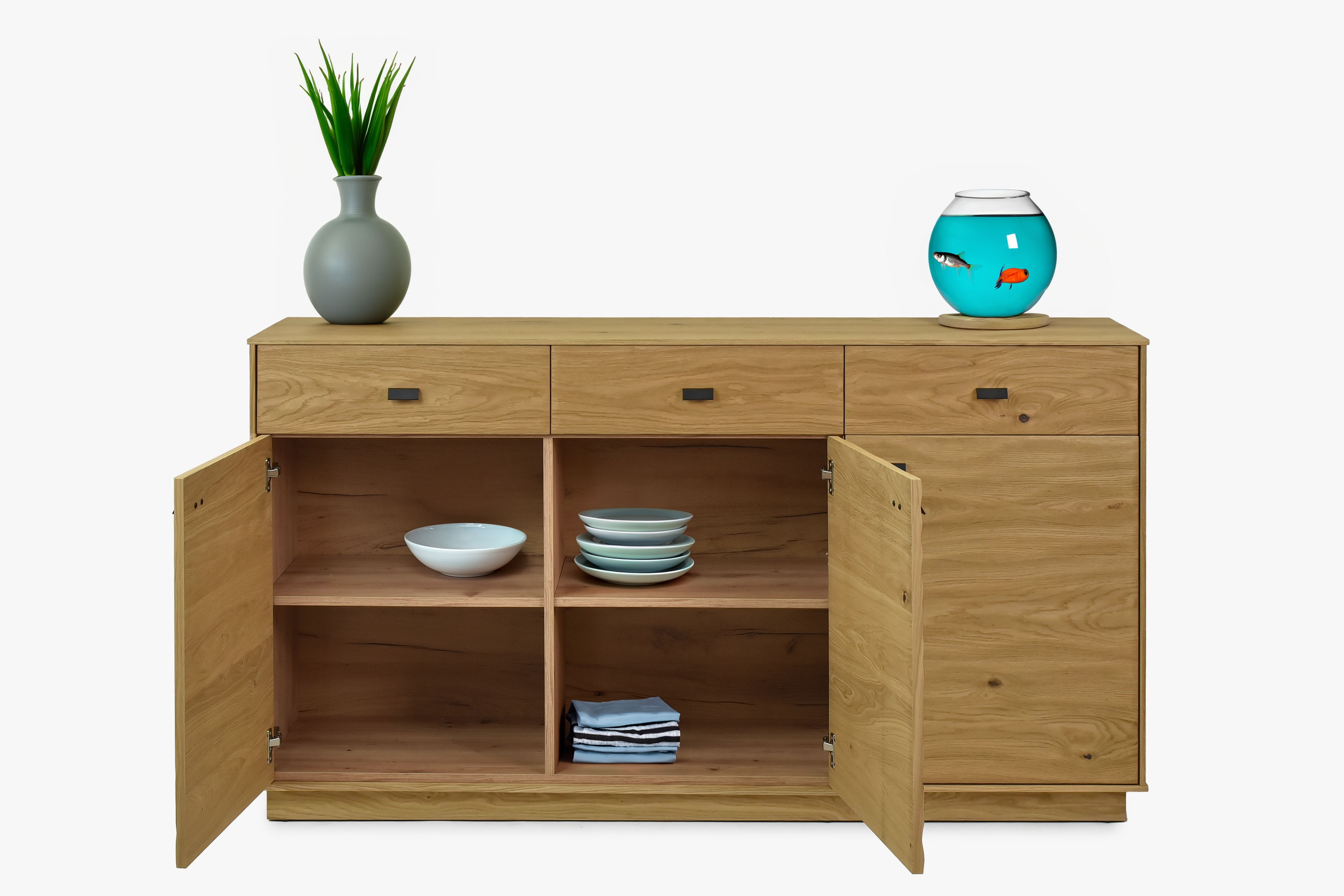 Vnútorný korpus nábytku je vyrobený z imitácie dreva v farbe dubu, čím zaisťujeme pevnosť a trvácnosť nábytku. Imitácia fólie má esteticky príjemný vzhľad, ktorý sa dokonale spája s prírodnými prvkami prednej časti. Pre zvýraznenie krásy dreva a zároveň ochranu povrchu sme použili značkový matný lak. Táto povrchová úprava dodáva nábytku Oslo dlhodobú ochranu pred bežnými známkami používania a zároveň podčiarkuje jedinečnú štruktúru dreva.