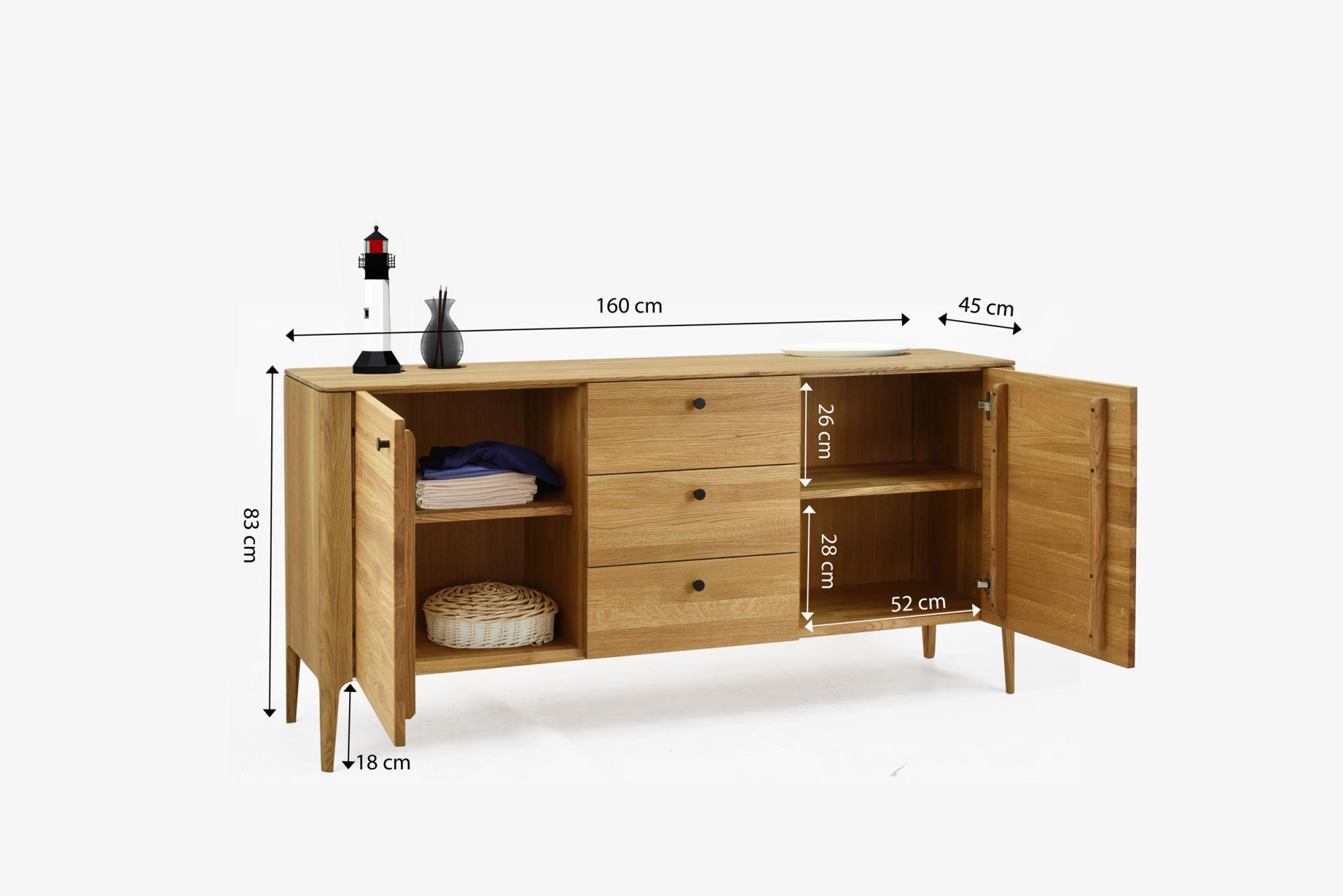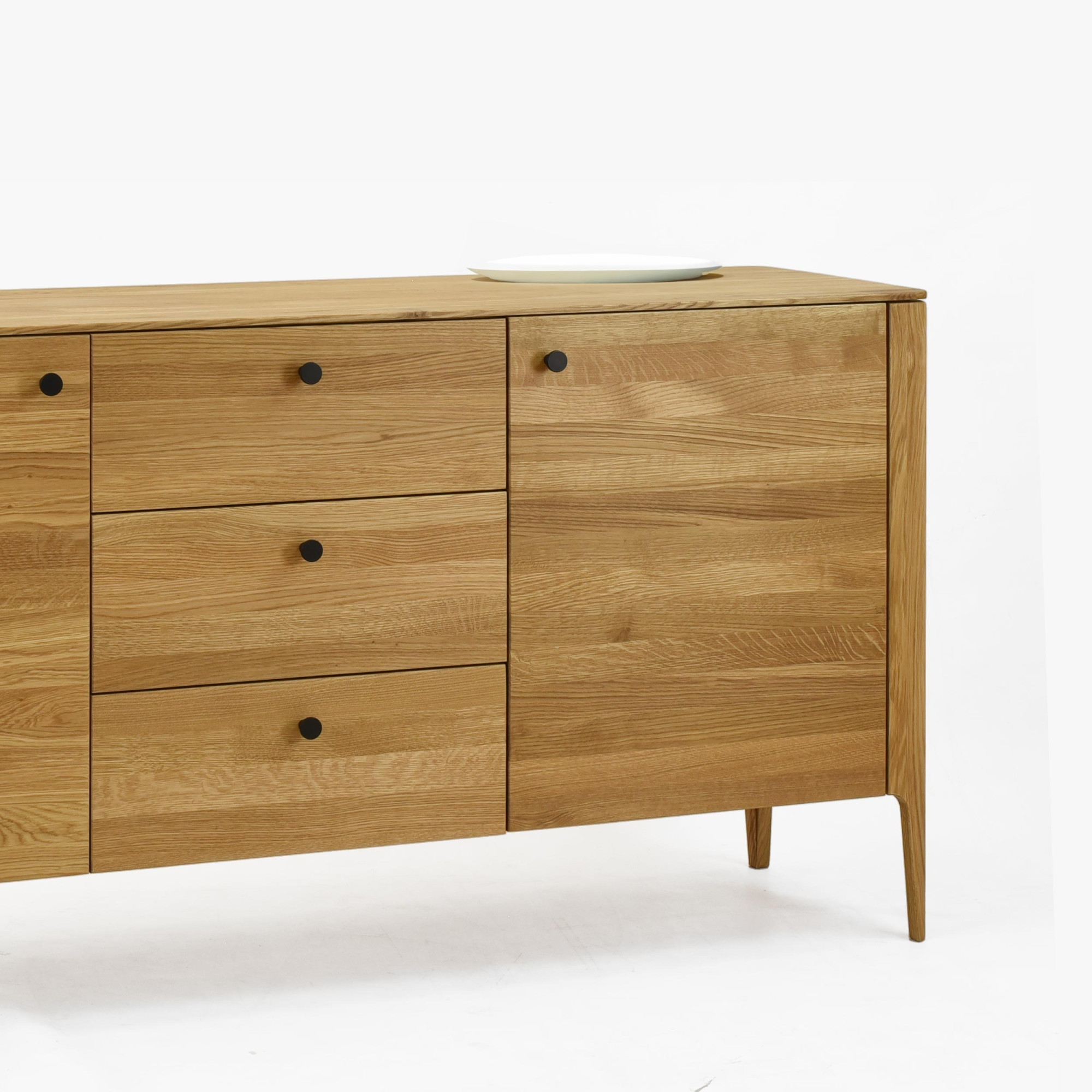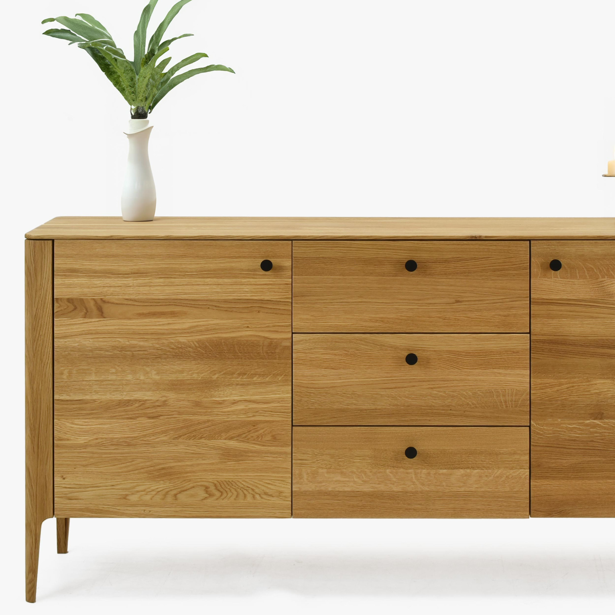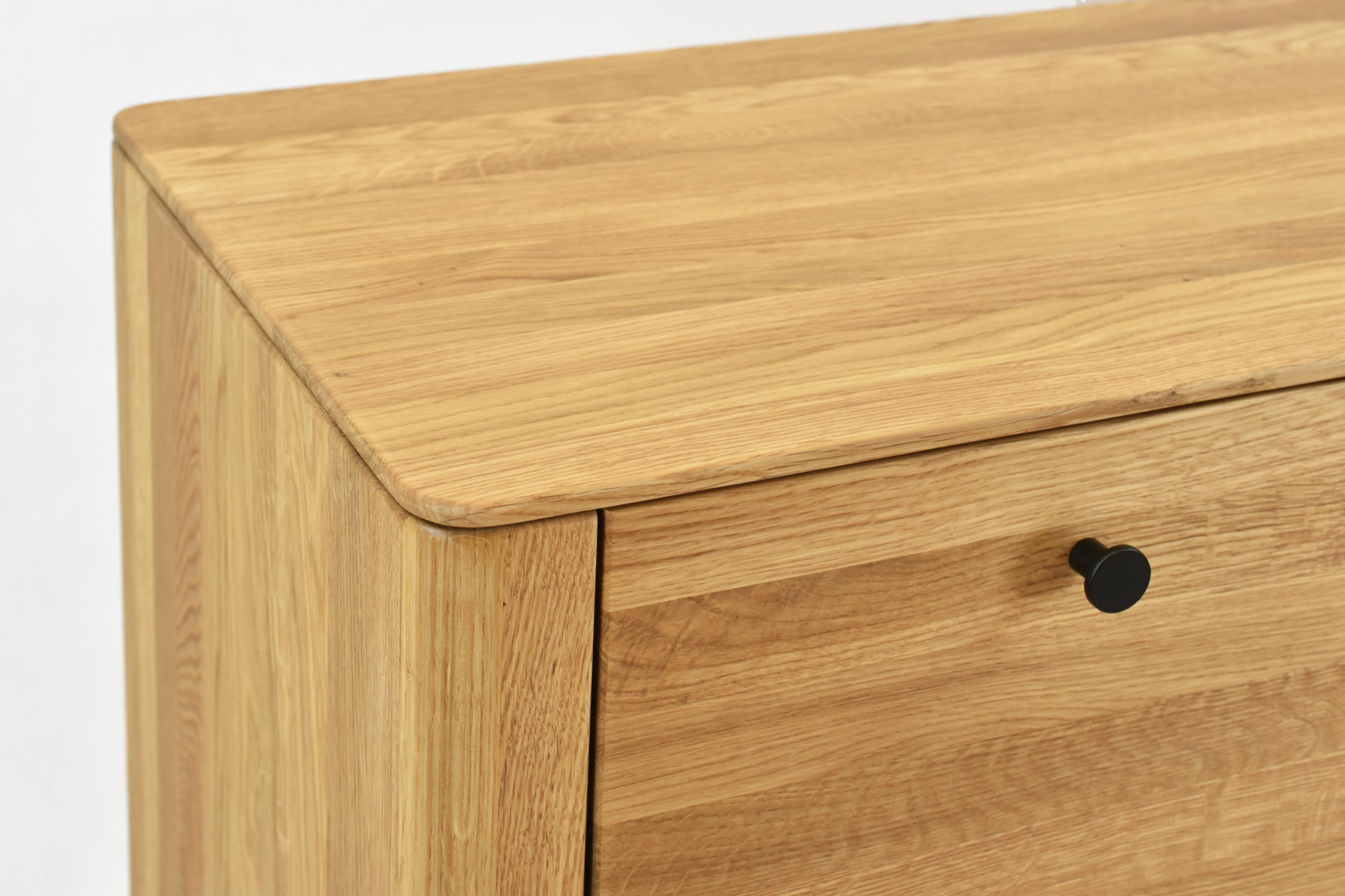 TV komoda je veľmi praktická vďaka svojmu usporiadaniu. Disponuje dvomi dvierkami a tromi priestrannými zásuvkami, ktoré poskytujú dostatok úložného priestoru pre vaše elektronické zariadenia, knihy, dekorácie a ďalšie nevyhnutnosti. Všetky zásuvky a dvierka sú vybavené tichým zatváraním soft-close, čo zaisťuje hladký a tichý chod, a tým predlžuje životnosť nábytku. Povrch komody je ošetrený kvalitným talianskym olejom Borma Wachs v farbe dub natural, čo zvýrazňuje prirodzenú štruktúru dreva a poskytuje ochranu proti vonkajším vplyvom.